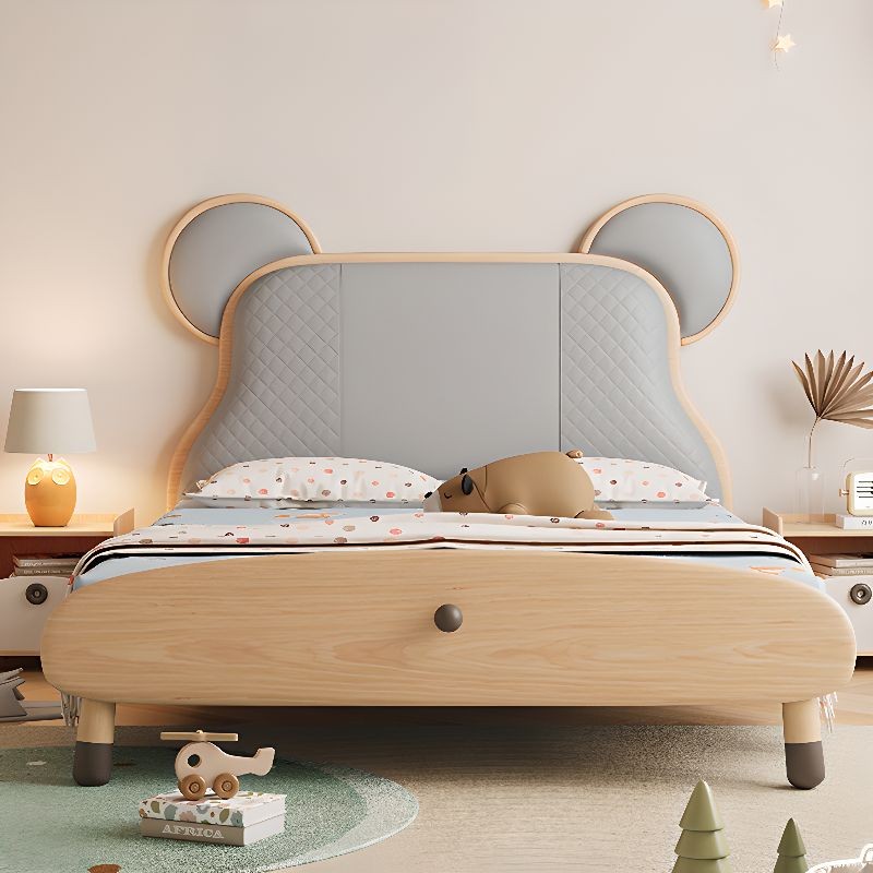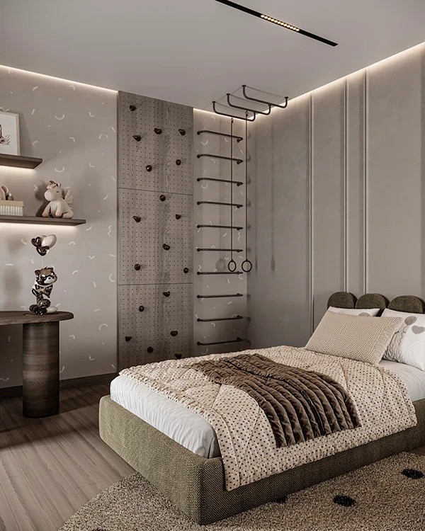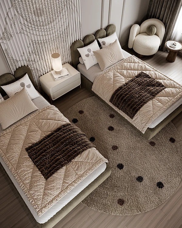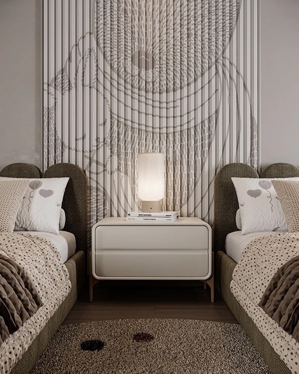 كل سرير بقاعدة منخفضة مبطنة بالكامل بقماش فاخر باللون الأخضر مع تفاصيل دقيقة، بتصميم مستطيل يعتمد على خطوط مستقيمة تعكس طابعًا حديثًا. رأس السرير مبطن بنفس القماش ويتميز بشكل موجات متدرجة تضيف لمسة زخرفية طفولية رقيقة، مع هيكل متين يوازن بين الراحة والجمالية.