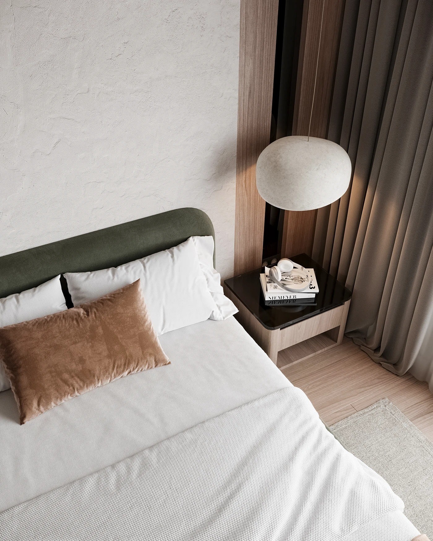 السرير: بتصميم مبطن بقماش أخضر هادئ يغطي القاعدة والرأس بانسيابية. الرأس مستطيل بزوايا منحنية ناعمة، والقاعدة منخفضة بخطوط مستقيمة تمنح مظهرًا عصريًا متناسقًا.