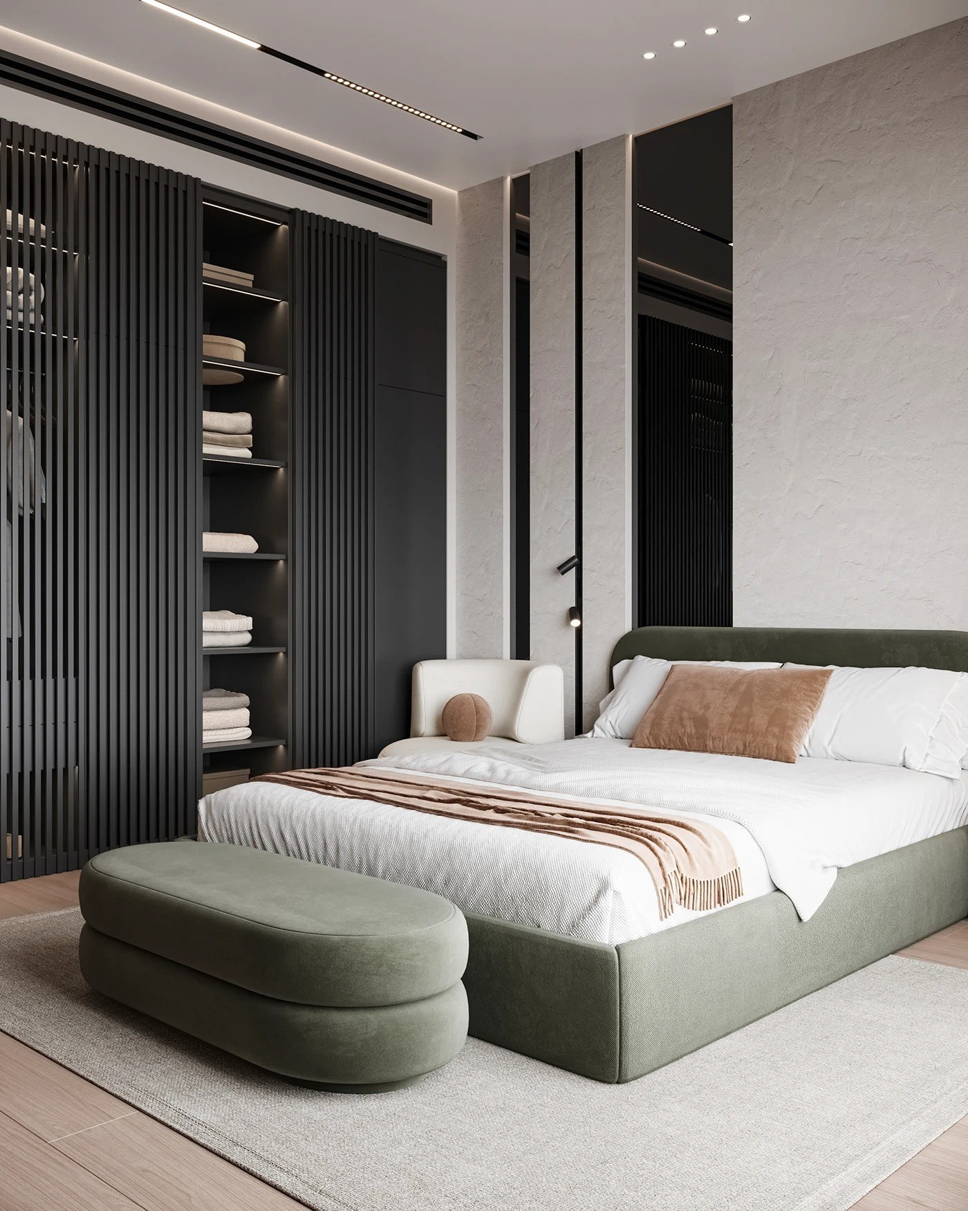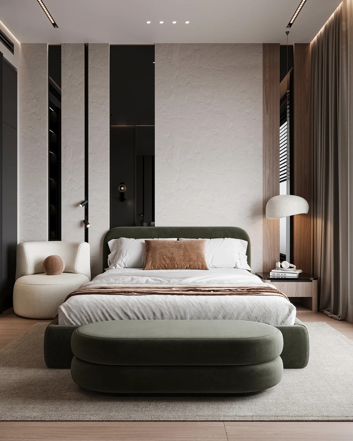 البانكيت: أمام السرير، مستطيل مبطن بنفس القماش الأخضر، بحواف ناعمة وتصميم بسيط يضيف راحة وتناسقًا بصريًا.