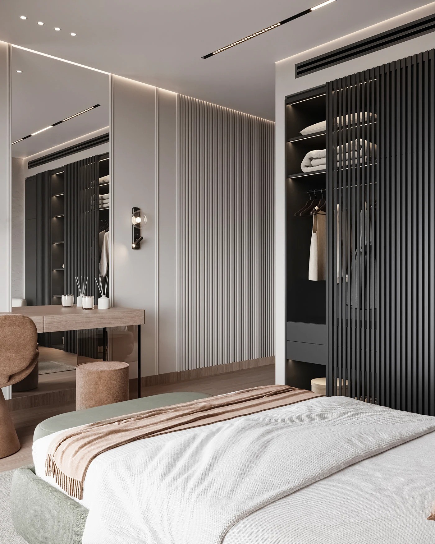 الدولاب: بتصميم منزلق أنيق بلون أسود، مزود بشرائح رأسية وإضاءة داخلية، مع تقسيم عملي للأرفف يعكس التوازن بين الجمال والوظيفة.