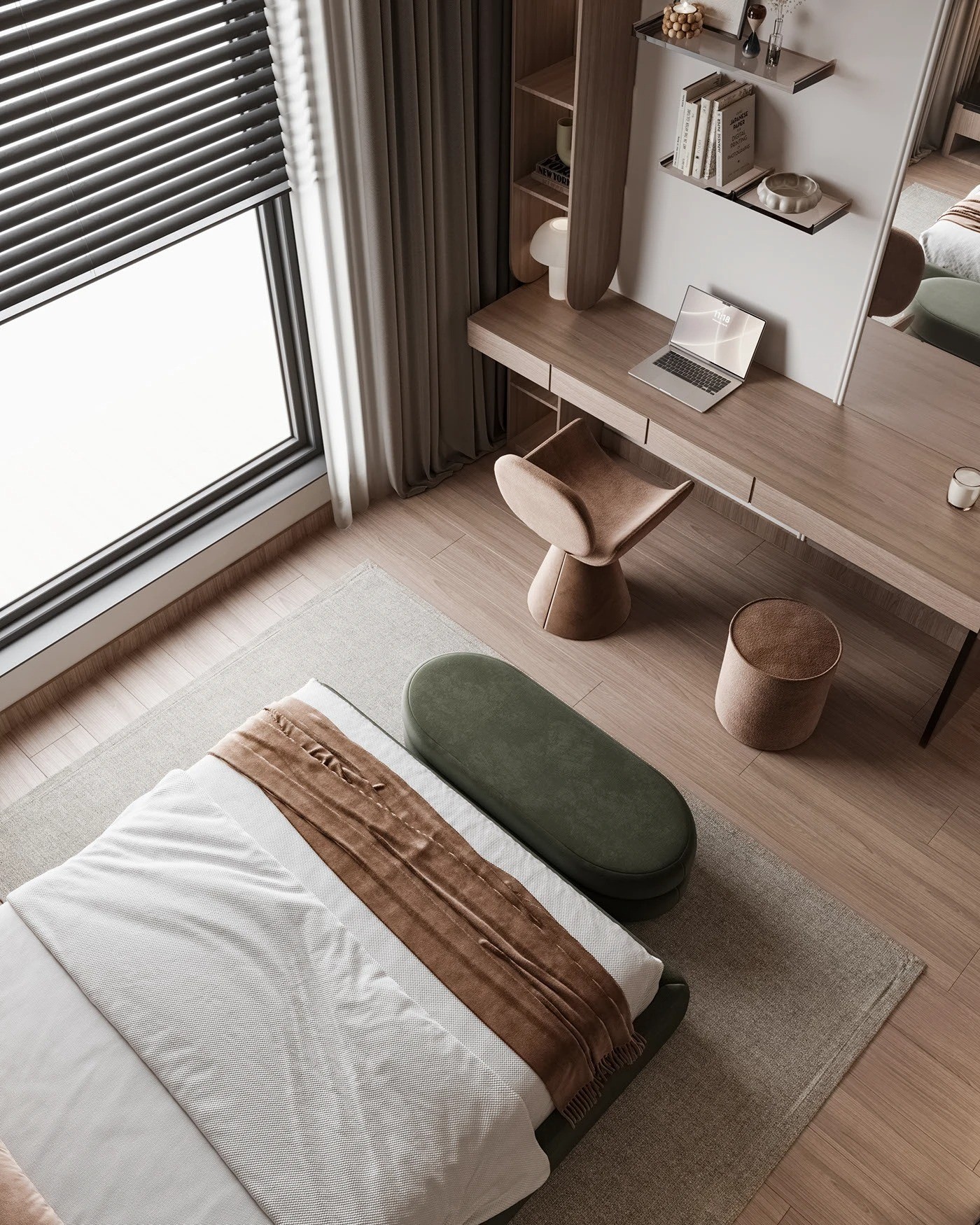 تجمع الغرفة بين الراحة والبساطة العملية، مع تفاصيل حديثة تعكس ذوقًا راقيًا.