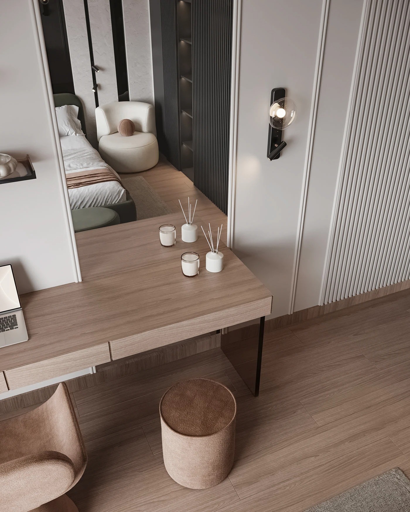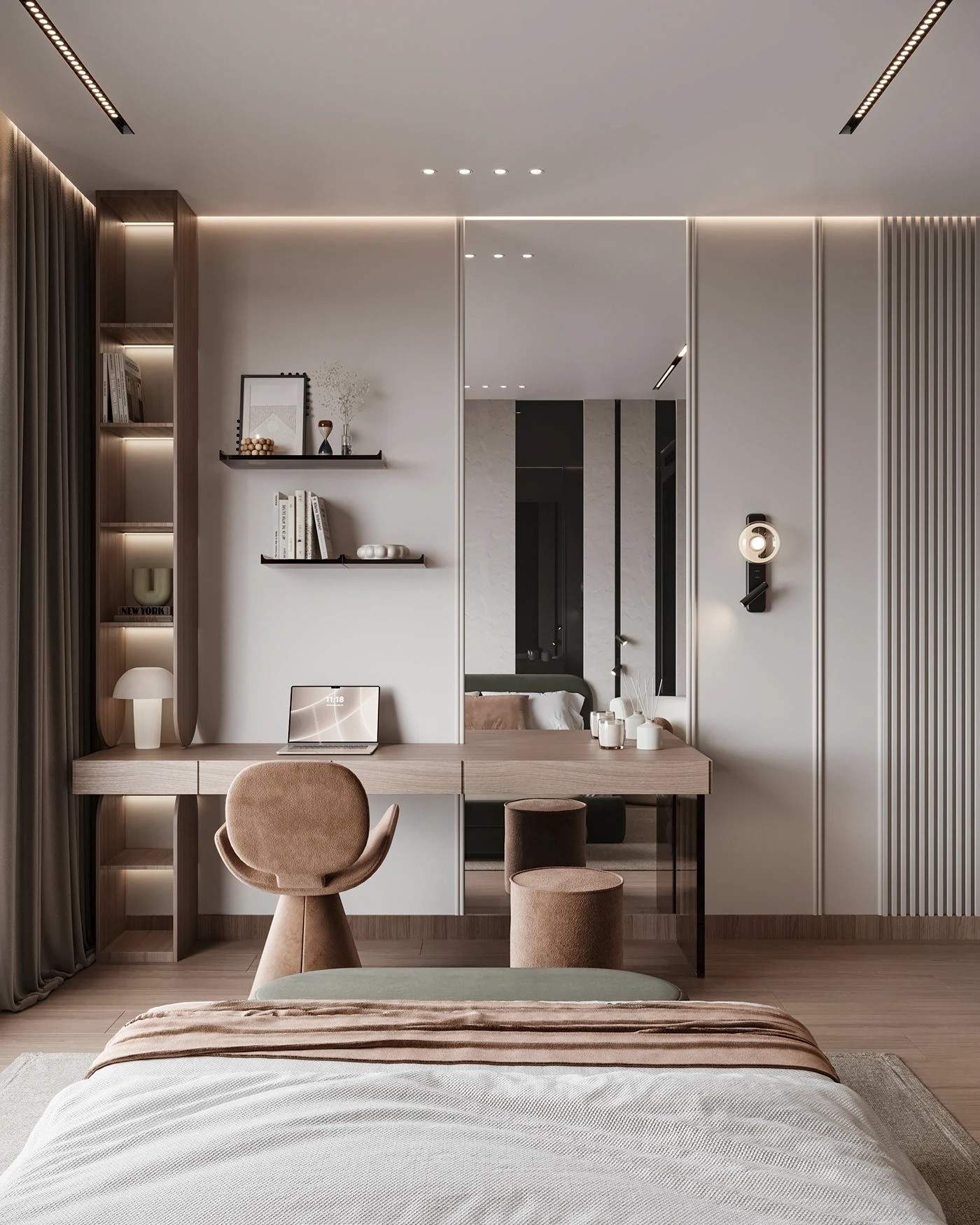 المكتب: مدمج ضمن وحدة التسريحة بنفس الخامة الخشبية، بسطح عمل نظيف وأرفف جانبية عملية.