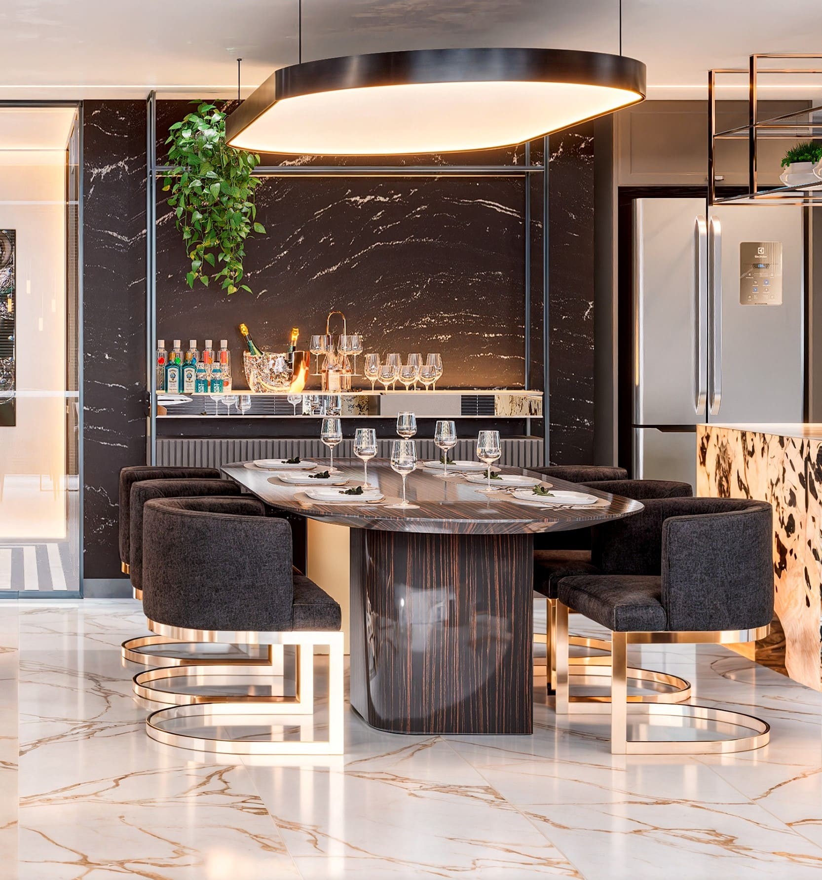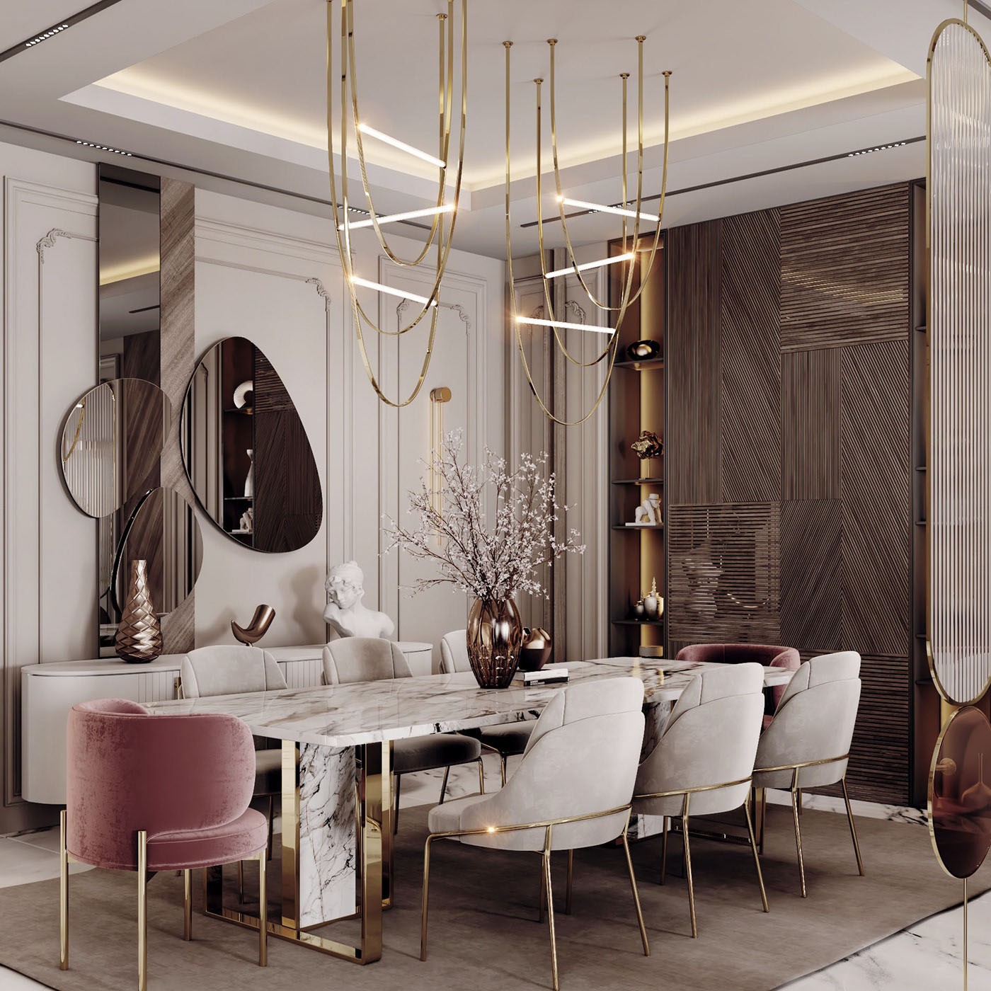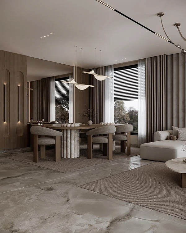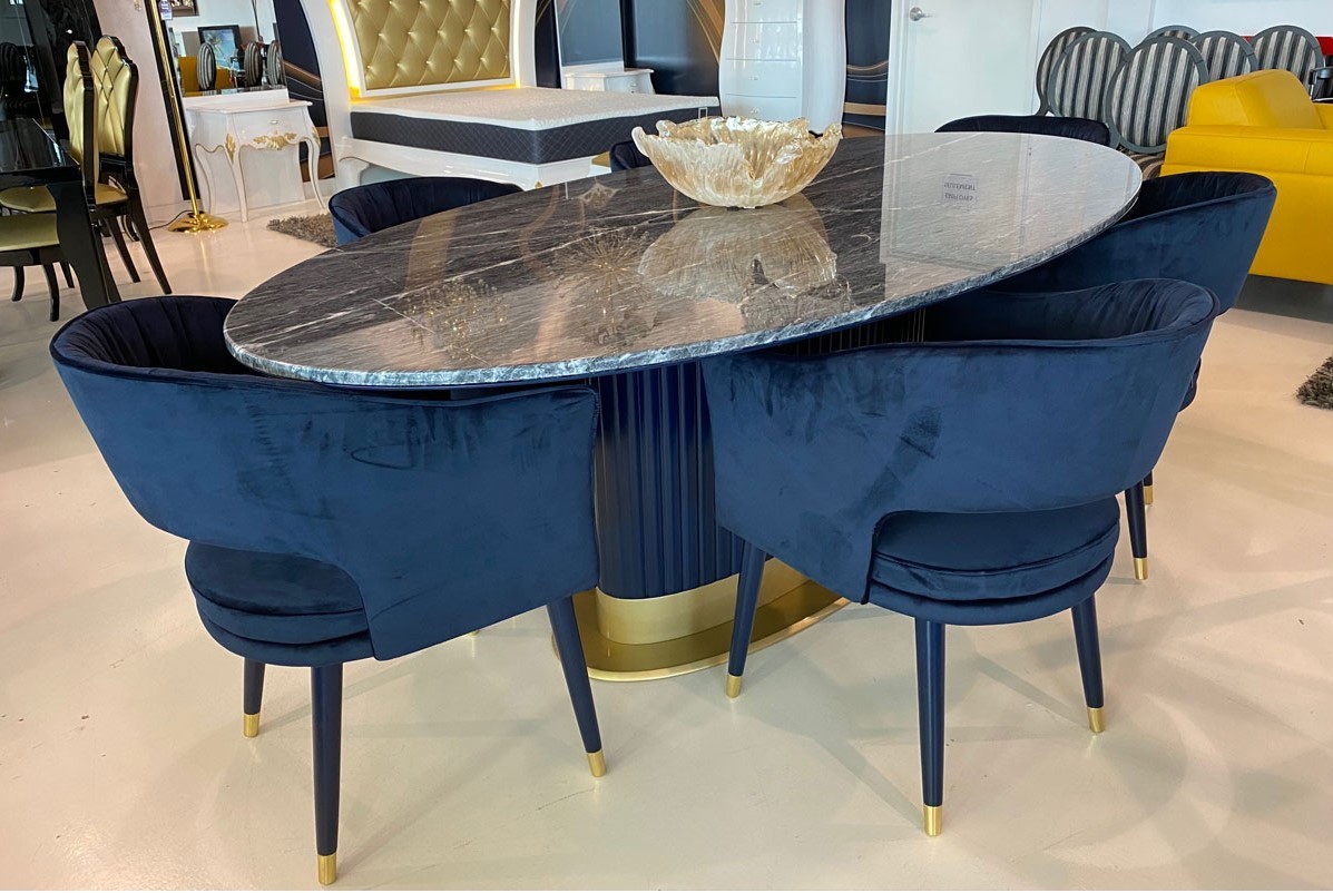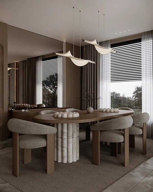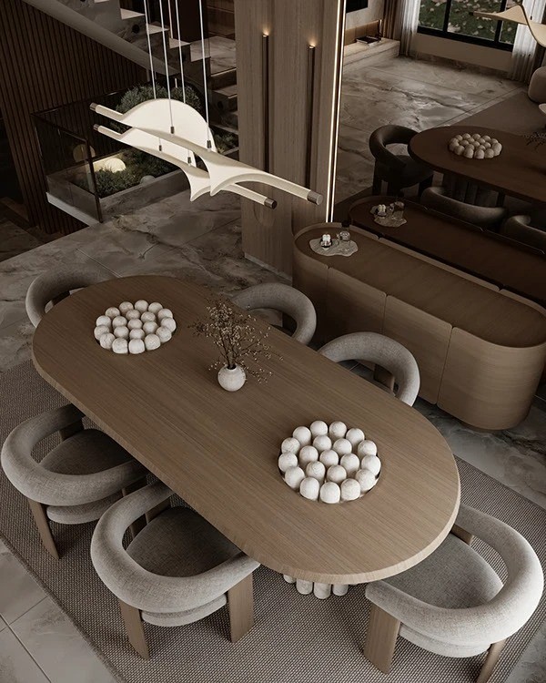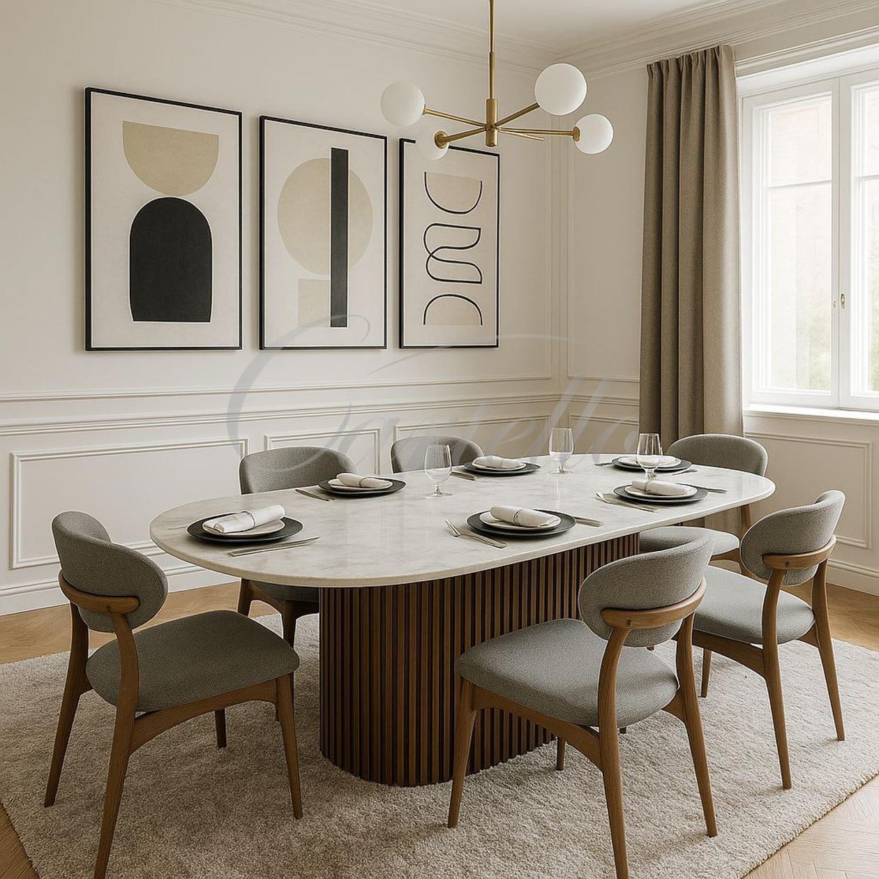 ترابيزة الطعام: تصميم بيضاوي أنيق بسطح خشبي بني هادئ، تستند إلى قاعدة مميزة من أعمدة أسطوانية متجاورة بتشطيب رخامي طبيعي. يجمع التصميم بين البساطة الهندسية والفخامة، ليمنح حضورًا مميزًا ومتوازنًا داخل المساحة.