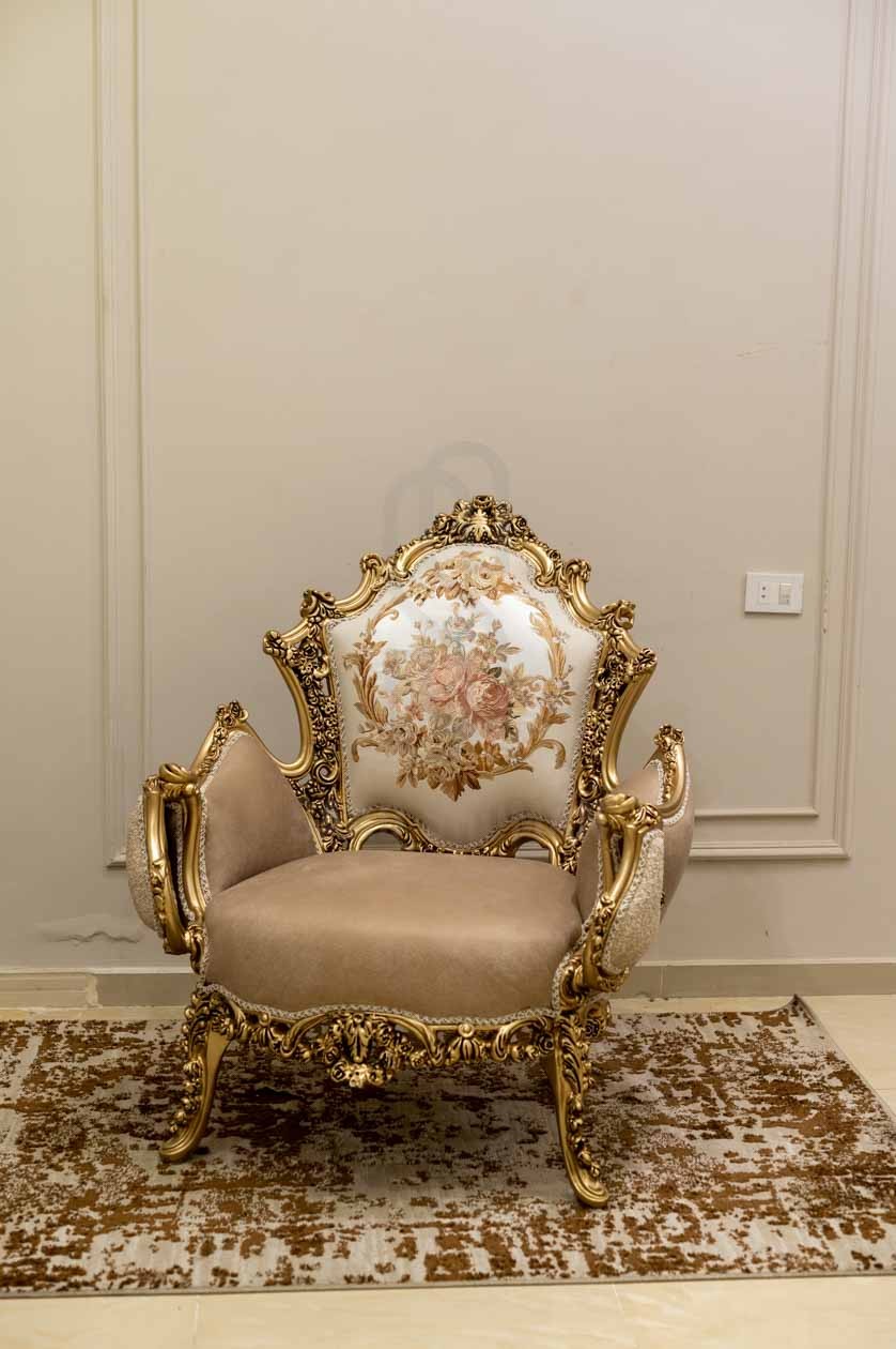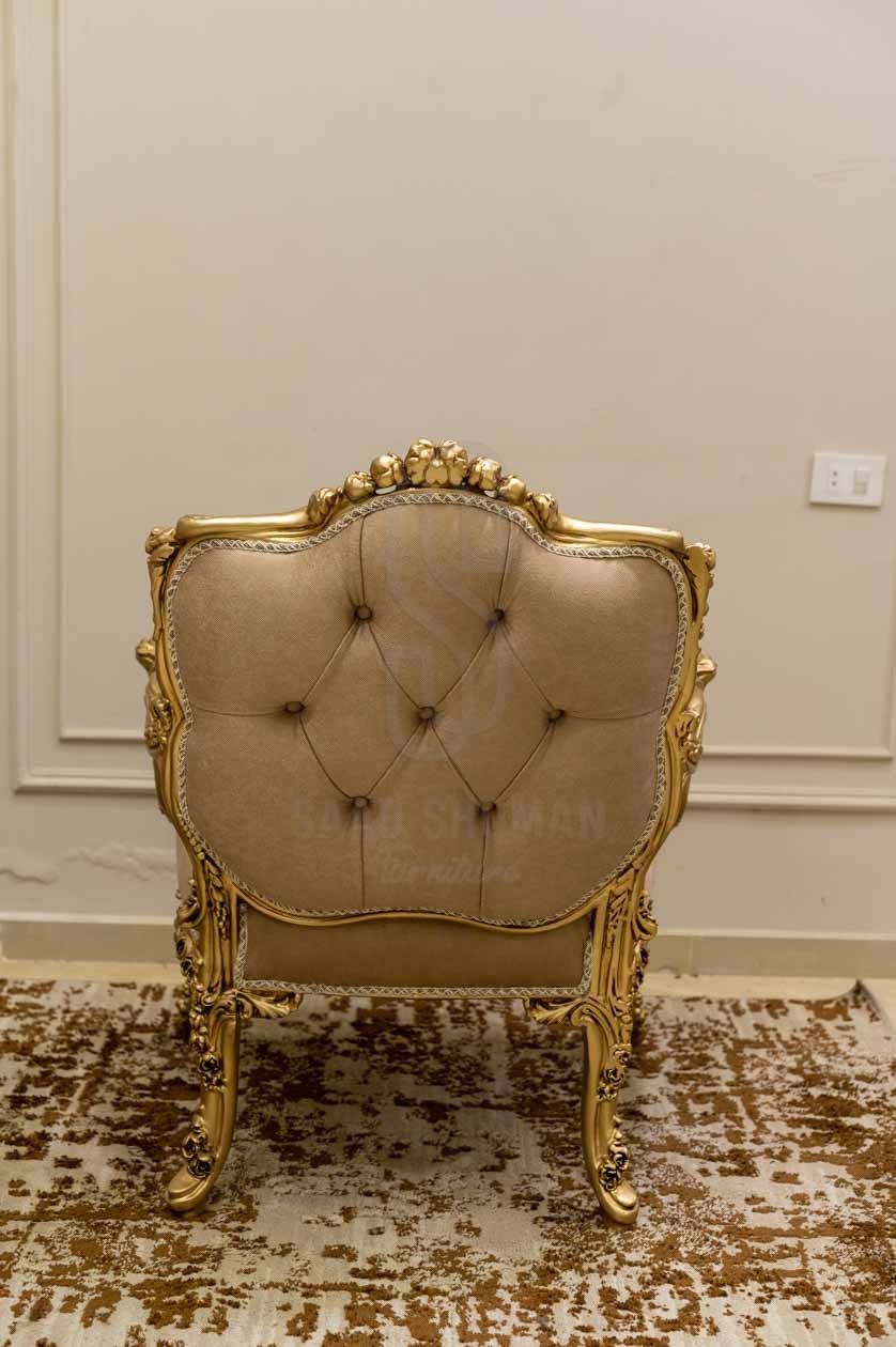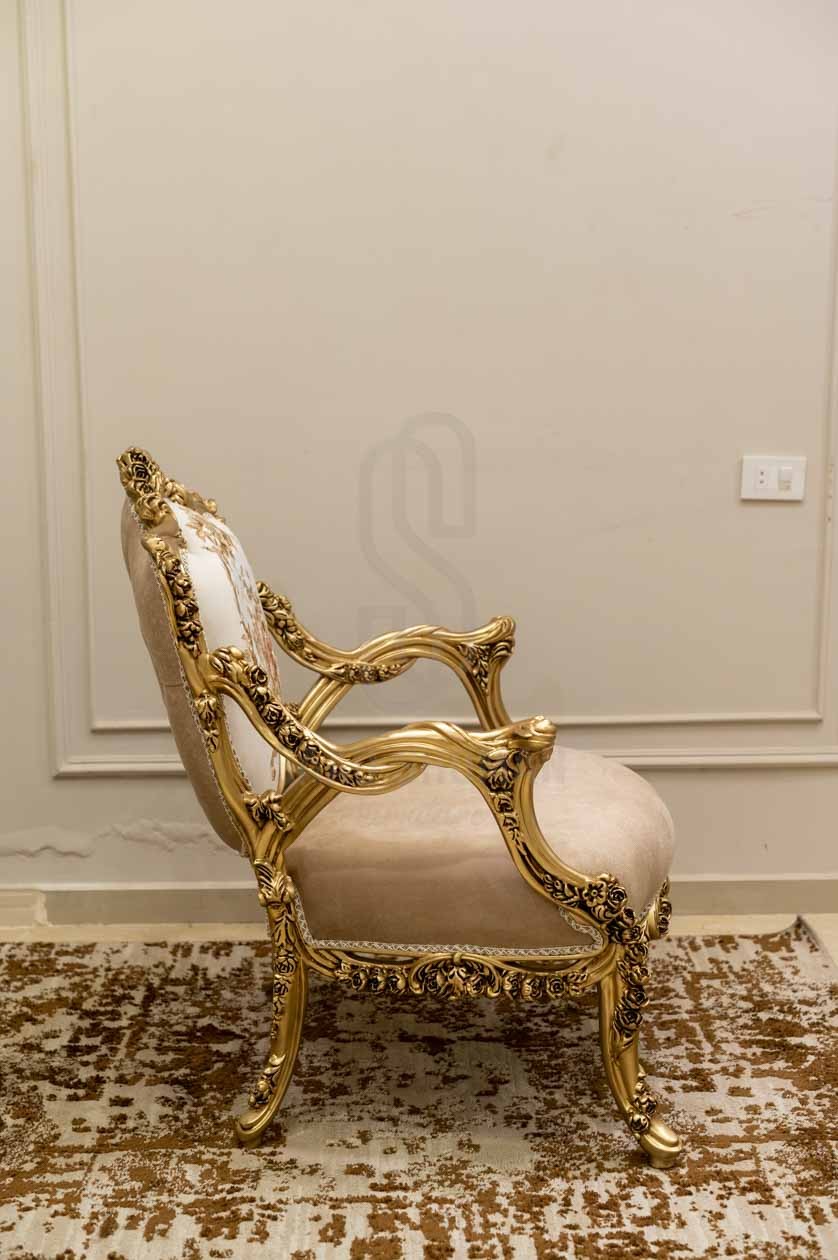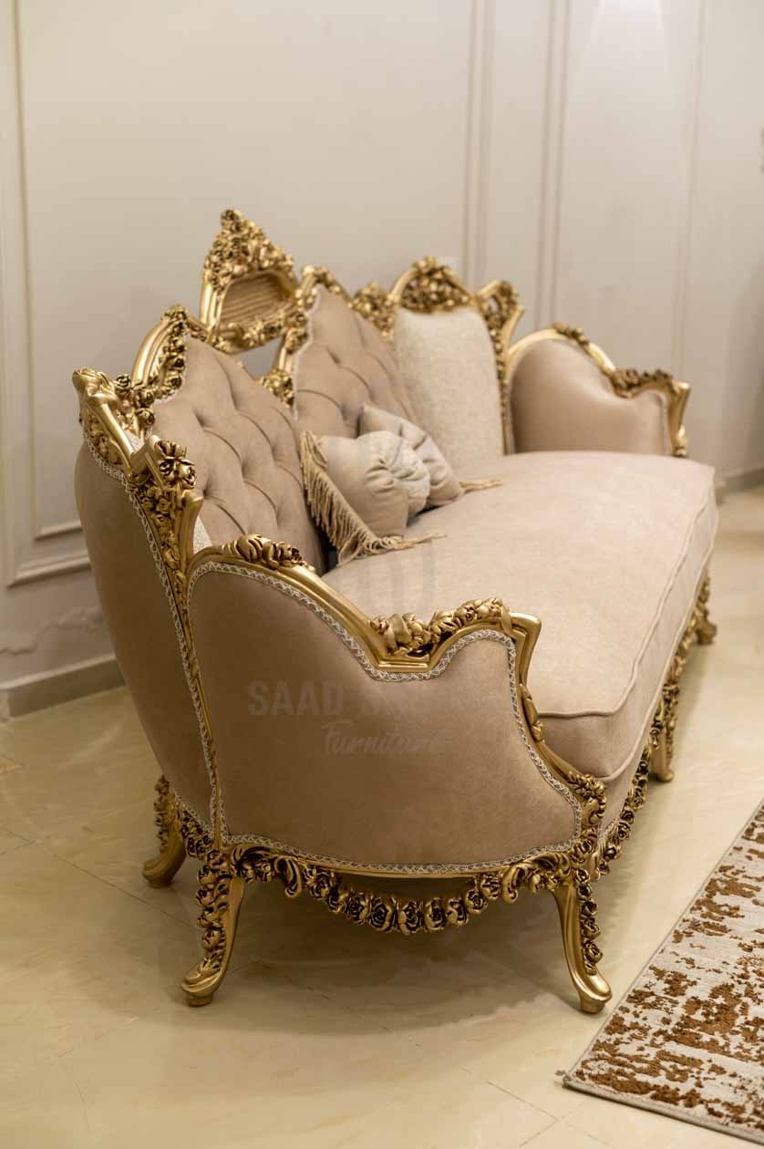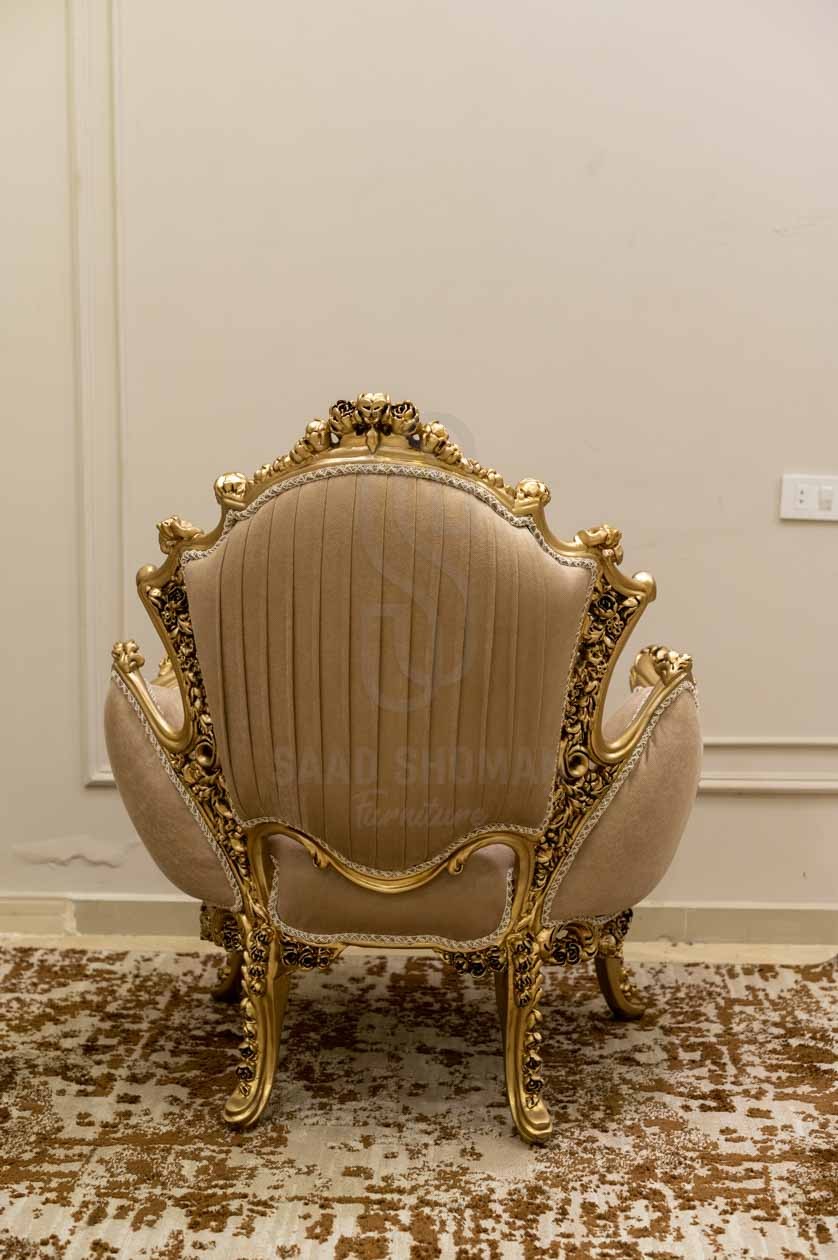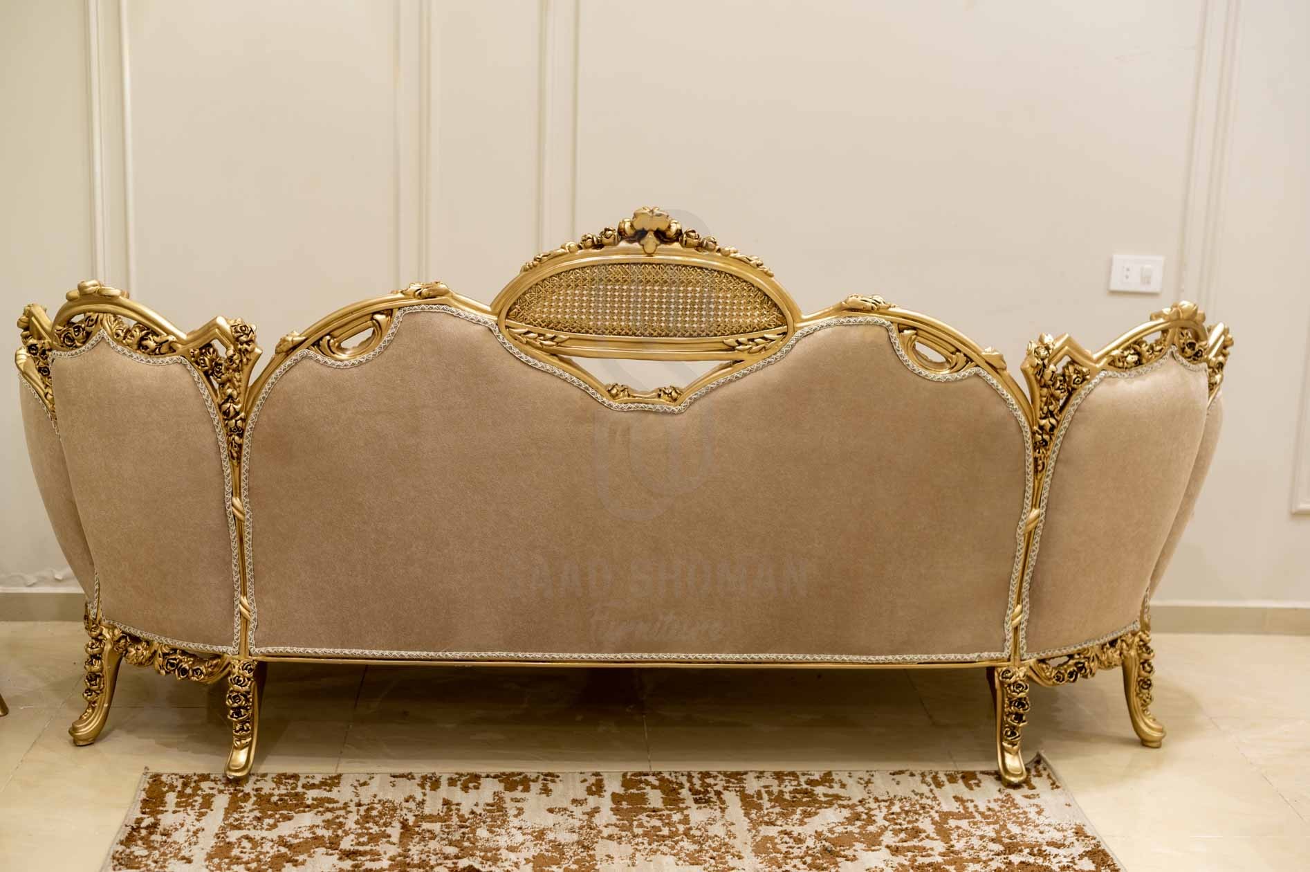 الصالون مزود بتنجيد فاخر عالي الجودة مع زخارف خشبية منقوشة ومطلية يدوياً تمنحه لمسة ملكية راقية. كما تزينه وسائد مزخرفة تضيف لمسة كلاسيكية مميزة وتكمل جمال التصميم. هذا الصالون اختيار مثالي لعشاق الفخامة والتفاصيل الدقيقة.