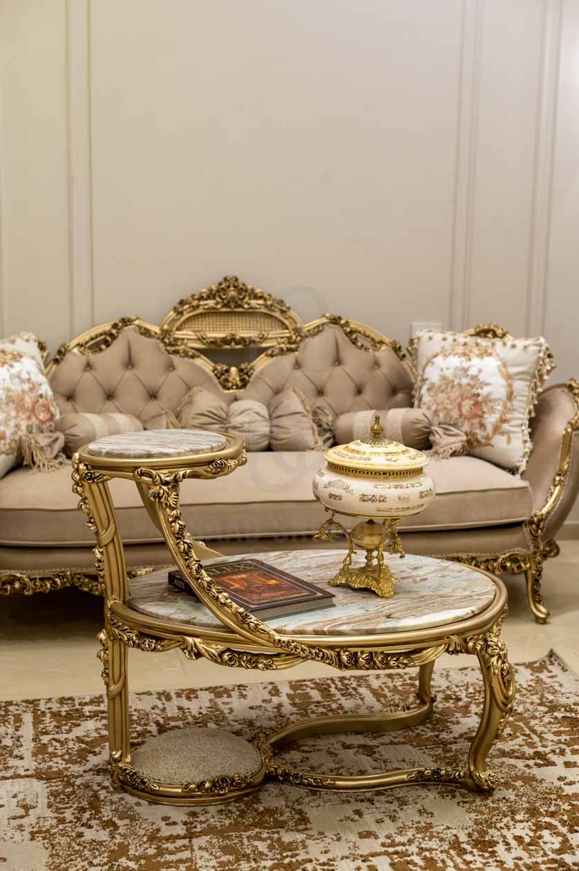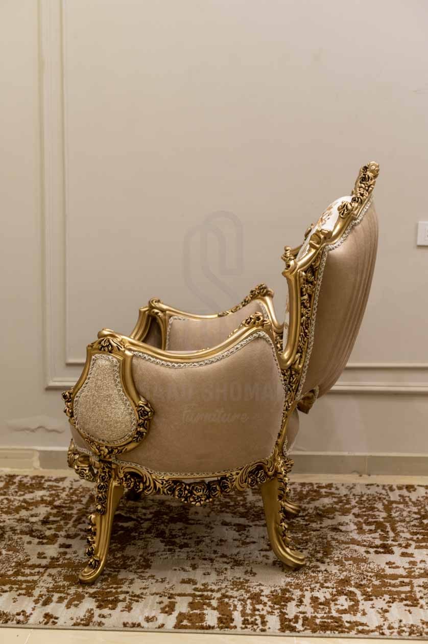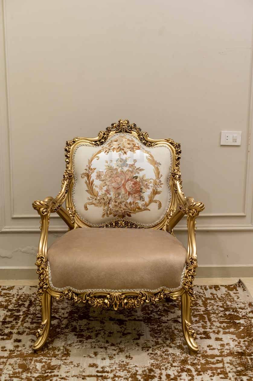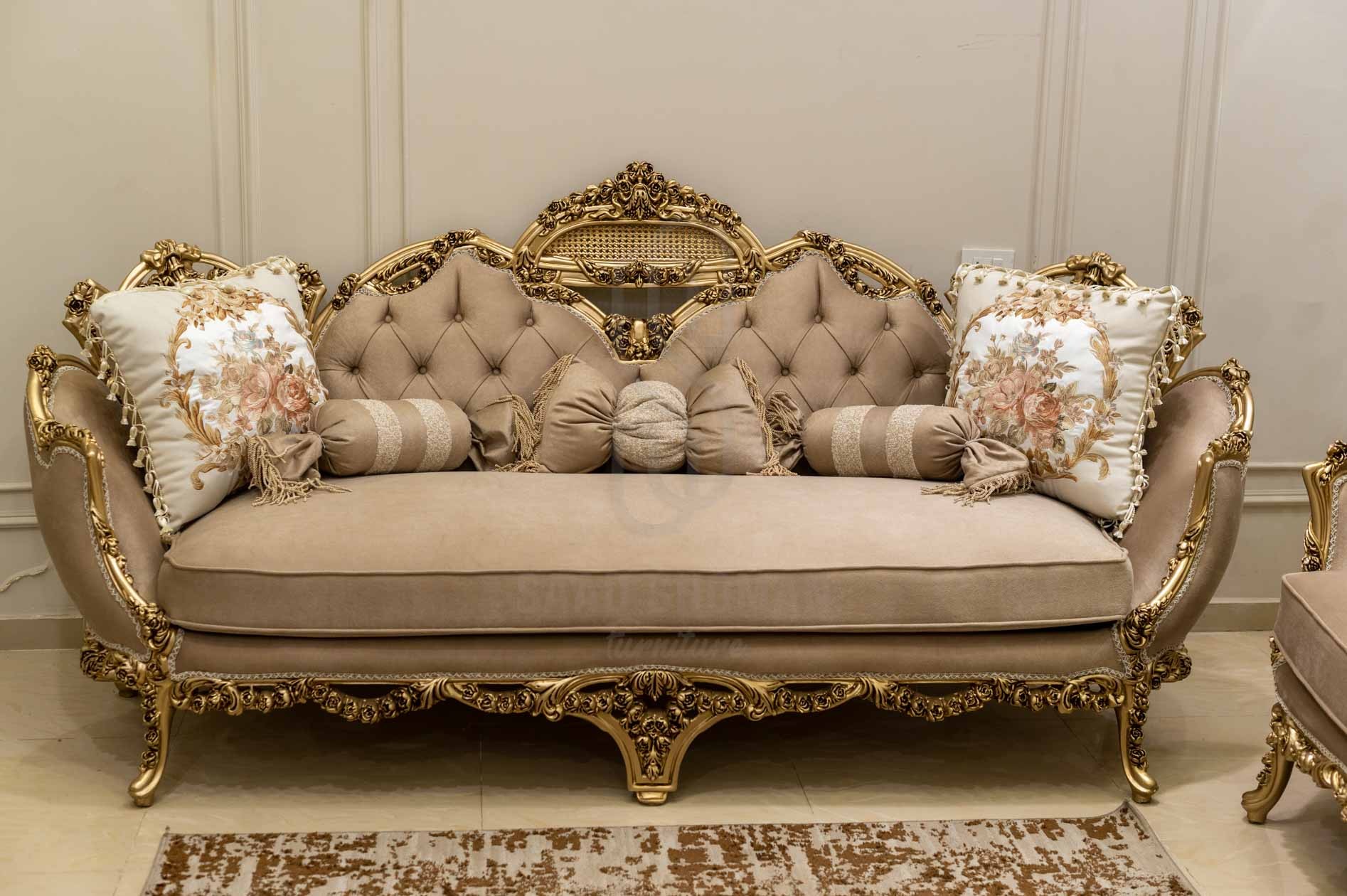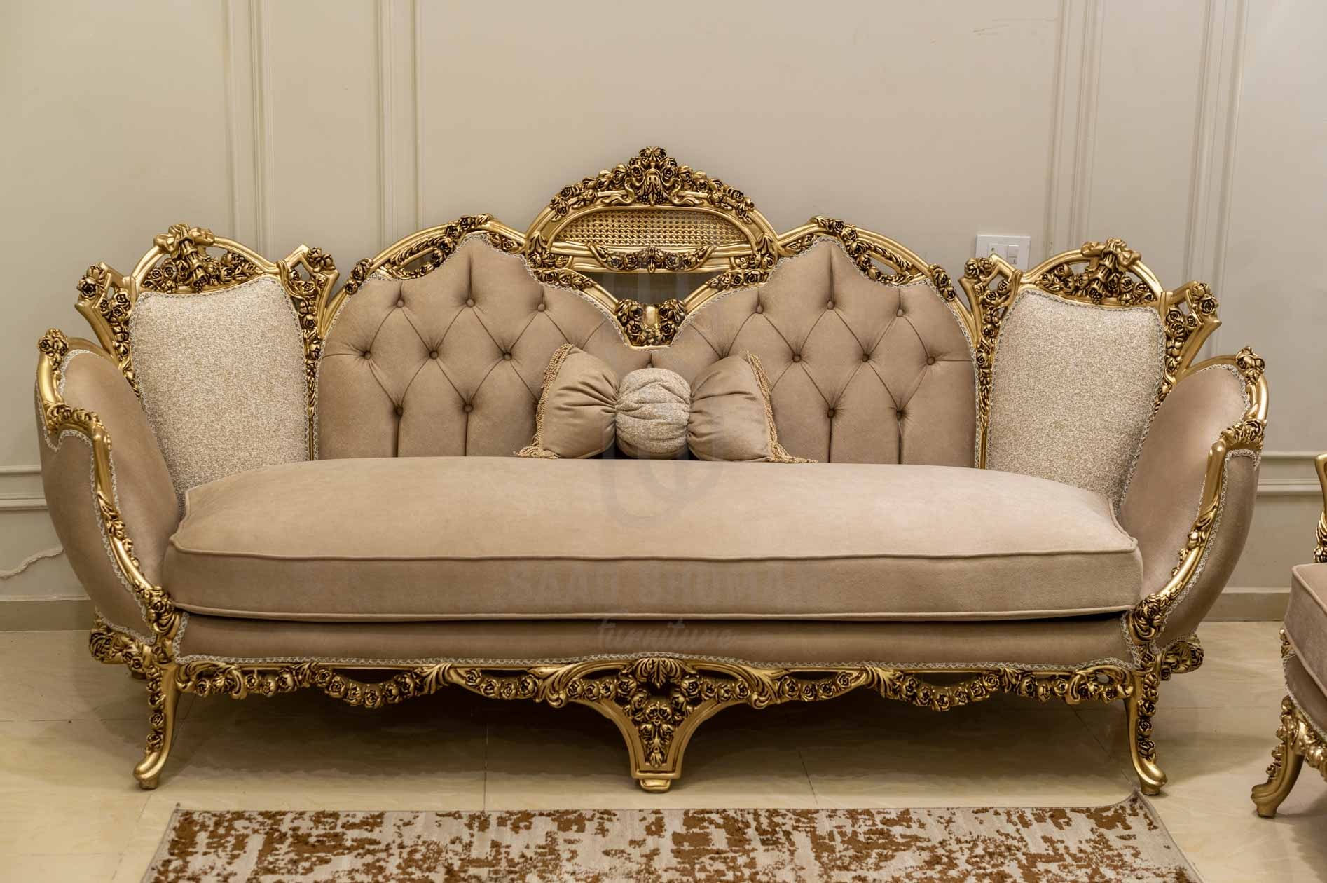 الصالون مزود بتنجيد فاخر عالي الجودة مع زخارف خشبية منقوشة ومطلية يدوياً تمنحه لمسة ملكية راقية. كما تزينه وسائد مزخرفة تضيف لمسة كلاسيكية مميزة وتكمل جمال التصميم. هذا الصالون اختيار مثالي لعشاق الفخامة والتفاصيل الدقيقة.