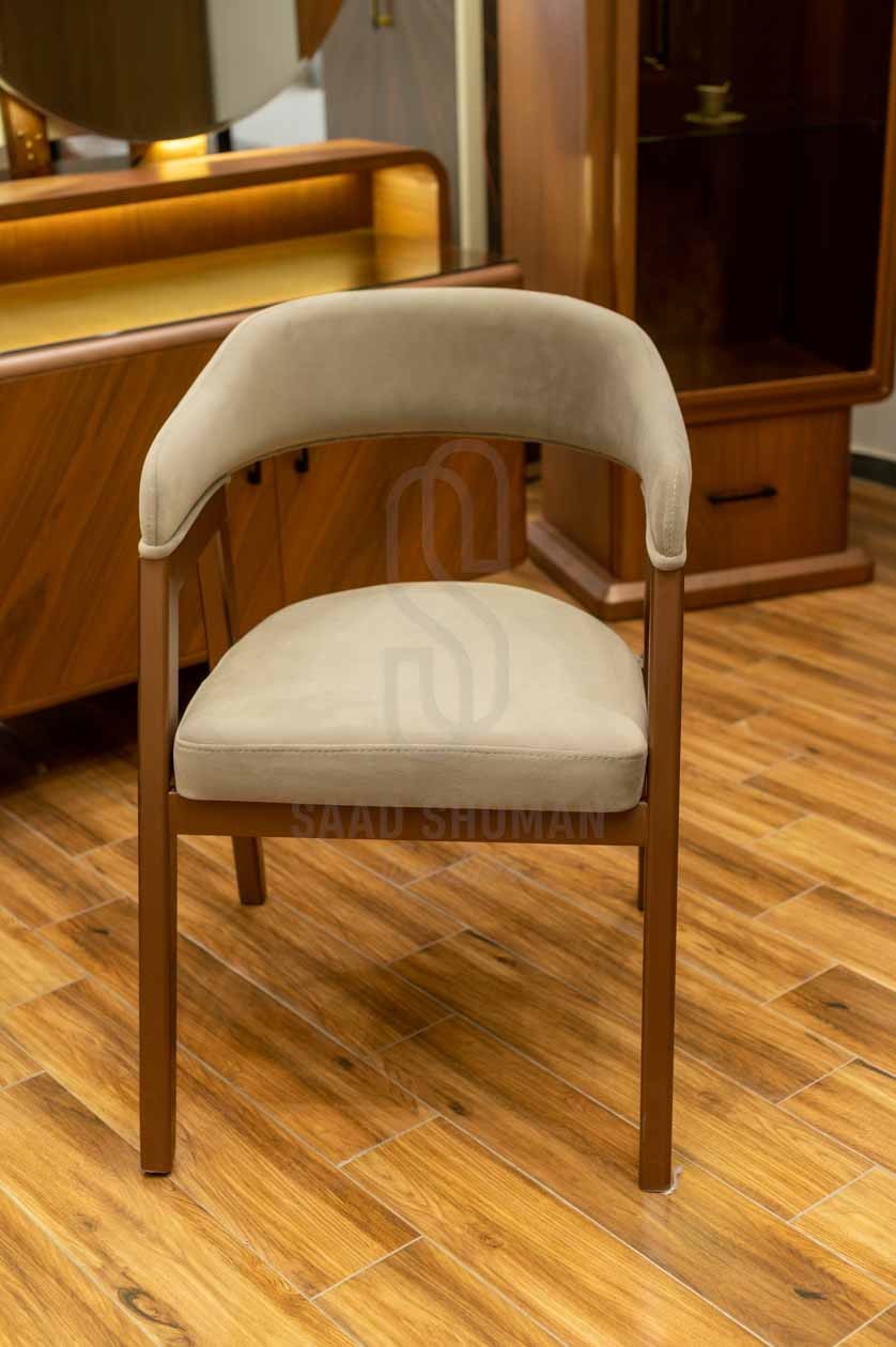 الكراسي: عدد 6 كراسي مريحة بهيكل خشبي متناسق مع الترابيزة، مقعد وظهر مبطنان بقماش ناعم بلون بيج فاتح مائل للرمادي، ظهر متوسط الارتفاع بانحناءة مريحة.