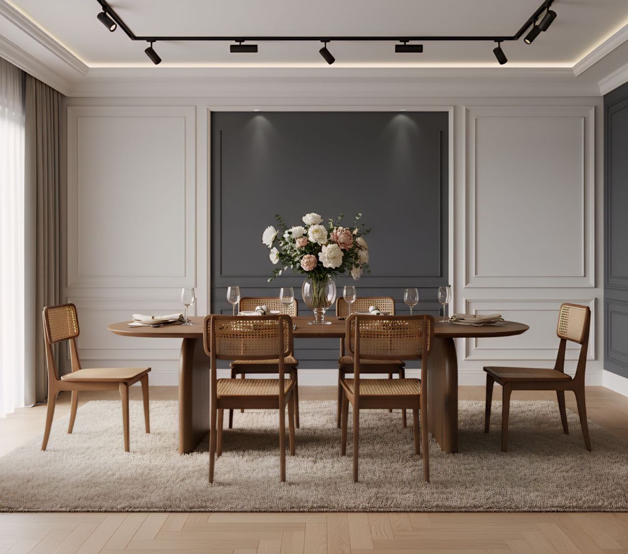 تتكوّن من ترابيزة طعام أنيقة مع 6 كراسي مريحة، بوفيه واسع، برواز مرايا مودرن، وعدد 2 نيش بتصميم أنيق يضفي على الغرفة لمسة من الفخامة والتنظيم.