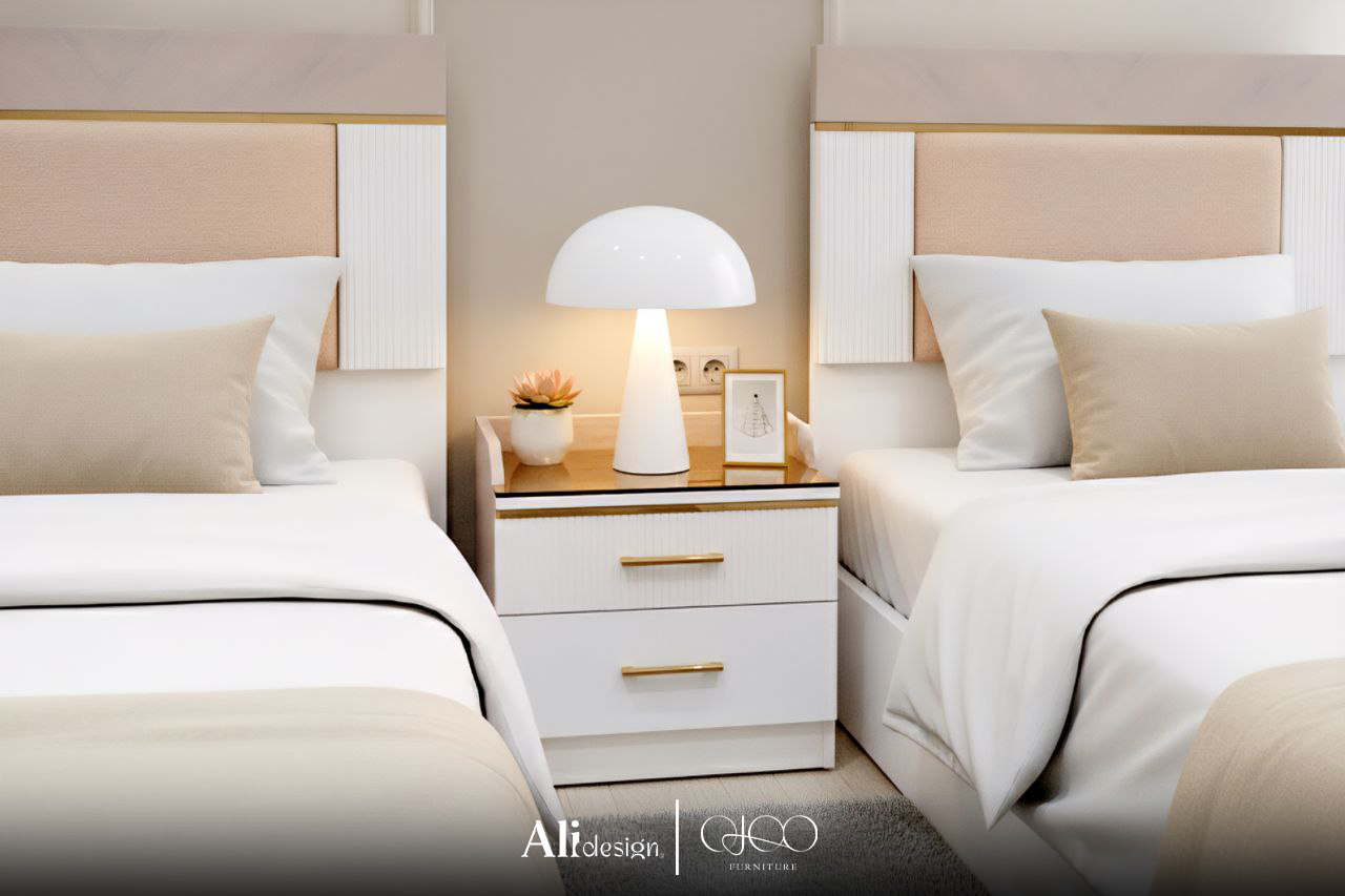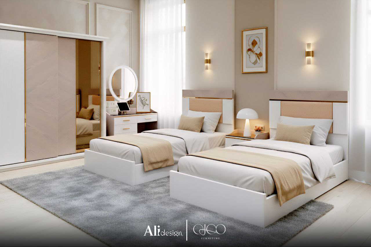 تضم الغرفة سريرين بتصميم حديث مزودين بإضاءة خلفية أنيقة تضيف لمسة فخامة للمكان، مع دولاب عملي بتقسيم ذكي لتخزين منظم، وتسريحة بمرآة مضيئة تمنح الغرفة إضاءة جذابة وشعور بالاتساع.