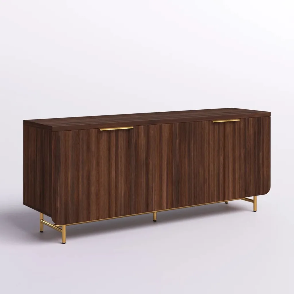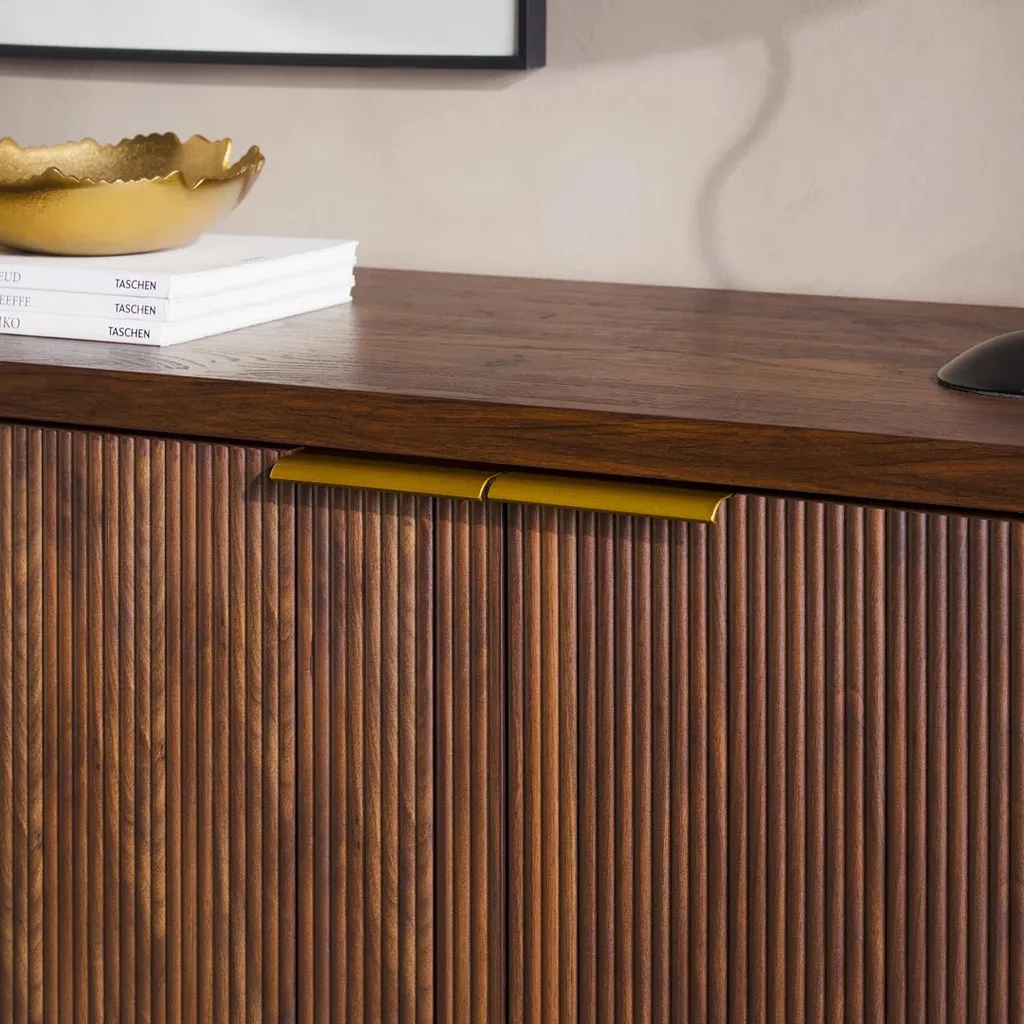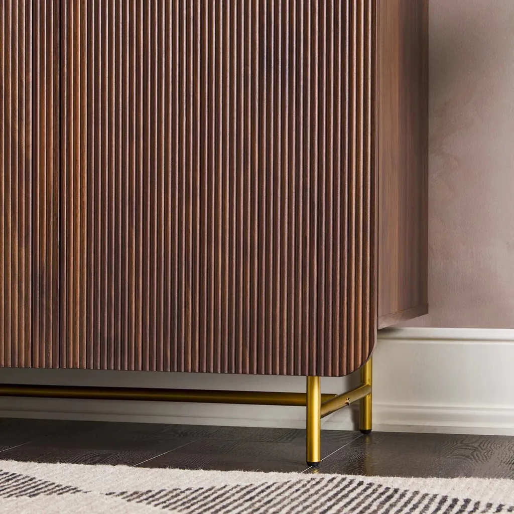 تُبرز واجهته خطوط رأسية محفورة بدقة تضيف عمقاً بصرياً وحساً تصميمياً متقناً. الأبواب مزودة بمقابض معدنية بلون ذهبي تتناغم مع الأرجل المعدنية الرفيعة بنفس اللون، مما يضفي لمسة فاخرة ويعزز التباين بين الخامات.