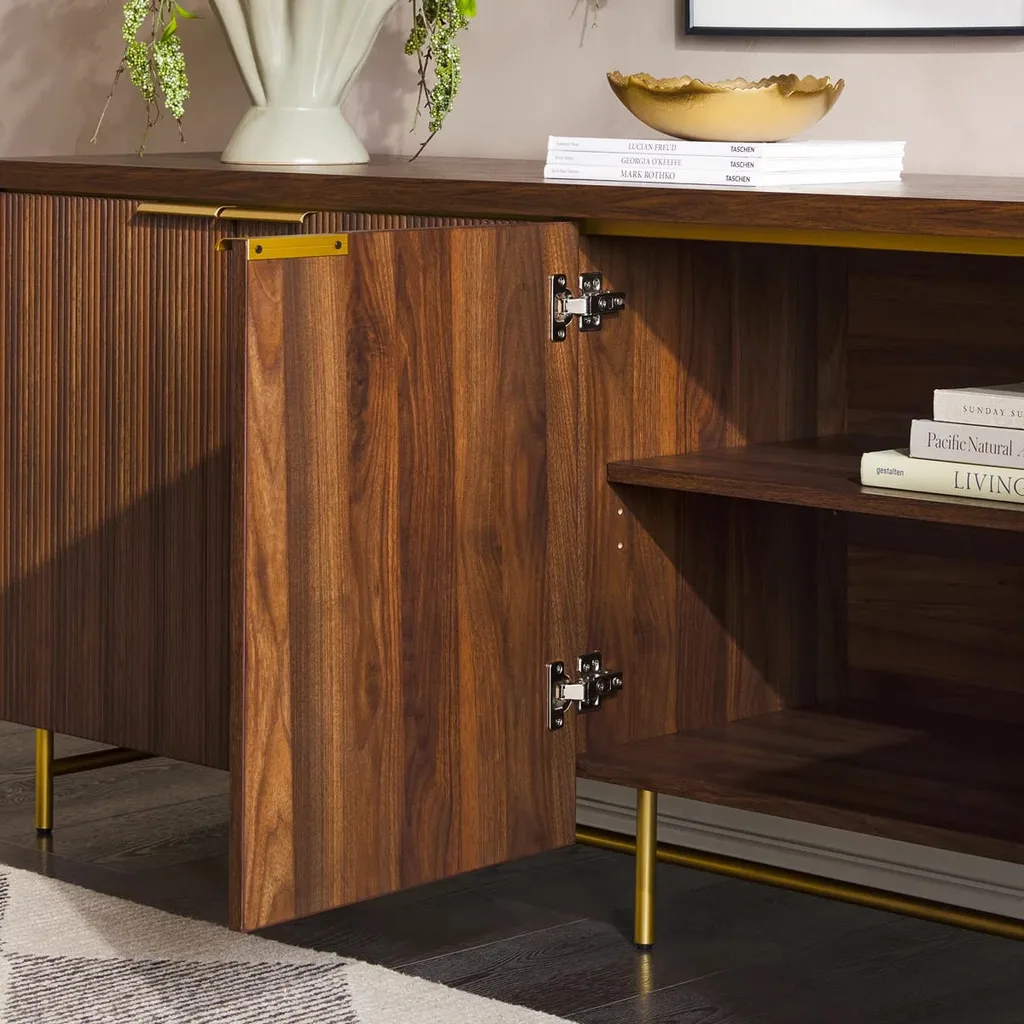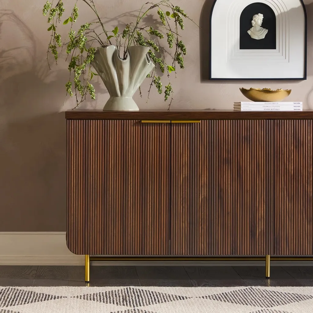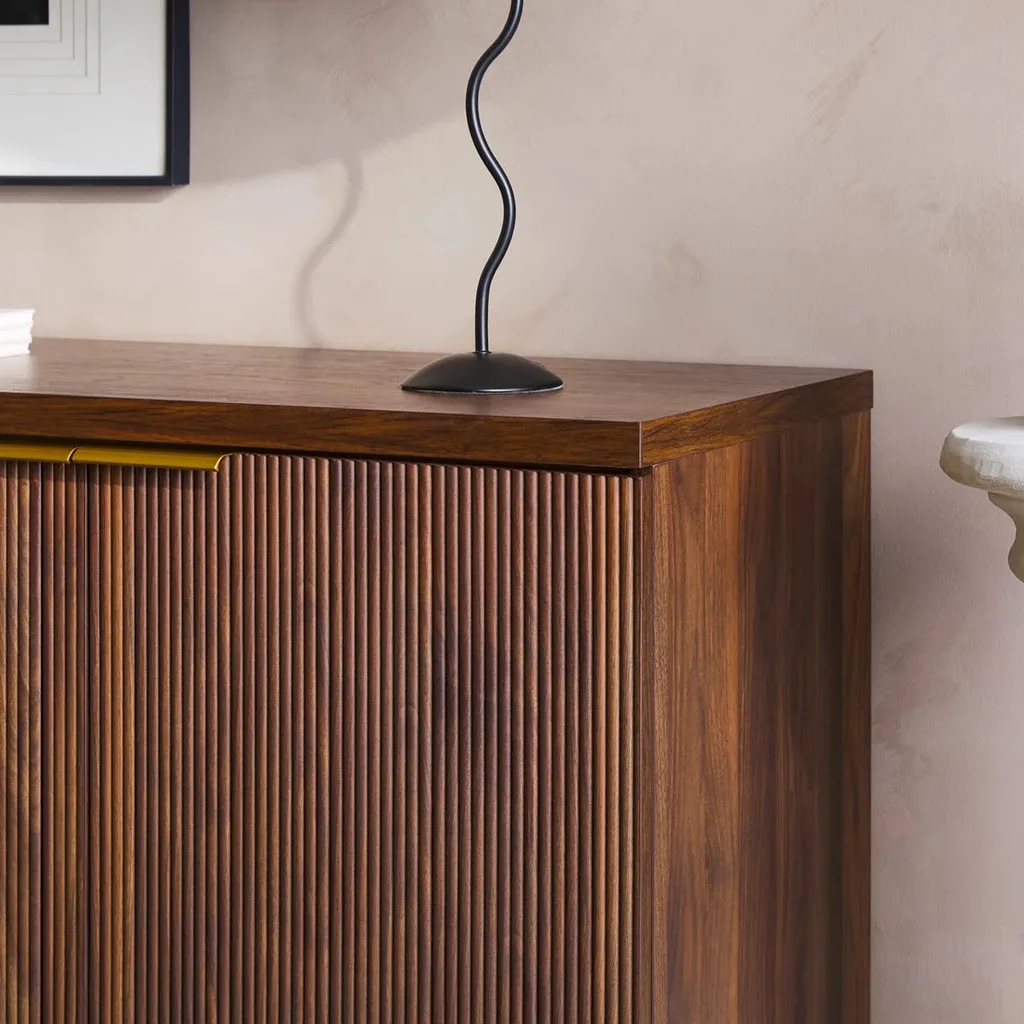 تُبرز واجهته خطوط رأسية محفورة بدقة تضيف عمقاً بصرياً وحساً تصميمياً متقناً. الأبواب مزودة بمقابض معدنية بلون ذهبي تتناغم مع الأرجل المعدنية الرفيعة بنفس اللون، مما يضفي لمسة فاخرة ويعزز التباين بين الخامات.
