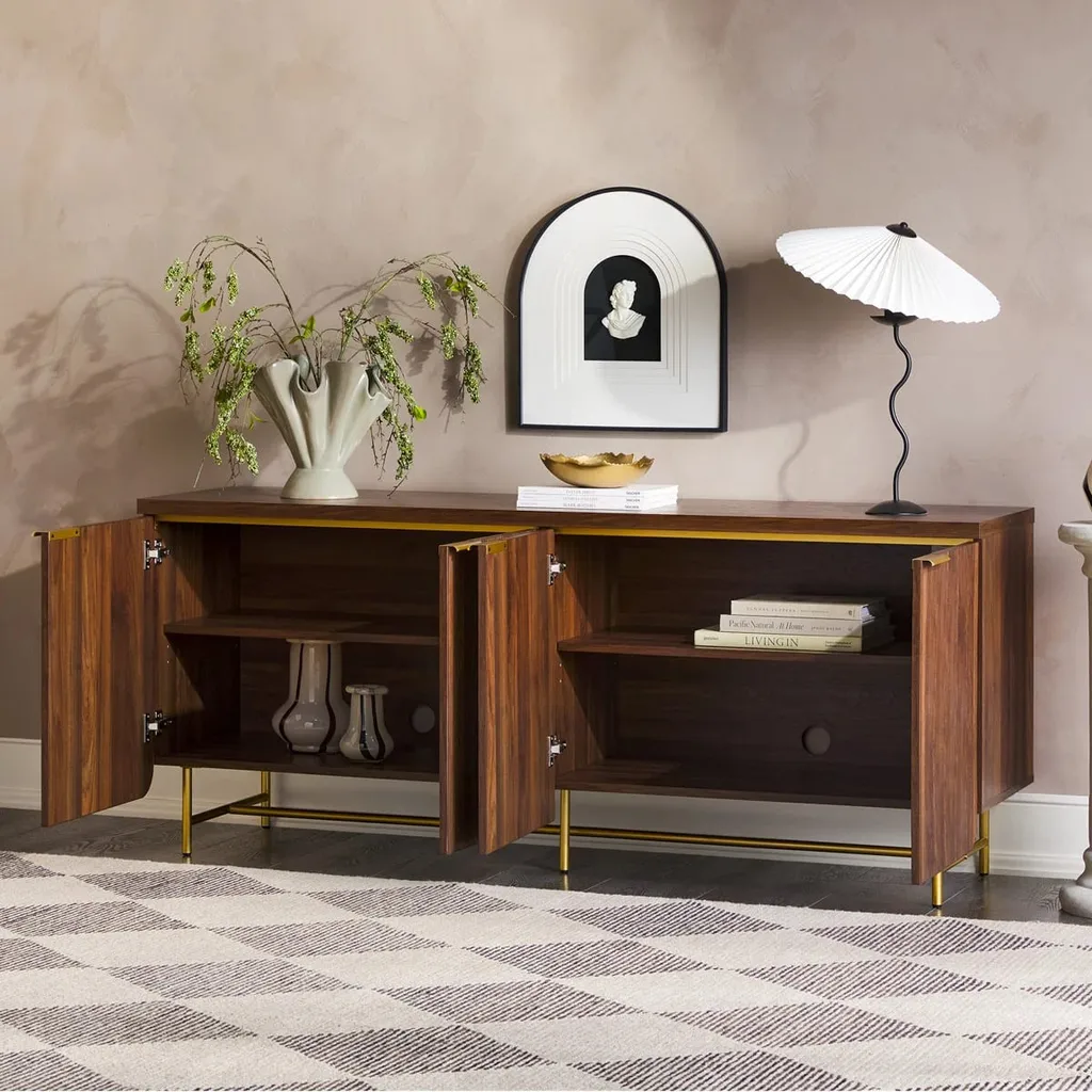 السطح العلوي واسع ومستوي، مثالي لترتيب العناصر الزخرفية أو الاستخدام العملي اليومي. التصميم العام يجمع بين الجمالية والوظيفة، ليمنح البوفيه حضوراً راقياً يناسب المساحات الحديثة ذات الذوق الرفيع.