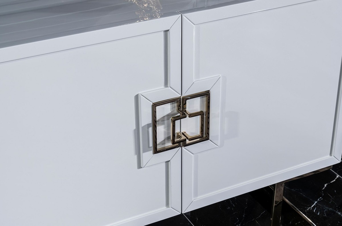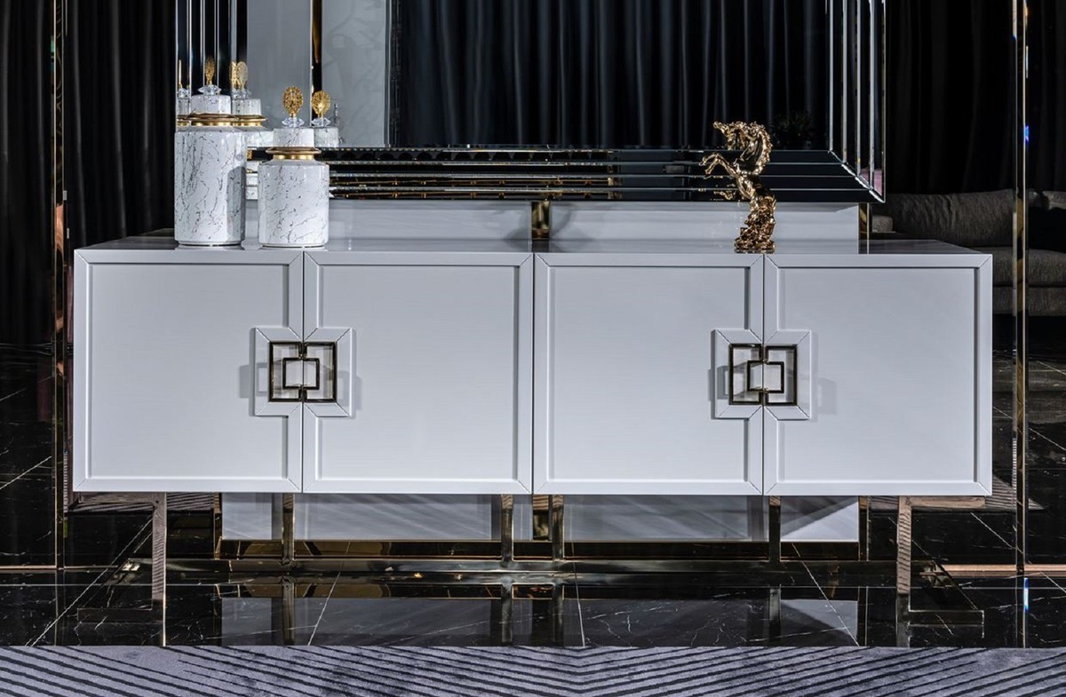 بوفيه عصري أنيق بتصميم مستطيل وانسيابي، يتميز بلونه الأبيض اللامع الذي يمنحه طابعاً فخماً ومتجدداً. يحتوي على أربع أبواب متساوية الحجم مزوّدة بـ مقابض مربعة معدنية باللون الذهبي تضيف لمسة رقي وتباين بصري جذاب.