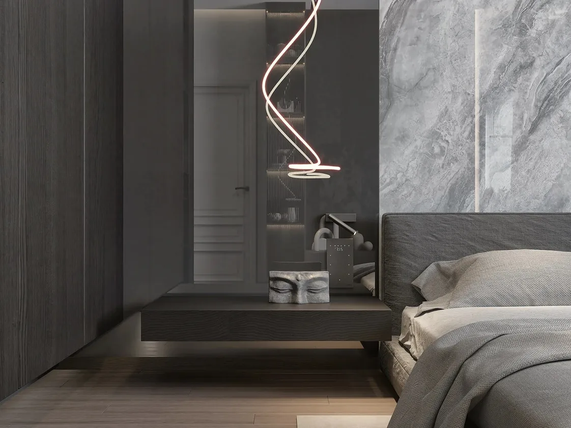 الكومود المثبت بشكل عائم بلون أسود غير لامع، بتصميم مستقيم خالٍ من المقابض، يضيف لمسة حديثة وانسيابية.