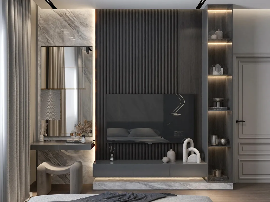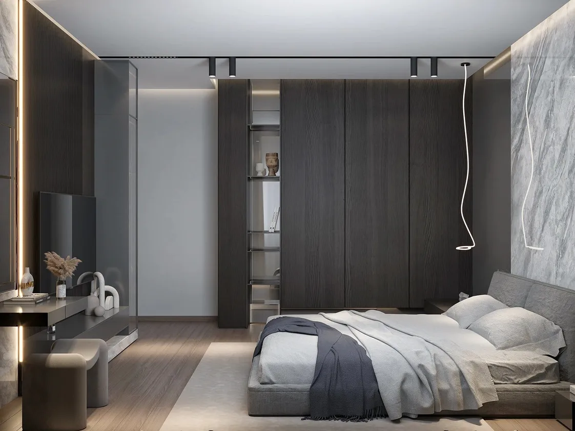 السرير منخفض بقاعدة هندسية أنيقة مغطاة بتنجيد رمادي ناعم يمتد ليشمل الرأسية المستطيلة ذات الخطوط الأفقية البسيطة، مما يمنح الغرفة طابعًا هادئًا ومتوازنًا.