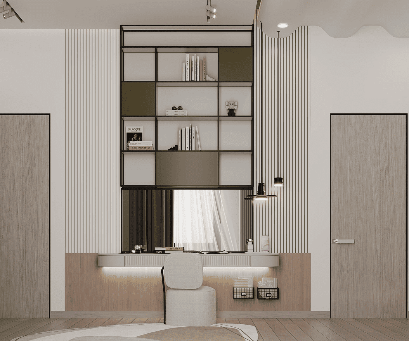 التسريحة المعلقة بتصميم أوف وايت ناعم، مزودة بدرج مدمج ووحدات أرفف علوية ومرآة كبيرة تعزز الإحساس بالاتساع والانسيابية.
