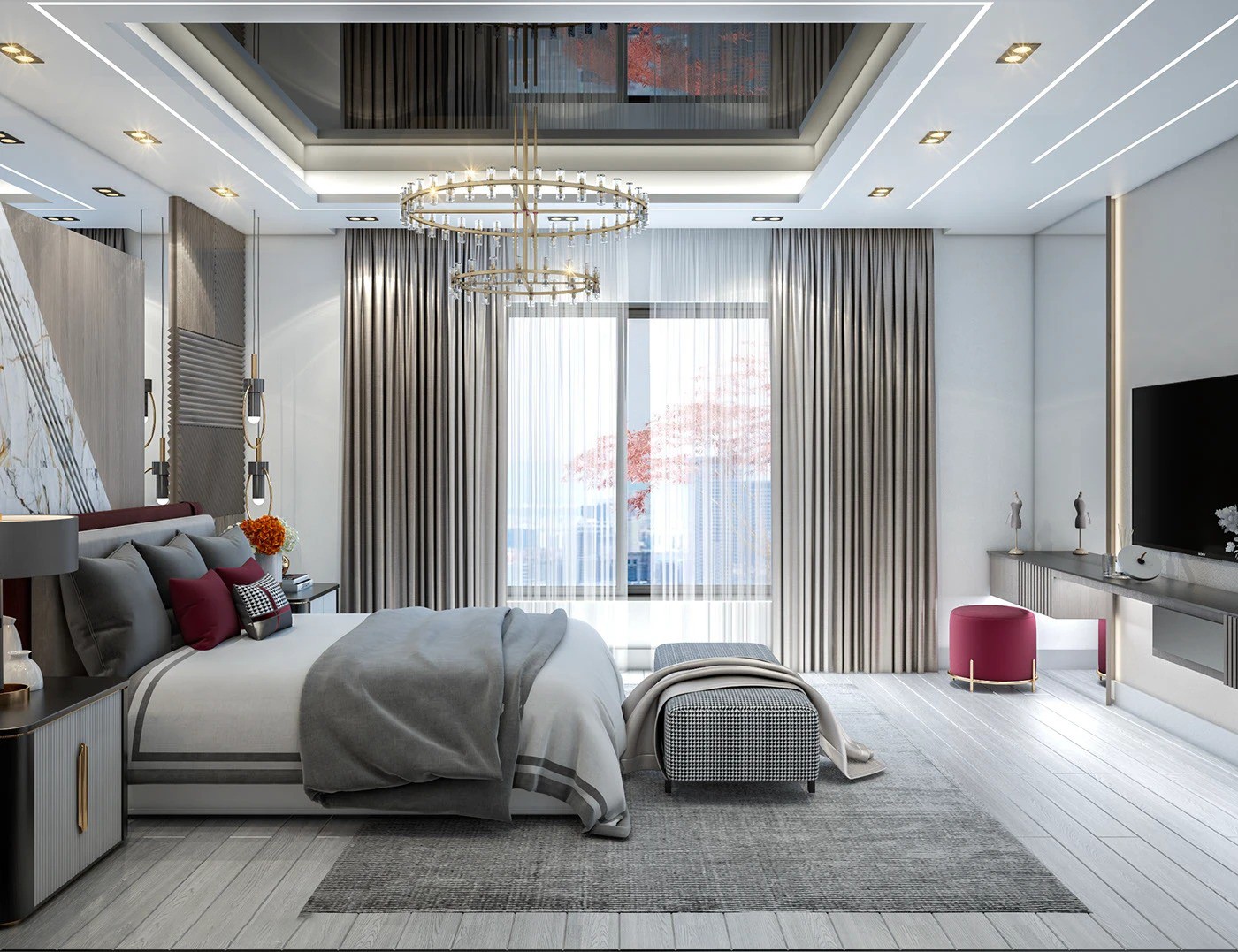 غرفة نوم بتصميم عصري راقٍ تجمع بين الأناقة والوظيفة، تشمل السرير، الكومودات، البانكيت، والتسريحة مع البف.
