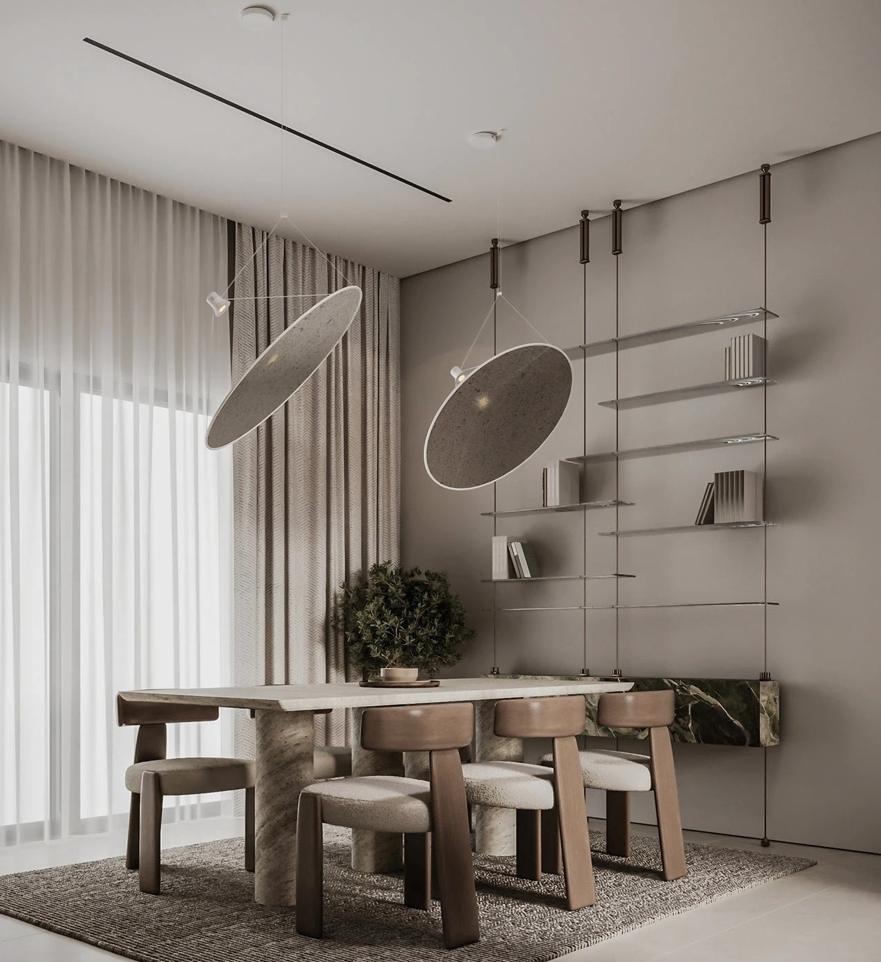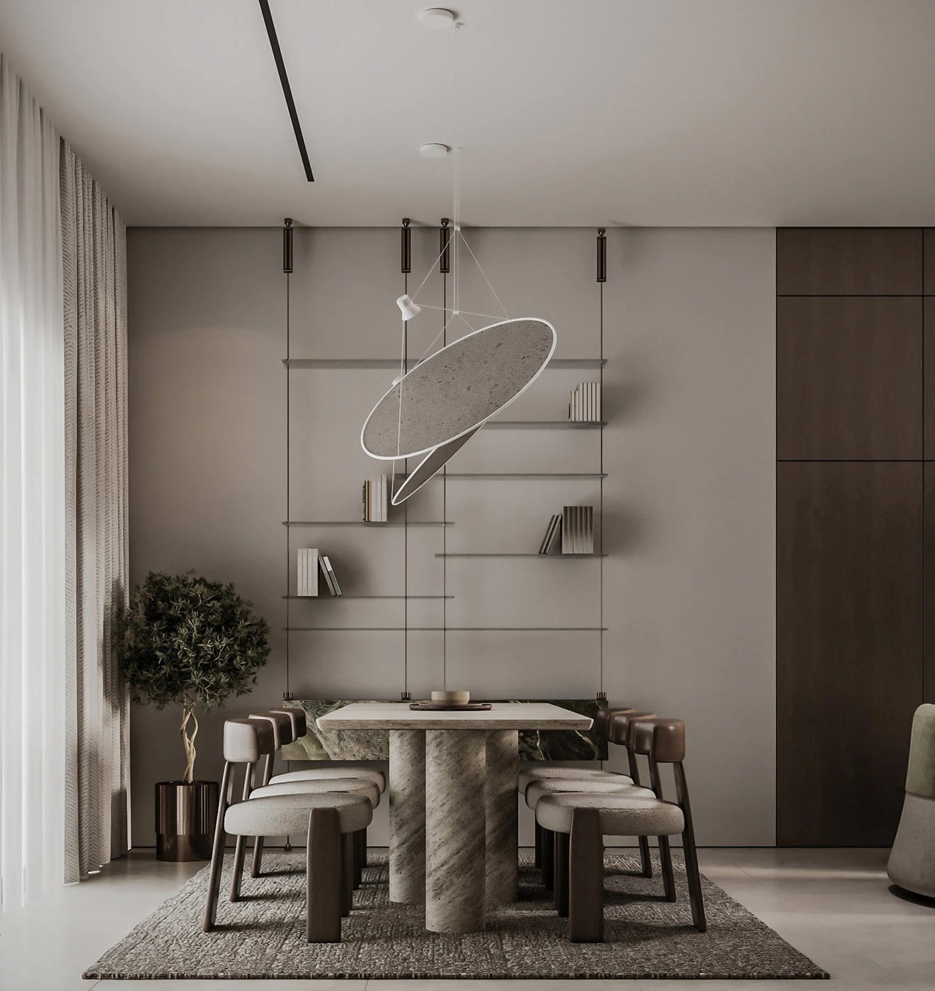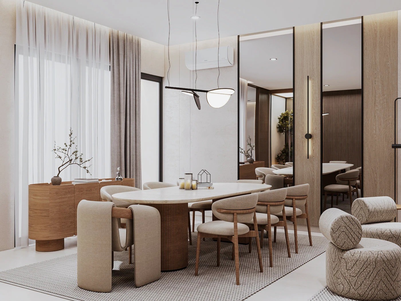 غرفة طعام بتصميم عصري فاخر تجمع بين البساطة والفخامة، تشمل ترابيزة وستة كراسي بتفاصيل متناسقة.