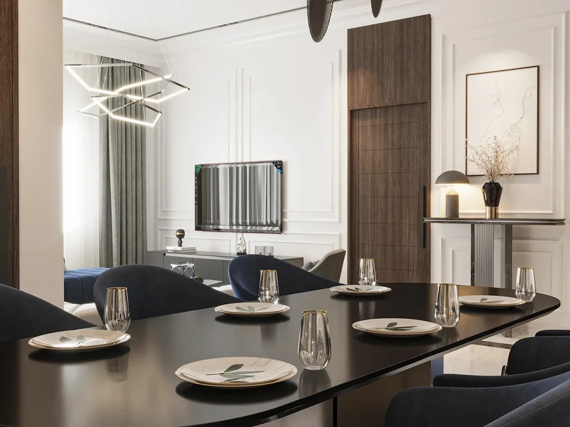 ترابيزة طعام مستطيلة الشكل مصنوعة من الخشب بلون أسود داكن، مع قاعدة أنيقة تمنحها ثباتًا ومظهرًا عصريًا متكامل. تصميم الترابيزة يجمع بين البساطة والفخامة، ما يجعلها مثالية للأجواء الرسمية والمناسبات الخاصة.