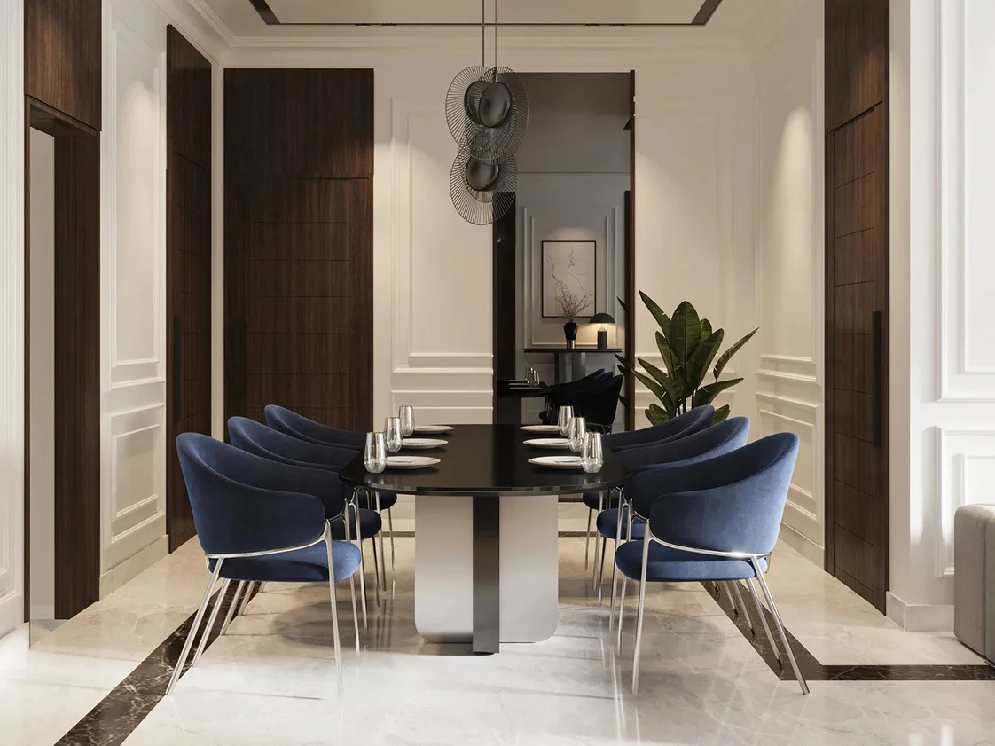 تحيط بها ستة كراسي مبطنة بتنجيد أزرق داكن، توفر مقاعد واسعة ودعامة مريحة للظهر. الأرجل معدنية لامعة بخطوط مستقيمة تعزز الطابع العصري، مع توزيع متوازن للكراسي حول الطاولة، مما يمنح انسجامًا بصريًا وسهولة في الحركة والجلوس.
