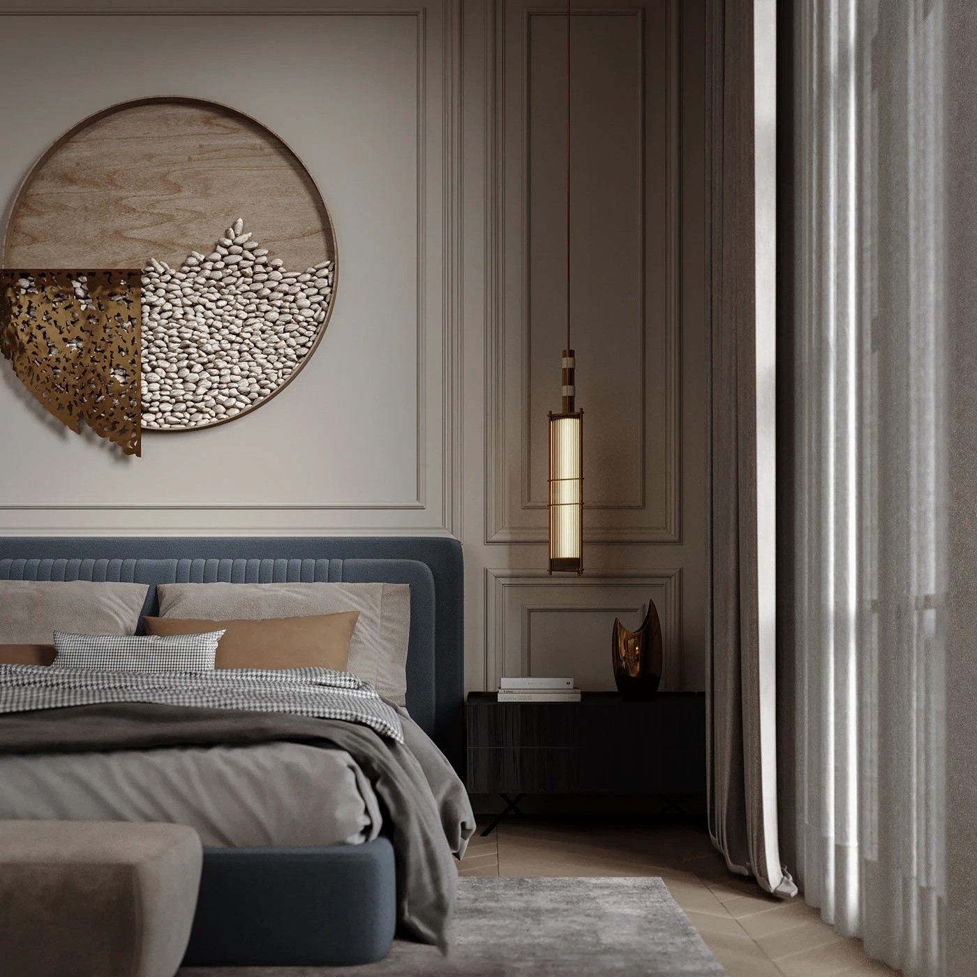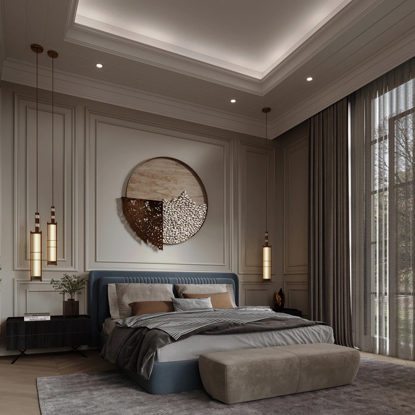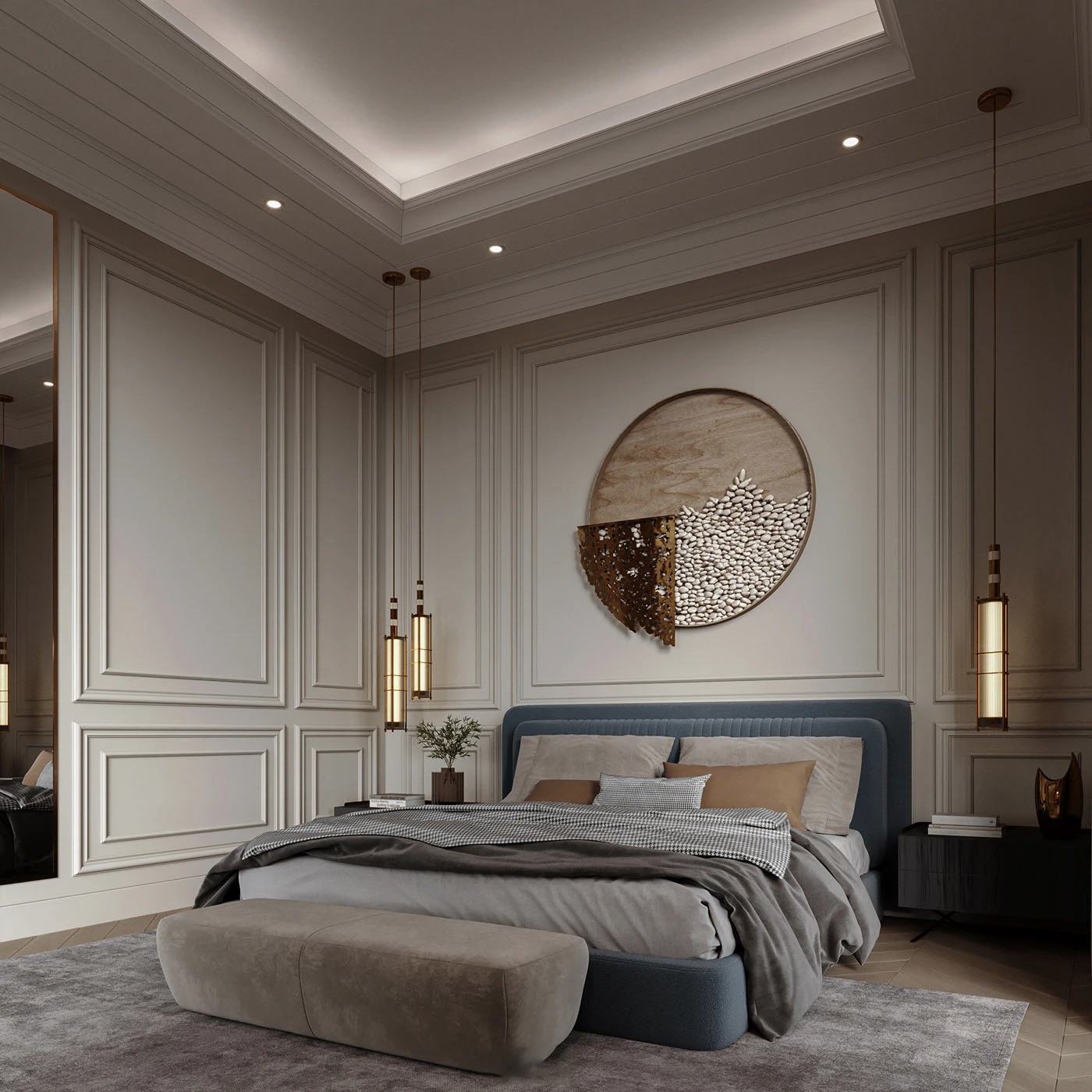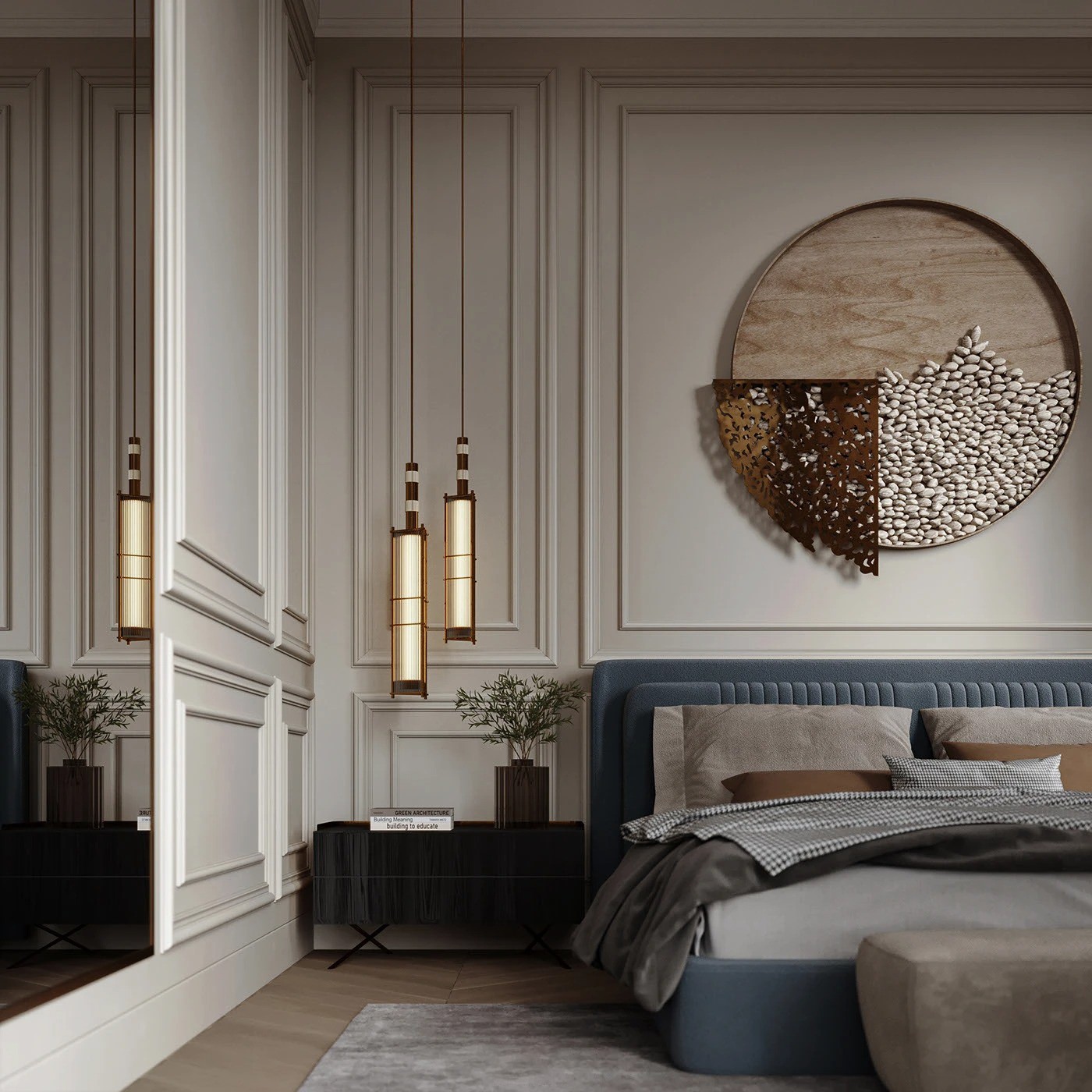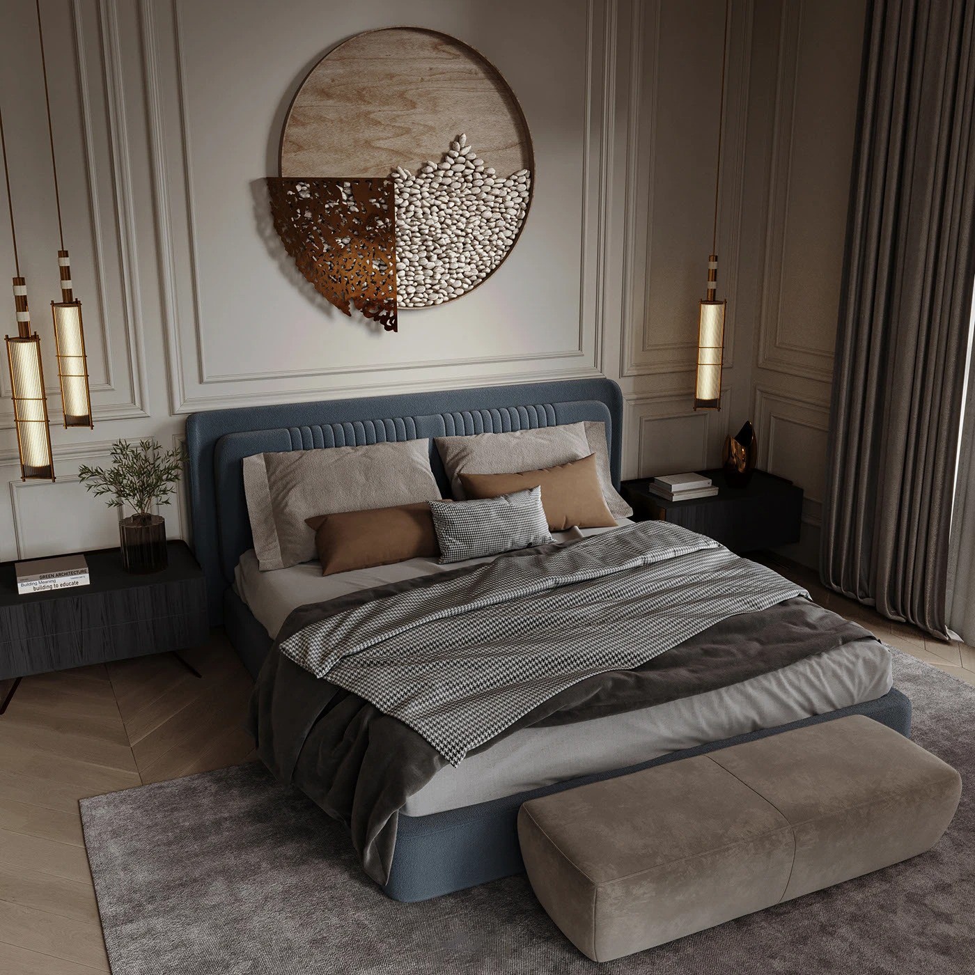 على جانبي السرير، كومودان باللون الأسود والرمادي بتصميم هندسي بسيط، يحتوي كل منهما على سطح علوي مستوٍ ودرجين مدمجين بدون مقابض ظاهرة، ما يوفر وظيفة عملية مع لمسة من الفخامة والأناقة دون تعقيد.