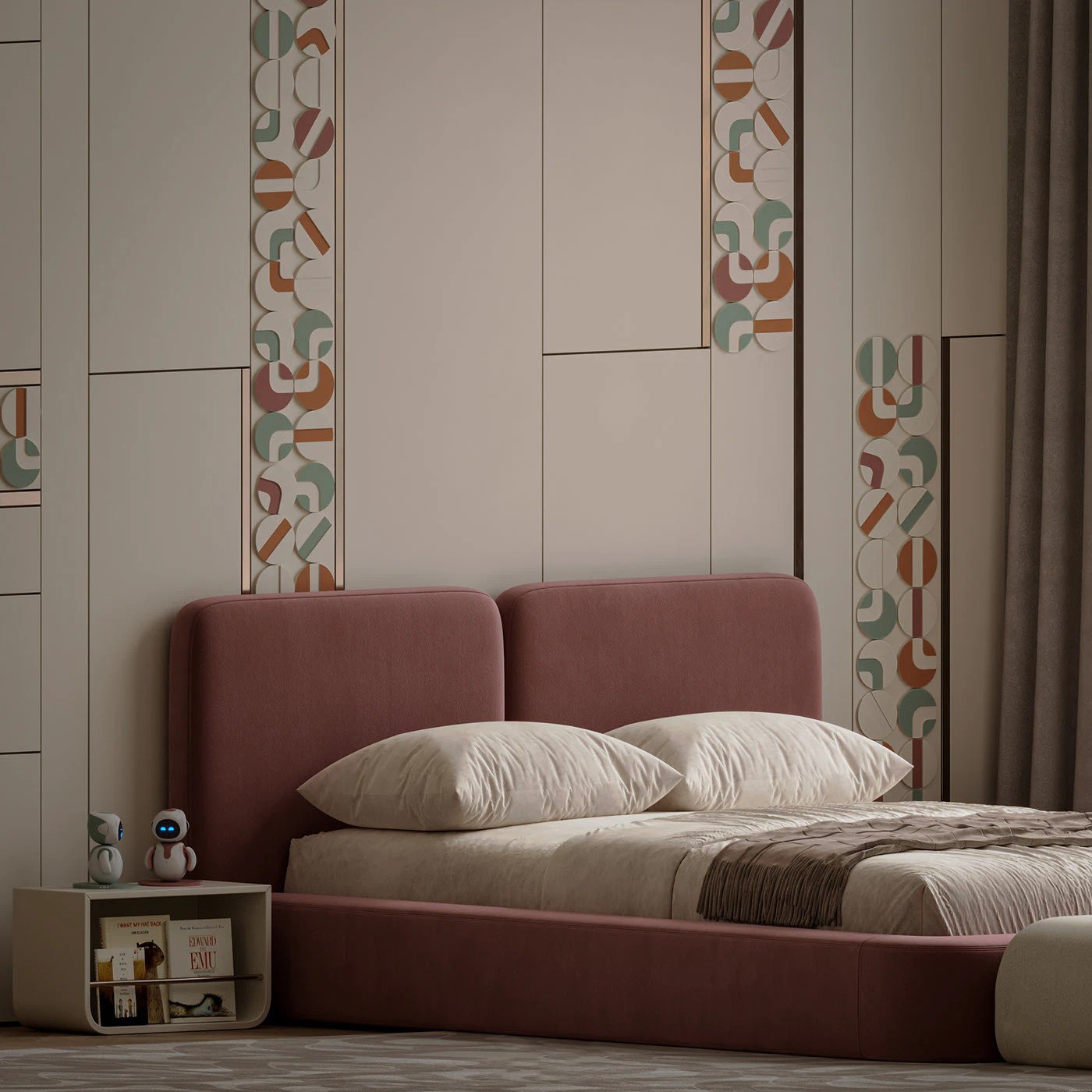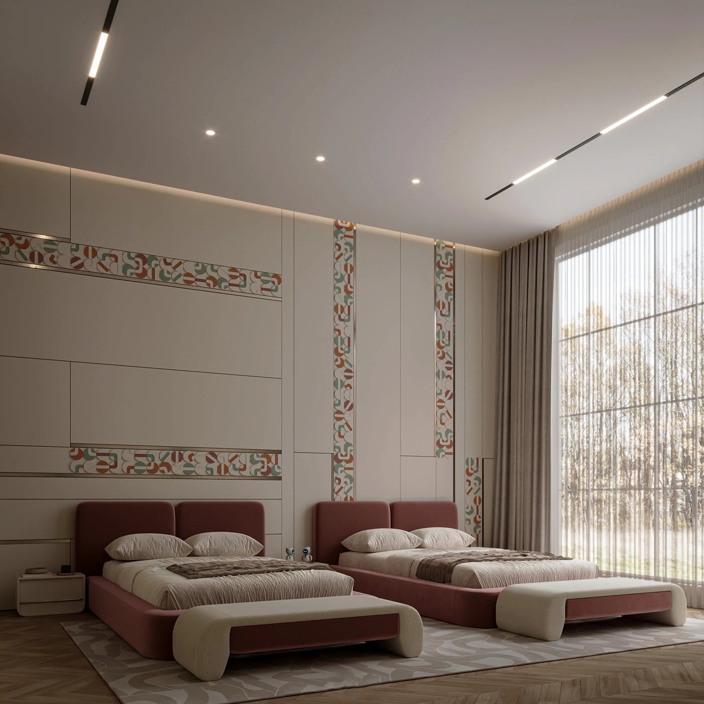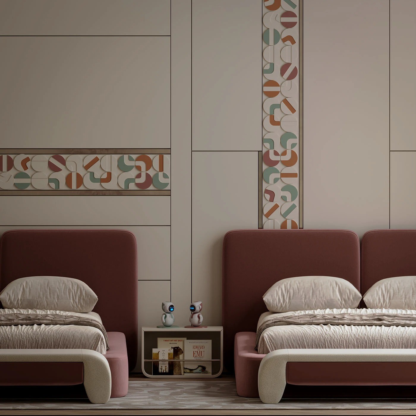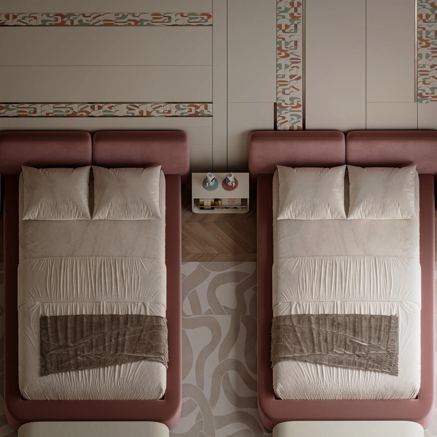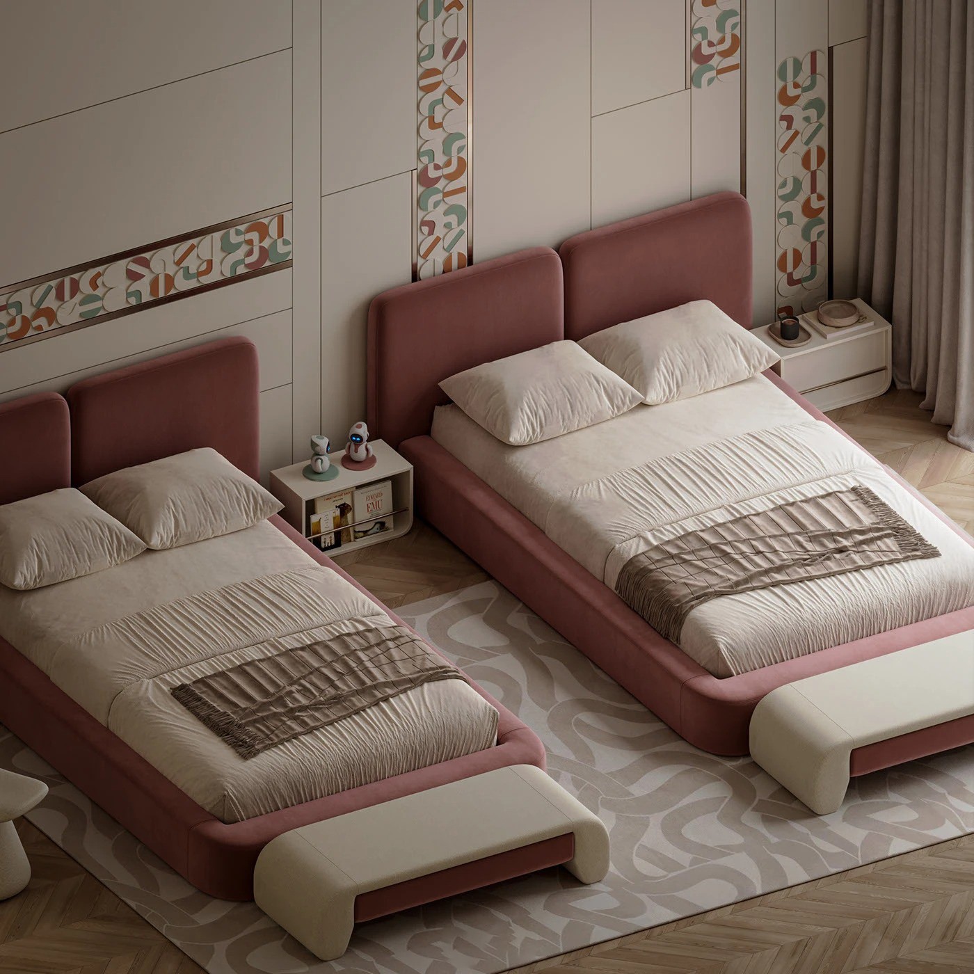 يتميز السريران المتطابقان بإطار منخفض منجد بالكامل باللون الوردي الهادئ، مع لوح خلفي مستطيل مبطن ناعم الحواف. التنجيد الكامل والخطوط الانسيابية يمنحان السريرين طابعًا عصريًا مريحًا مع لمسة أنثوية أنيقة.
