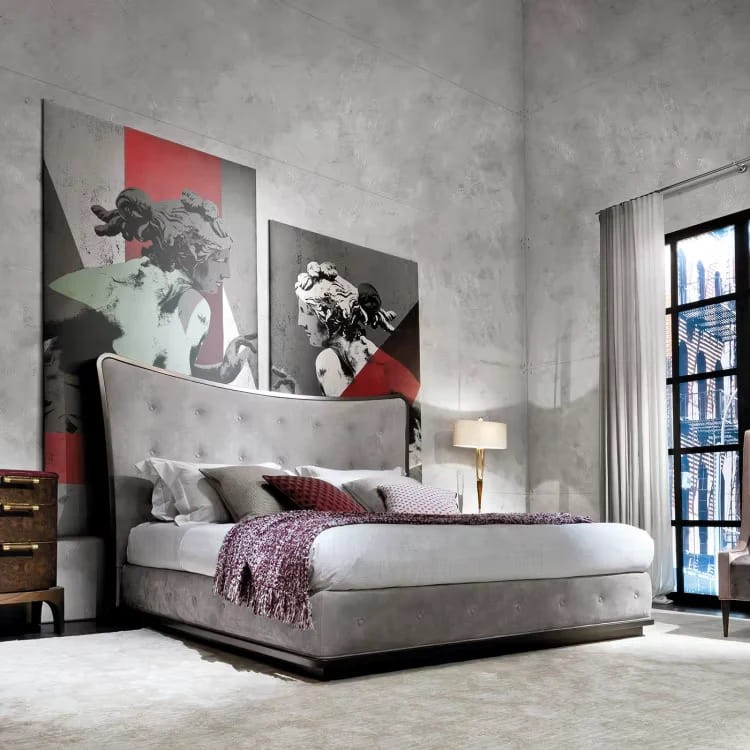 كما يتضمن كومودان متماثلان باللون الأبيض مع لمسات ذهبية، يحتوي كل منهما على سطح علوي مستوٍ ومساحة تخزين مغلقة. تصميمهما المستطيل والخطوط النظيفة يعكس الطابع العصري للغرفة ويوفر تنوعًا بصريًا متوازنًا.