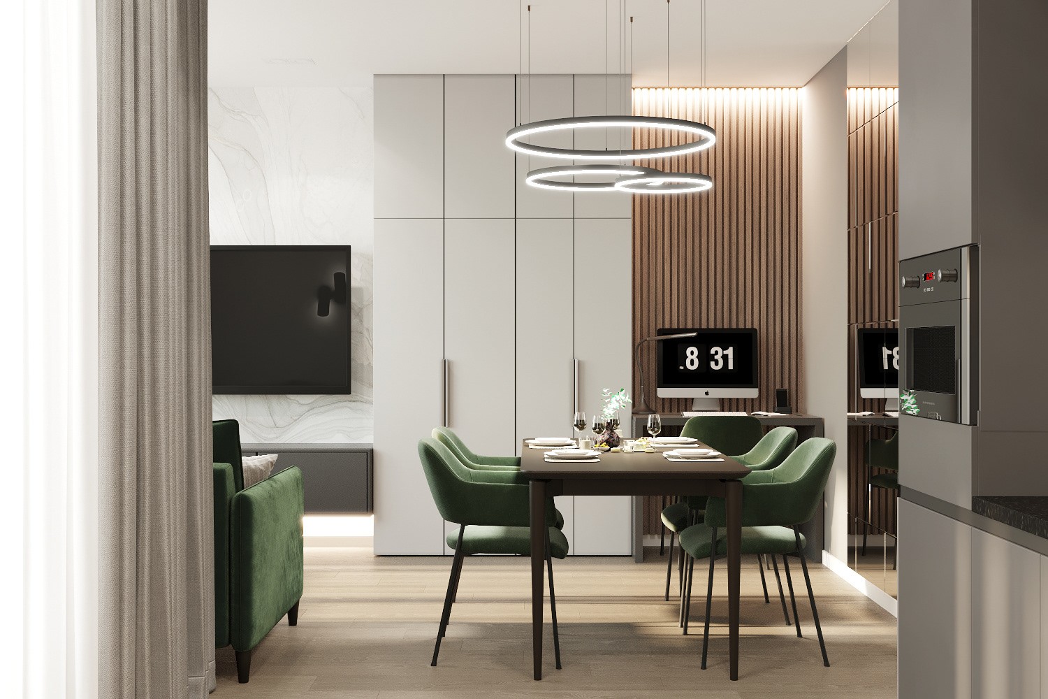 تضم الغرفة ترابيزة طعام بيضاوية الشكل تأتي بسطح رخامي أبيض لامع مزود بعروق رمادية طبيعية، ما يمنحها مظهرًا فاخرًا وعصريًا. تستند الترابيزة إلى قاعدة أسطوانية داكنة بملمس بارز تضيف لمسة فنية مميزة تعزز جمال التصميم.