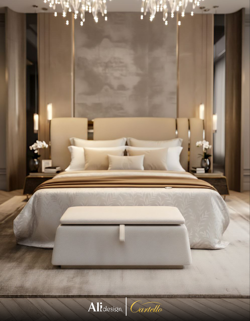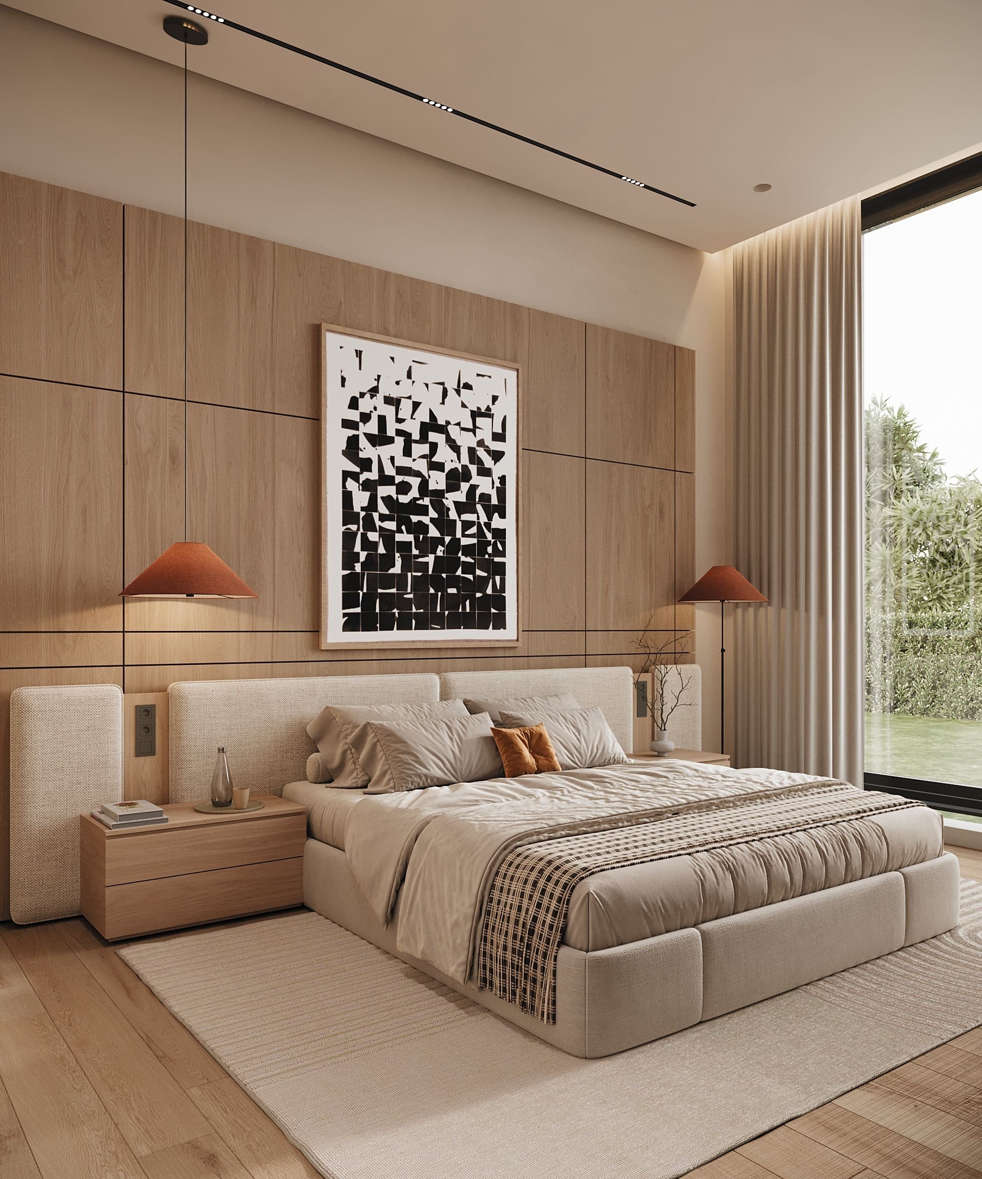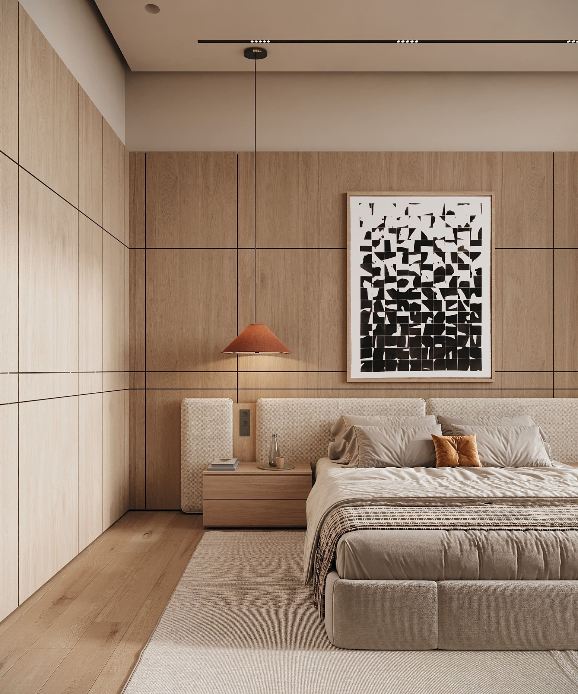 يأتي السرير بتصميم عصري يجمع بين الراحة والجاذبية البصرية، مع قاعدة مبطنة بالكامل بقماش بيج هادئ تضفي مظهرًا ناعمًا ومنسجمًا. يتميز بلوح خلفي عريض ومبطن بنفس القماش مع لمسات خشبية أنيقة تعزز الطابع العصري وتضفي لمسة دفء على التصميم.
