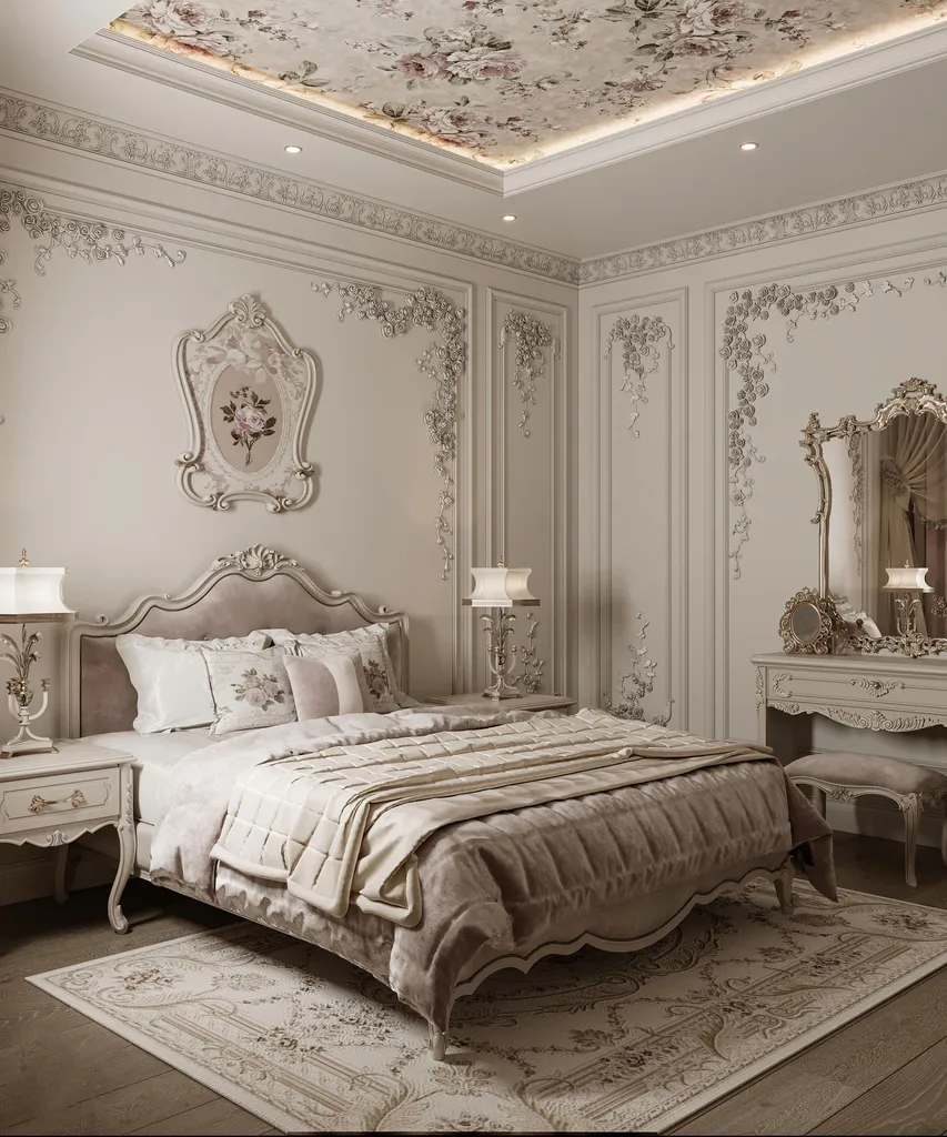 يتميز هذا السرير بتصميم كلاسيكي فاخر، مع إطار خشبي مصقول باللون الكريمي يمنحه حضورًا ملكيًا أنيقًا. لوح الرأس مرتفع ومنحني من الأعلى، ومغطى بتنجيد فاخر من القماش المخملي بلون وردي بيج، مزين بتفاصيل تخييط عميقة على شكل أزرار غائرة تضفي لمسة فخامة راقية. يحيط بلوح الرأس إطار خشبي مزخرف بنقوش بارزة يعزز الطابع الكلاسيكي للغرفة. الأرجل قصيرة ومنحنية مصنوعة من الخشب بنفس لون الإطار، لتكمل الانسجام البصري للتصميم.