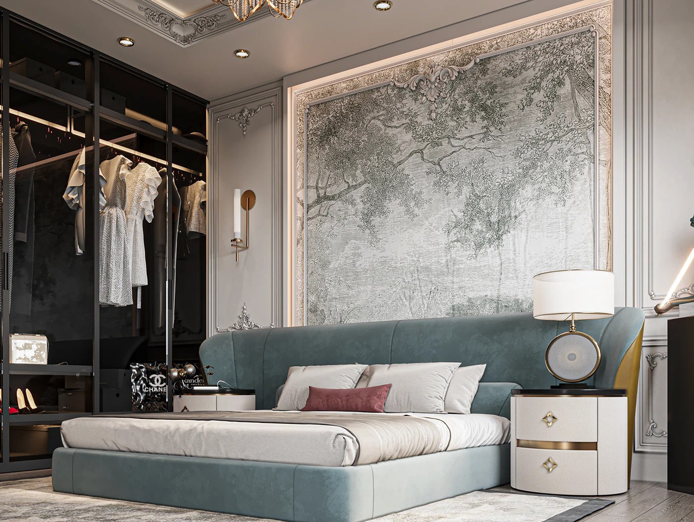 تأتي غرفة النوم بسرير عصري فاخر بإطار منخفض ولوح رأس مبطن بقماش أزرق هادئ، مع خطوط أفقية دقيقة تضفي توازنًا وراحة بصرية.