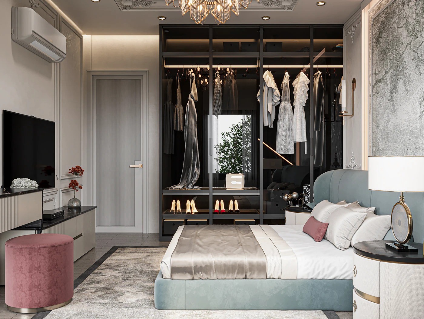 الدولاب المدمج مزود بواجهات زجاجية شفافة تكشف عن رفوف وأماكن لتعليق الملابس والإكسسوارات، مع تصميم بسيط وخطوط مستقيمة ولمسات معدنية أنيقة.