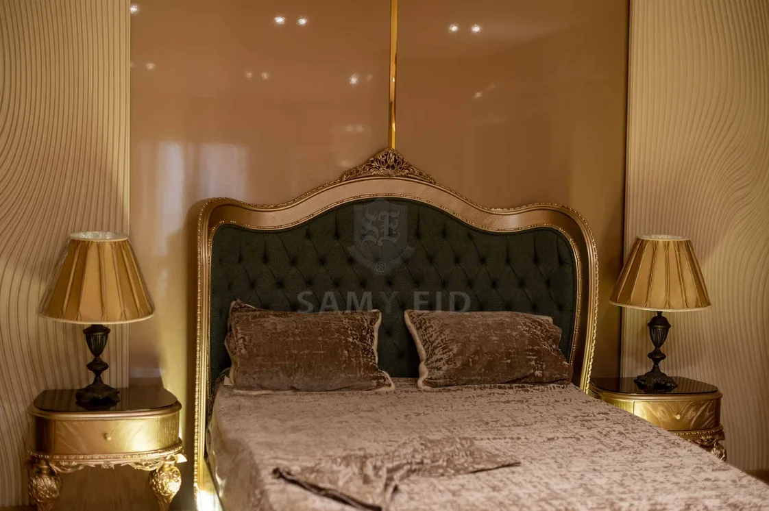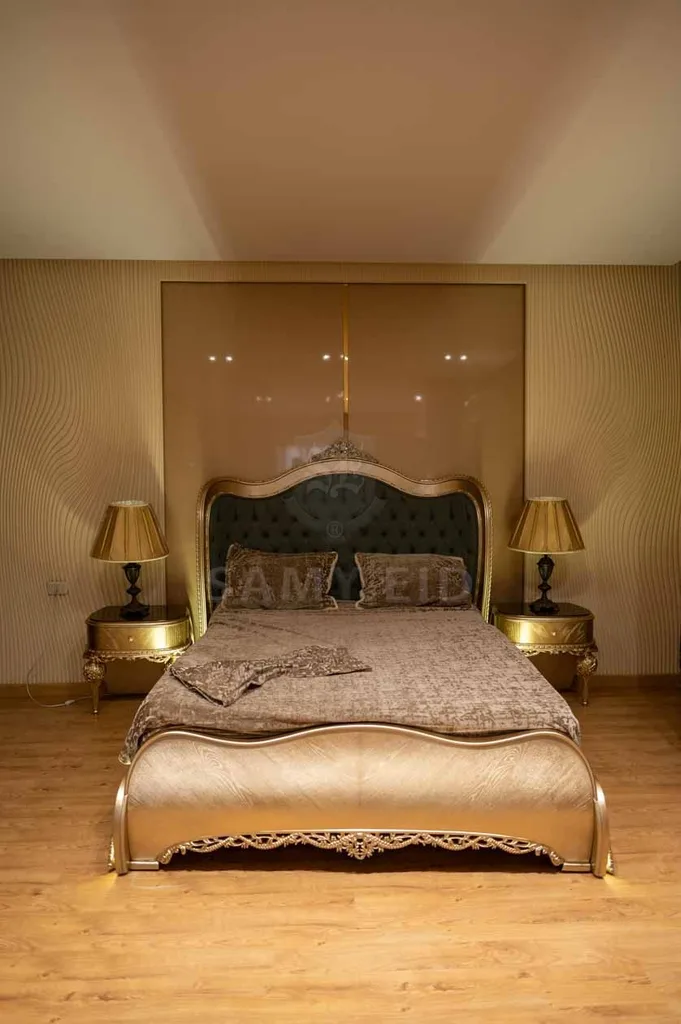 السرير: تصميم فاخر باللون الذهبي والأخضر، مع لوح أمامي وخلفي منحنٍ مزخرف بنقوش بارزة، وإطار خارجي مزين بتفاصيل منحوتة بدقة لإضفاء حضور مهيب وأناقة متكاملة.