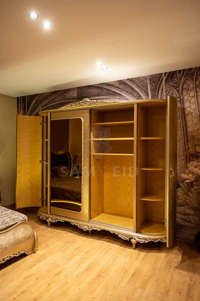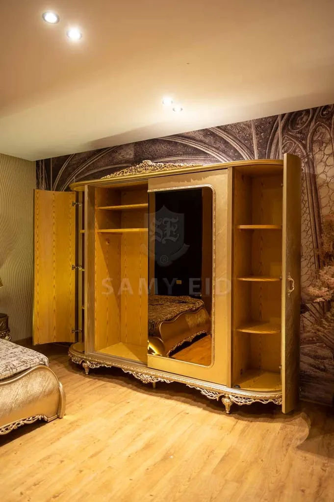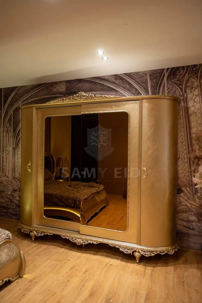 الدولاب الكبير: بلون ذهبي موحد وواجهة مزخرفة بنقوش فنية دقيقة، مزود بلوح مرآة عريض وزخارف منحنية على الحافة العلوية، وأرجل قصيرة مزخرفة تضيف لمسة فخامة.