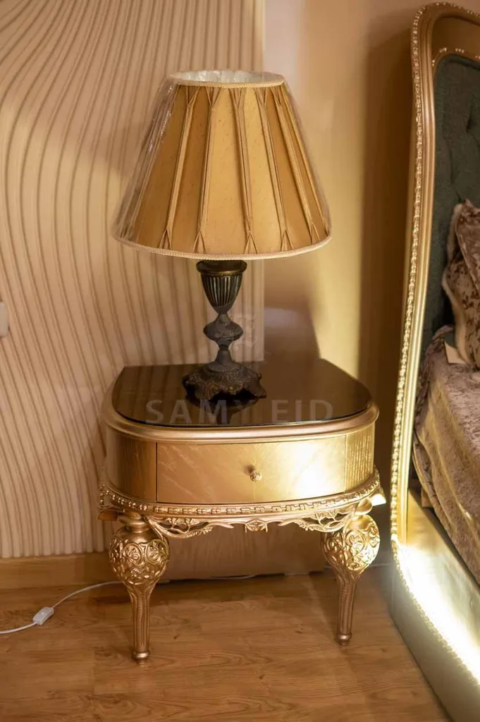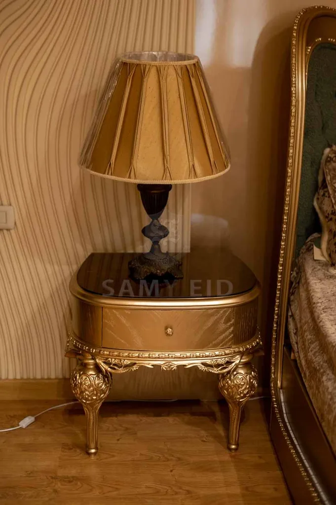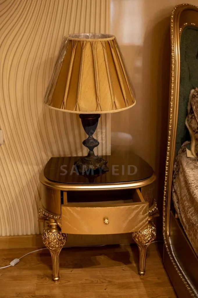 الكومود الجانبي: بقاعدة ذهبية مزخرفة وسطح زجاجي داكن لامع، مع درج واحد بمقبض دائري وأرجل منحوتة بزخارف نباتية متناغمة مع باقي التصميم.