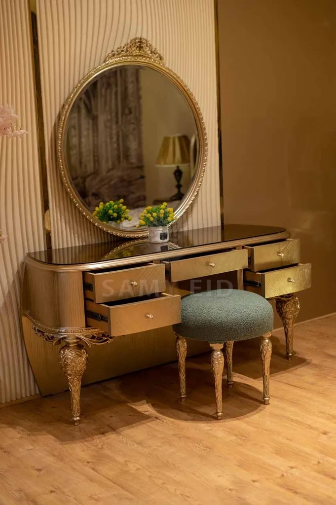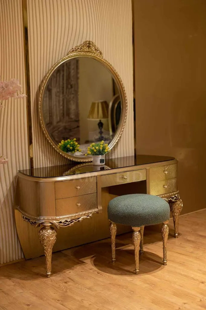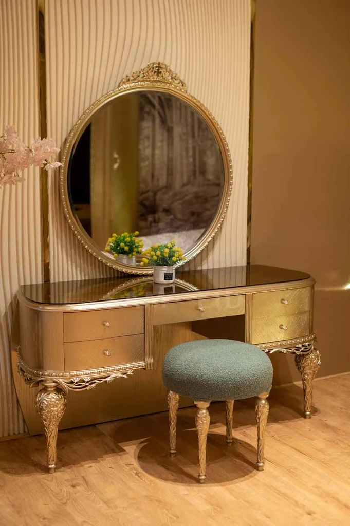 التسريحة: لون ذهبي لامع مع نقوش بارزة على الحواف والأرجل، تحتوي على خمسة أدراج بمقابض معدنية صغيرة، وتعلوها مرآة دائرية كبيرة بإطار مزخرف.