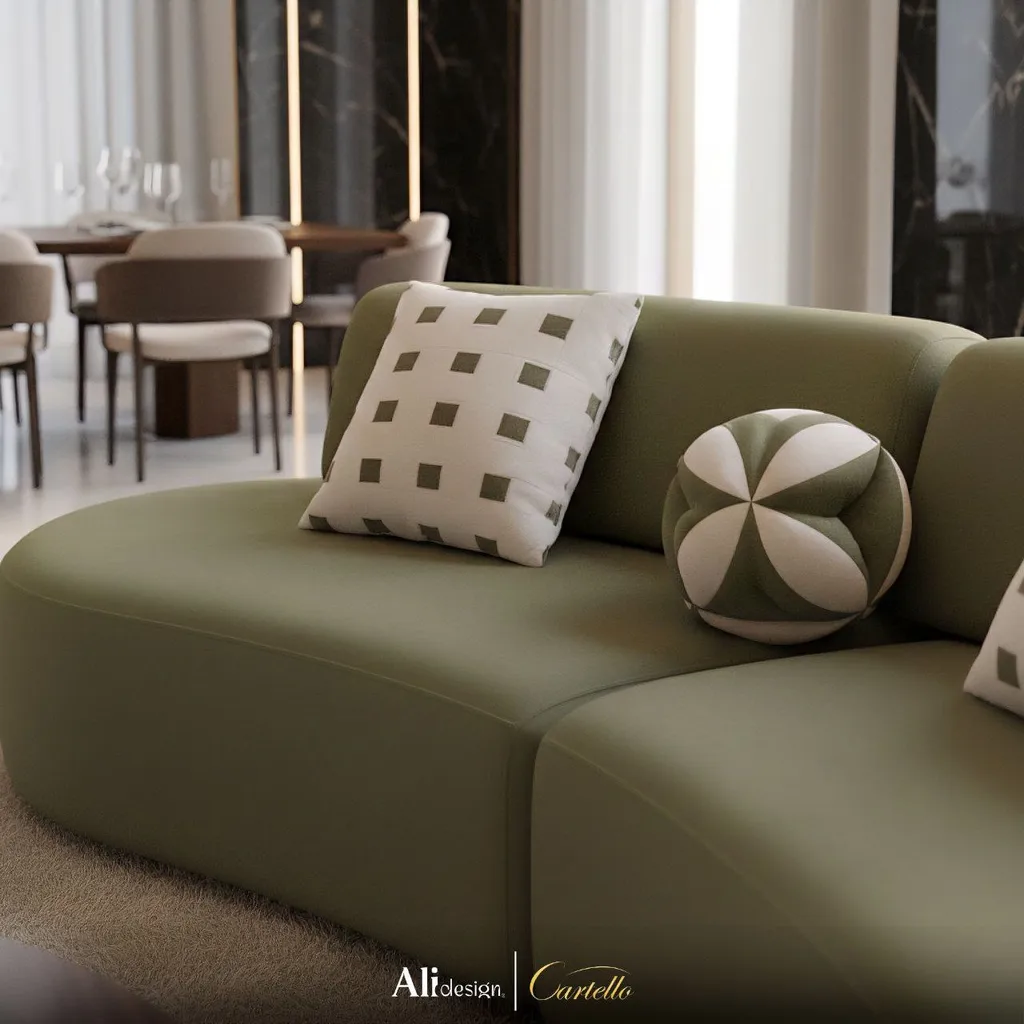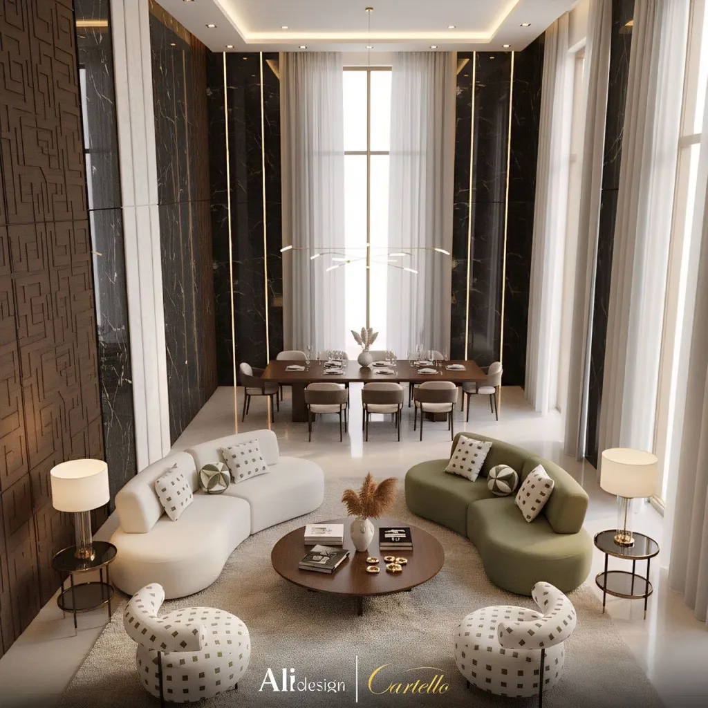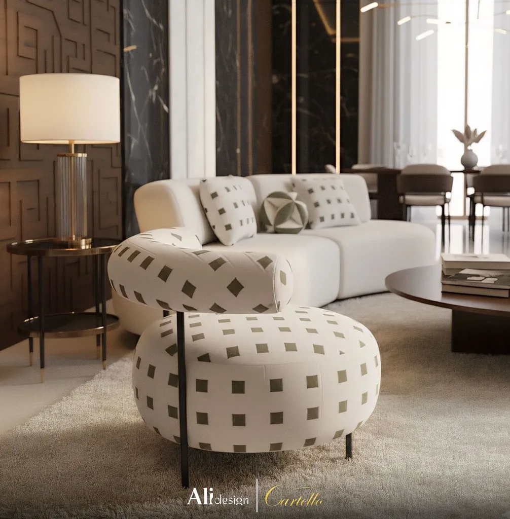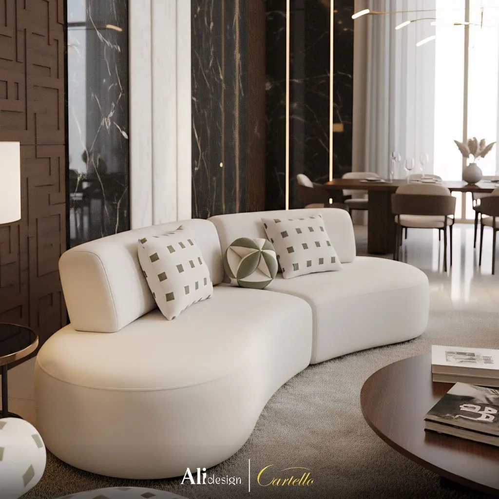 استمتعي بتجربة معيشة مريحة وفاخرة مع غرفة معيشة مودرن تجمع بين الأناقة والعملية. تضم الغرفة كنبة دائرية كبيرة بتصميم مميز يضيف لمسة فنية للمساحة، بالإضافة إلى كنبة وسط بمقعدين لتحقيق توازن مثالي بين الشكل والراحة.