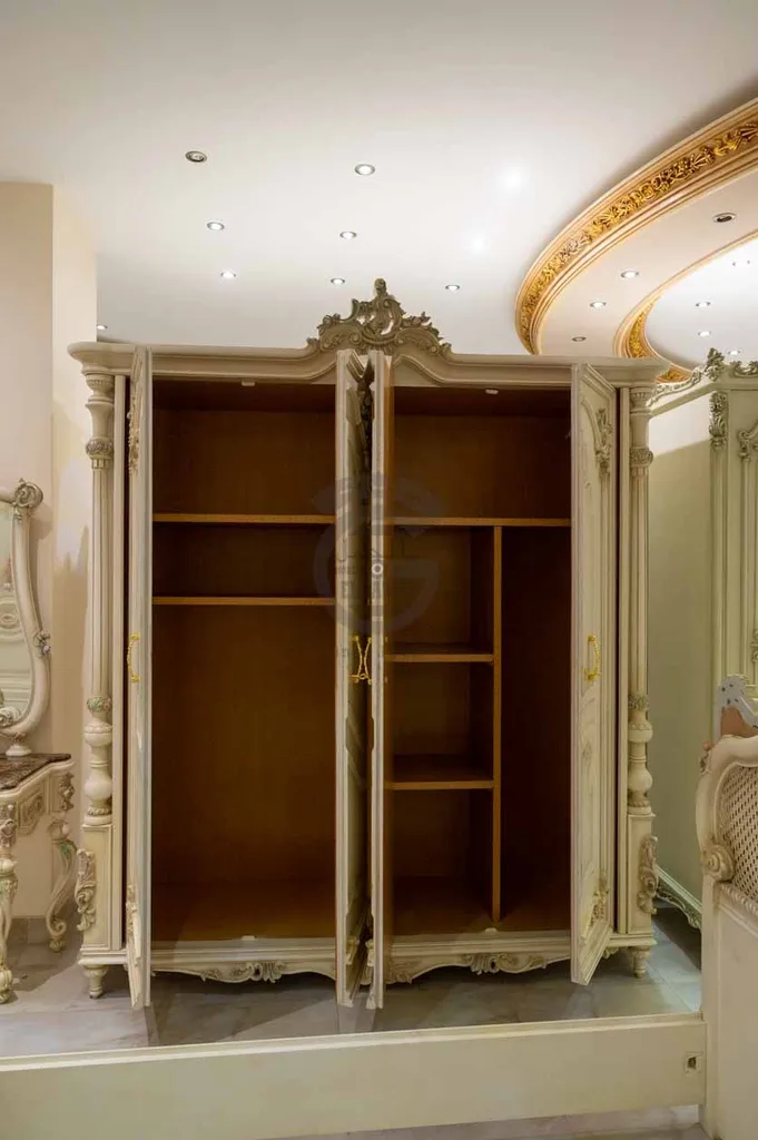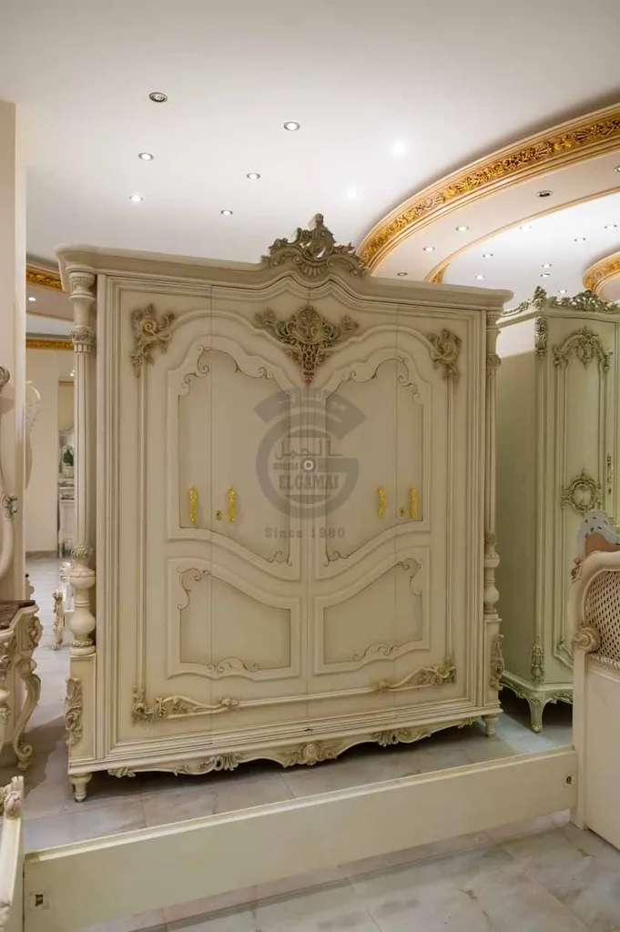 دولاب خشب كلاسيكي بأبواب مزخرفة، مقابض بلون ذهبي، وتاج علوي منحوت بدقة تعكس الحرفية العالية.