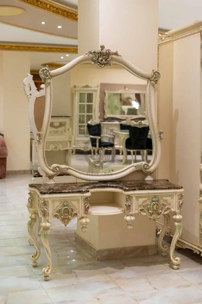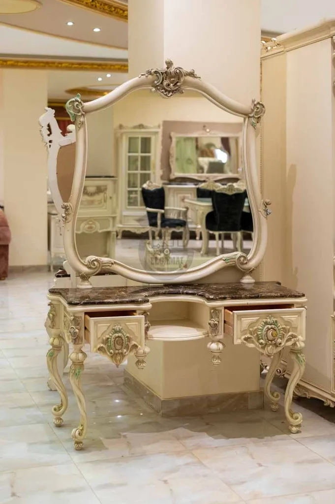 تسريحة خشب مع مرآة كبيرة، سطح رخامي وأدراج مزخرفة، متناسقة مع باقي قطع الأثاث.