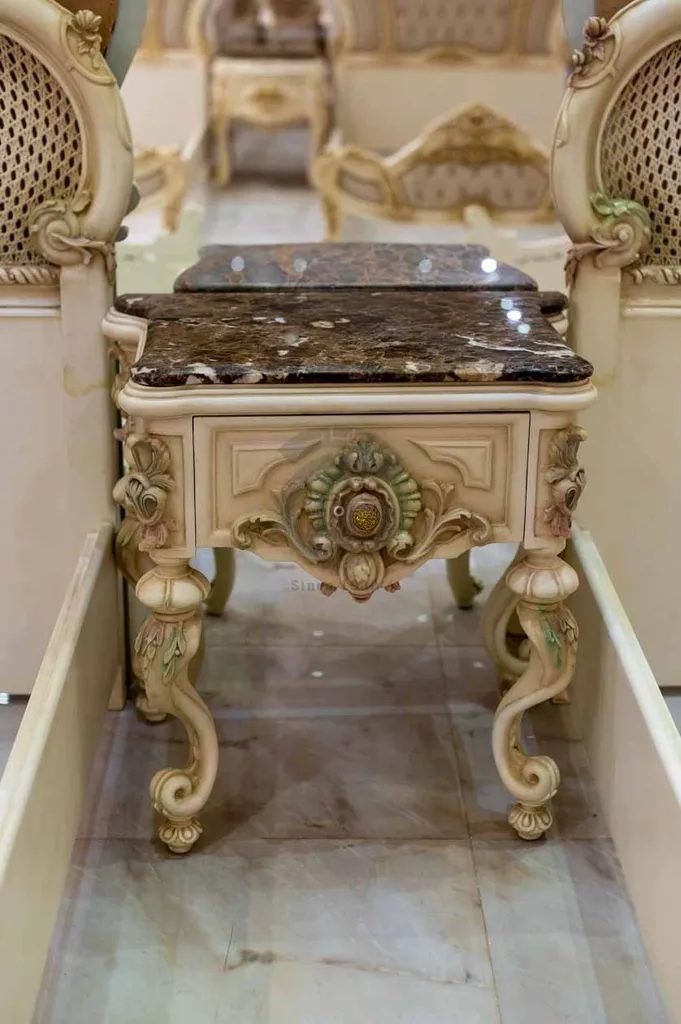 كومود رخامي فاخر مع سطح رخام بني بعروق بيضاء، درج مزخرف وأرجل حلزونية منحوتة تضيف فخامة.
