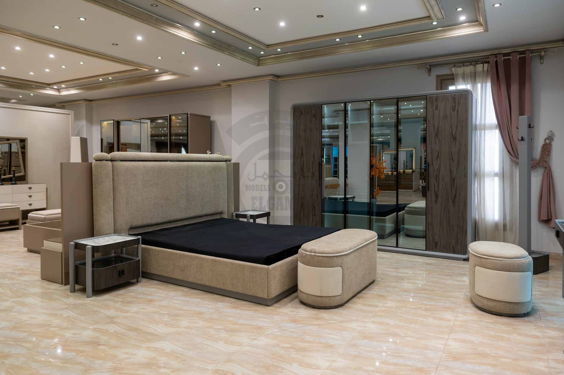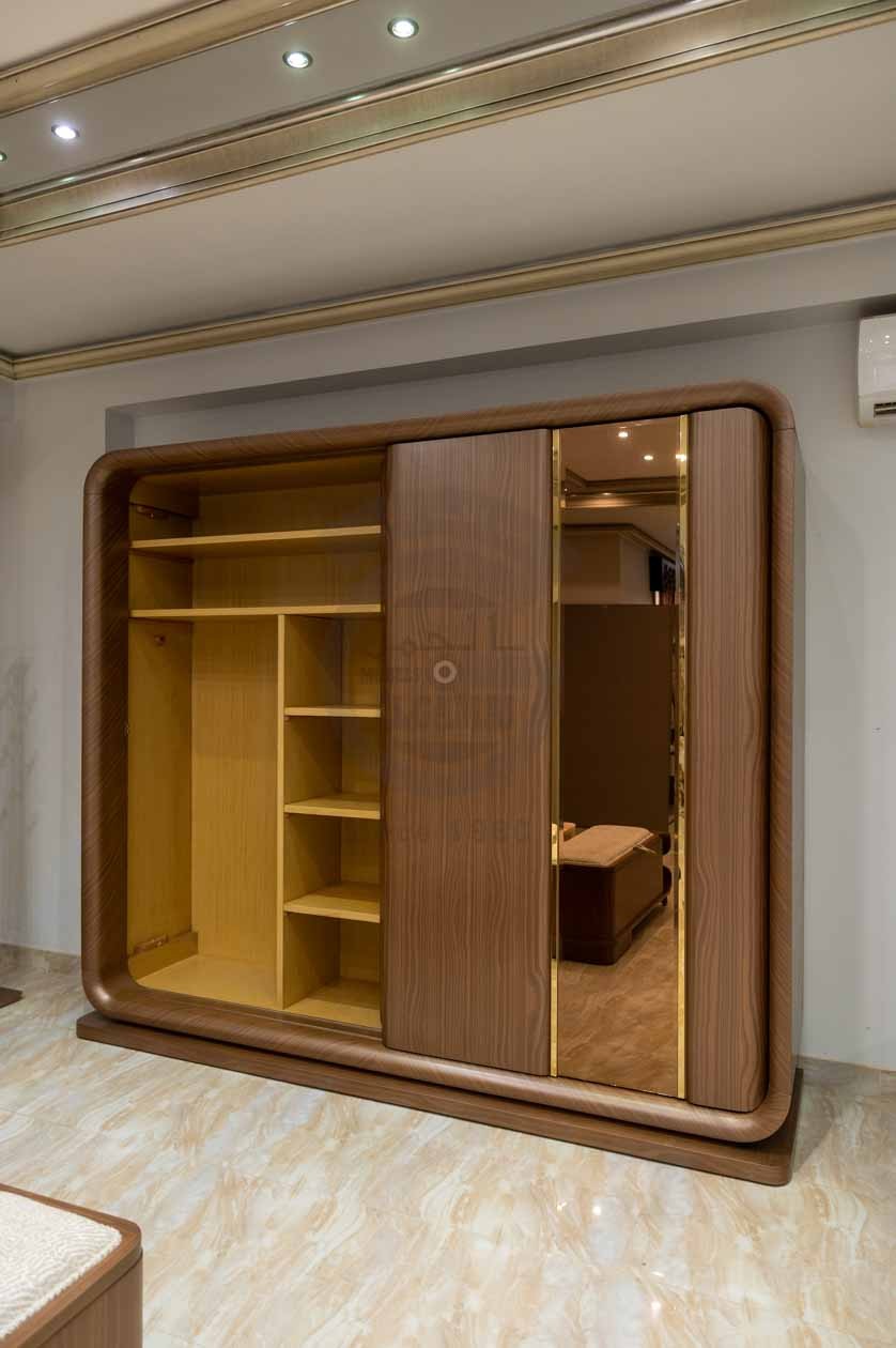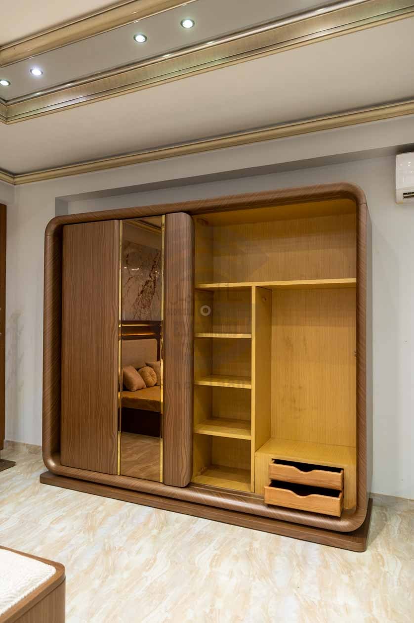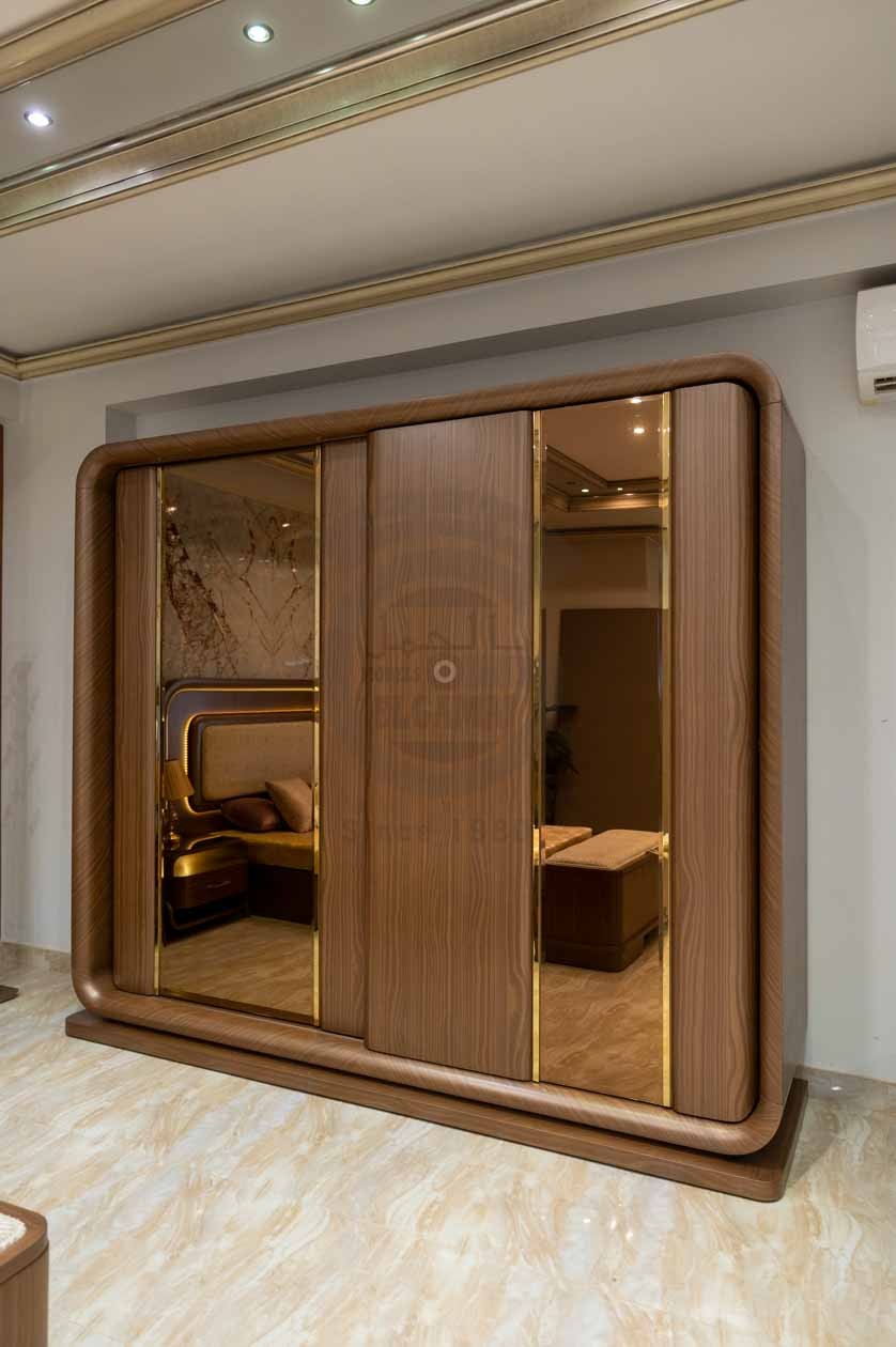 الدولاب: تصميم منزلق عملي بواجهة مرايا كبيرة لزيادة الإحساس بالاتساع، مع إطارات ذهبية فاخرة متناغمة مع باقي القطع.