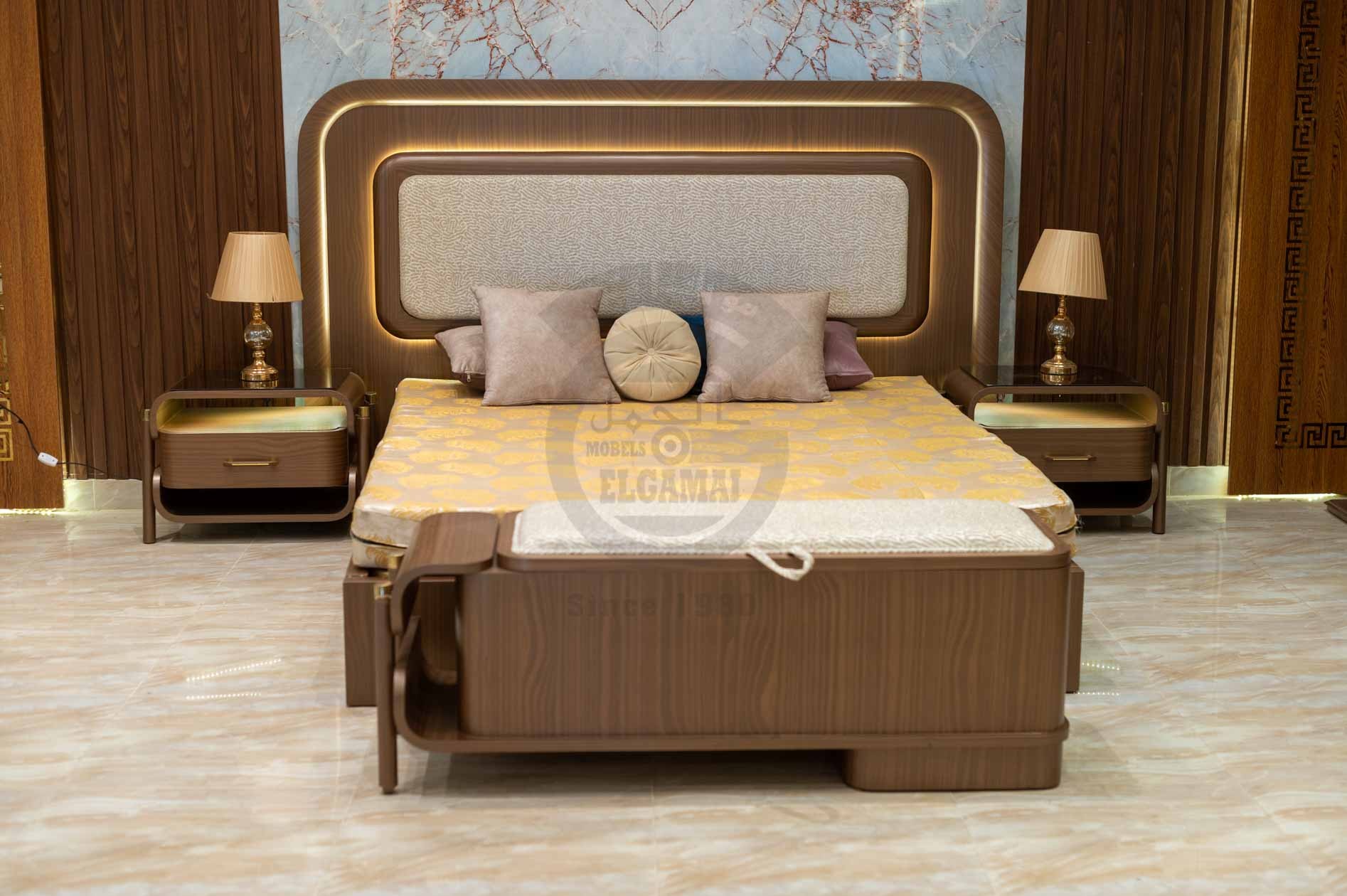 السرير: مصنوع من الخشب مع رأسية مبطنة بلون بيج، محاطة بإطار خشبي بني أنيق يحتوي على إضاءة LED مدمجة تضيف دفئًا وجاذبية للتصميم.