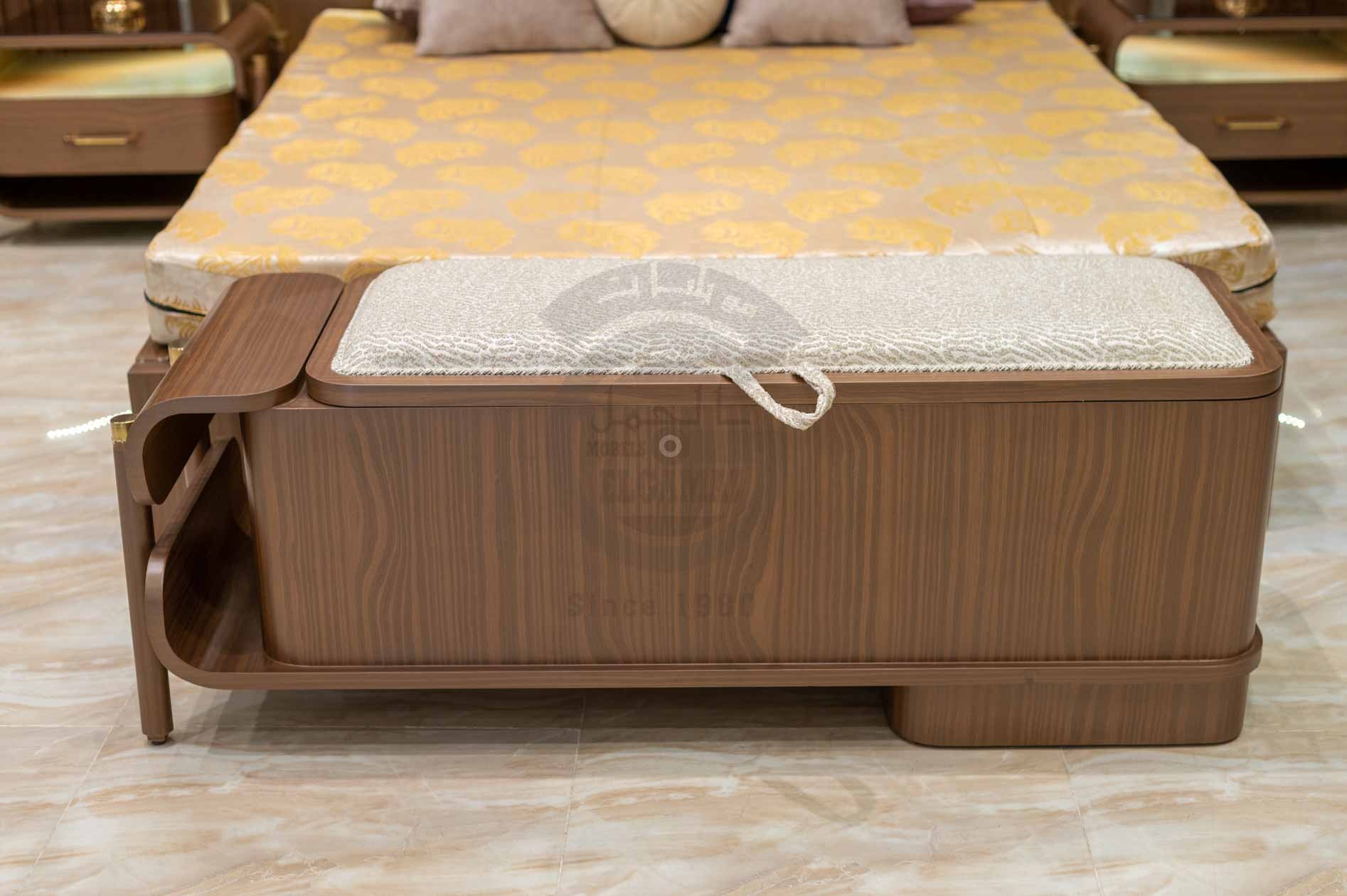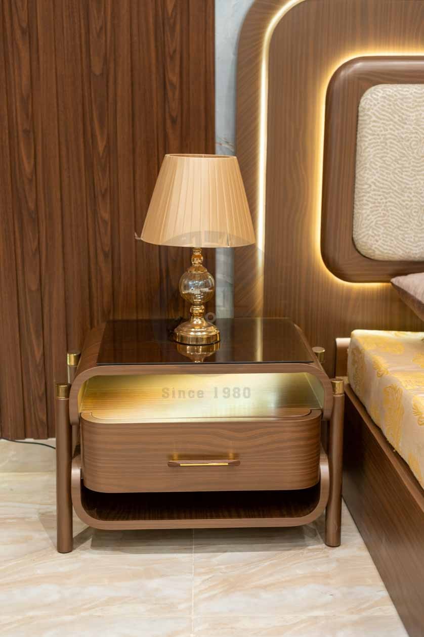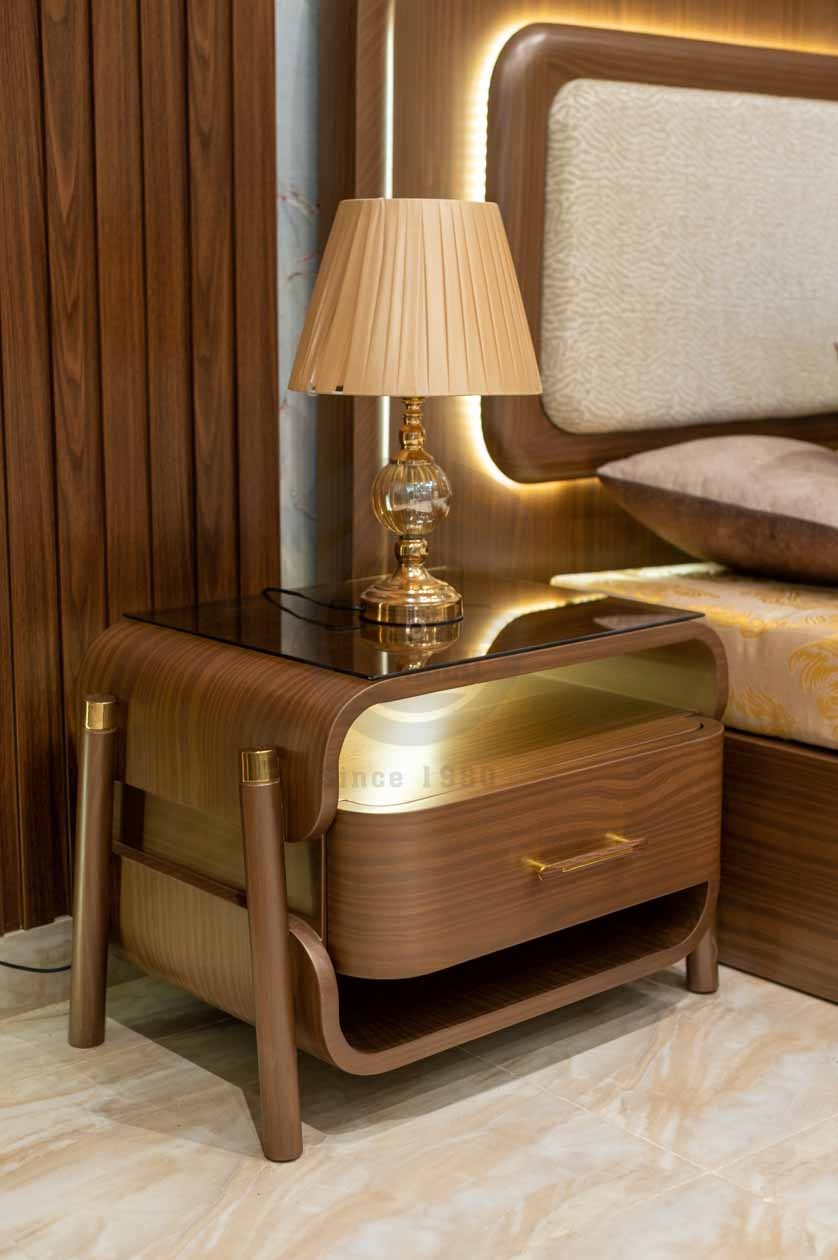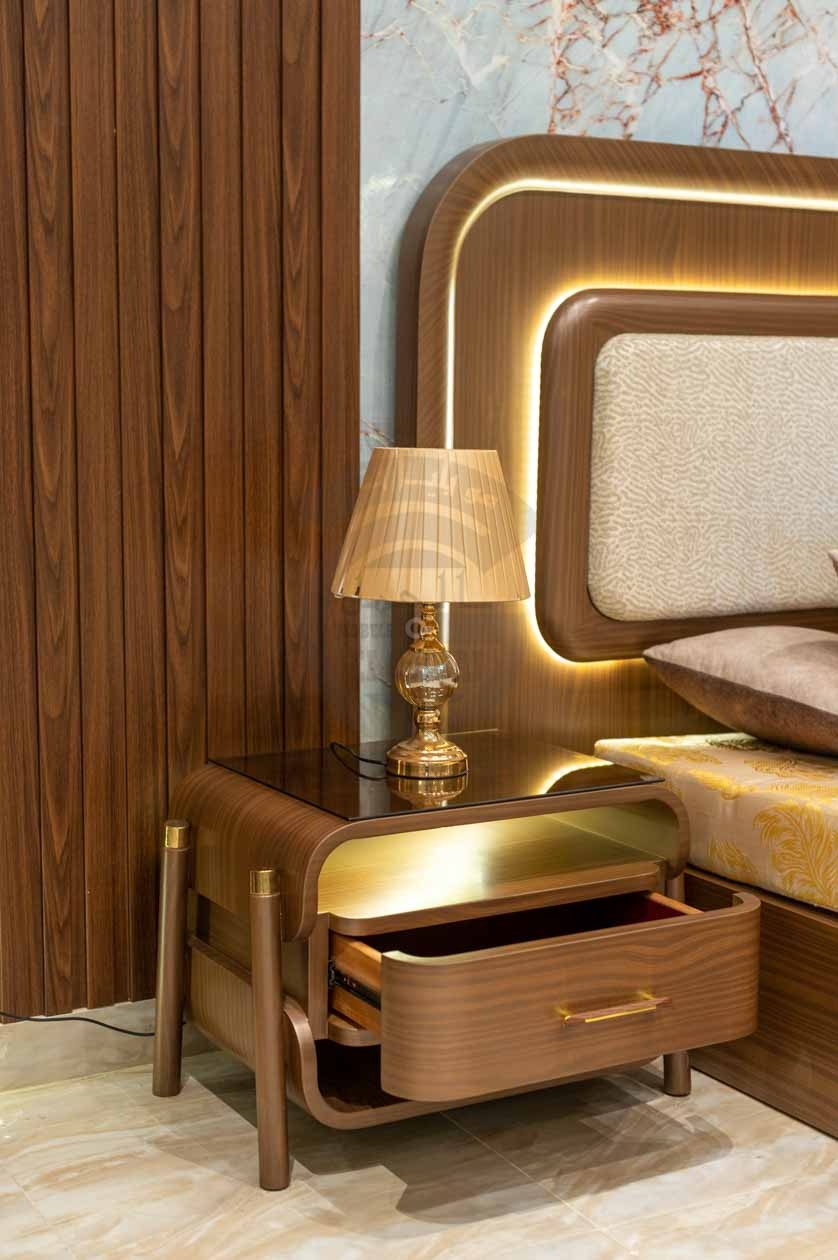 الكومود: قطعة خشبية أنيقة بدرج واحد بمقبض ذهبي بسيط، يعلوه رف مفتوح بإضاءة LED تضيف لمسة راقية.