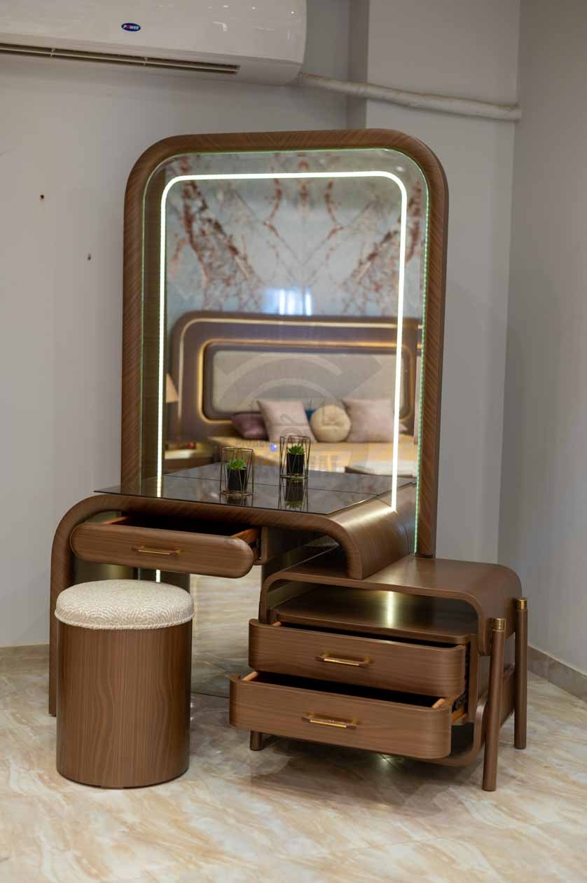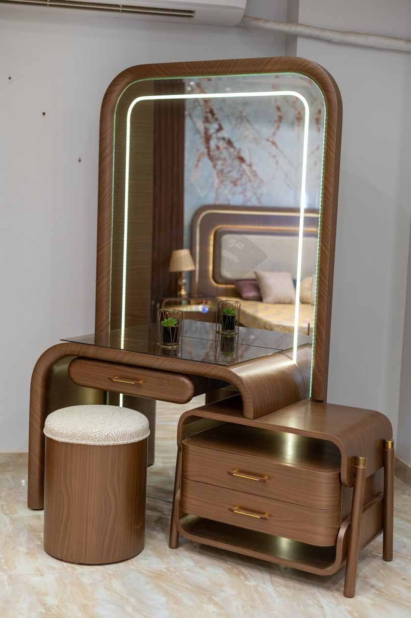 التسريحة: تصميم عصري مع مرآة كبيرة بإطار منحني وإضاءة LED مدمجة، درج واحد بمقبض ذهبي بسيط، ووحدة جانبية بدرجين ومساحة علوية خشبية.
