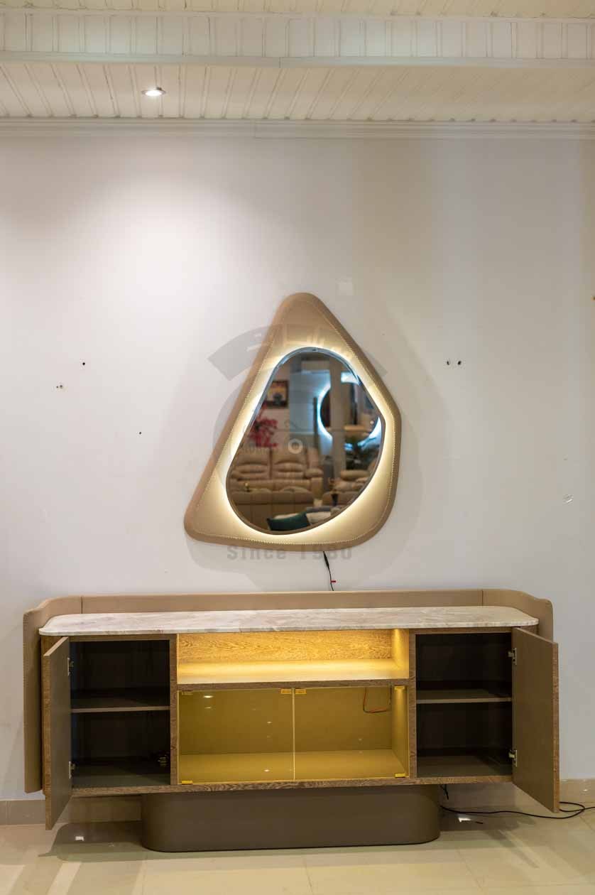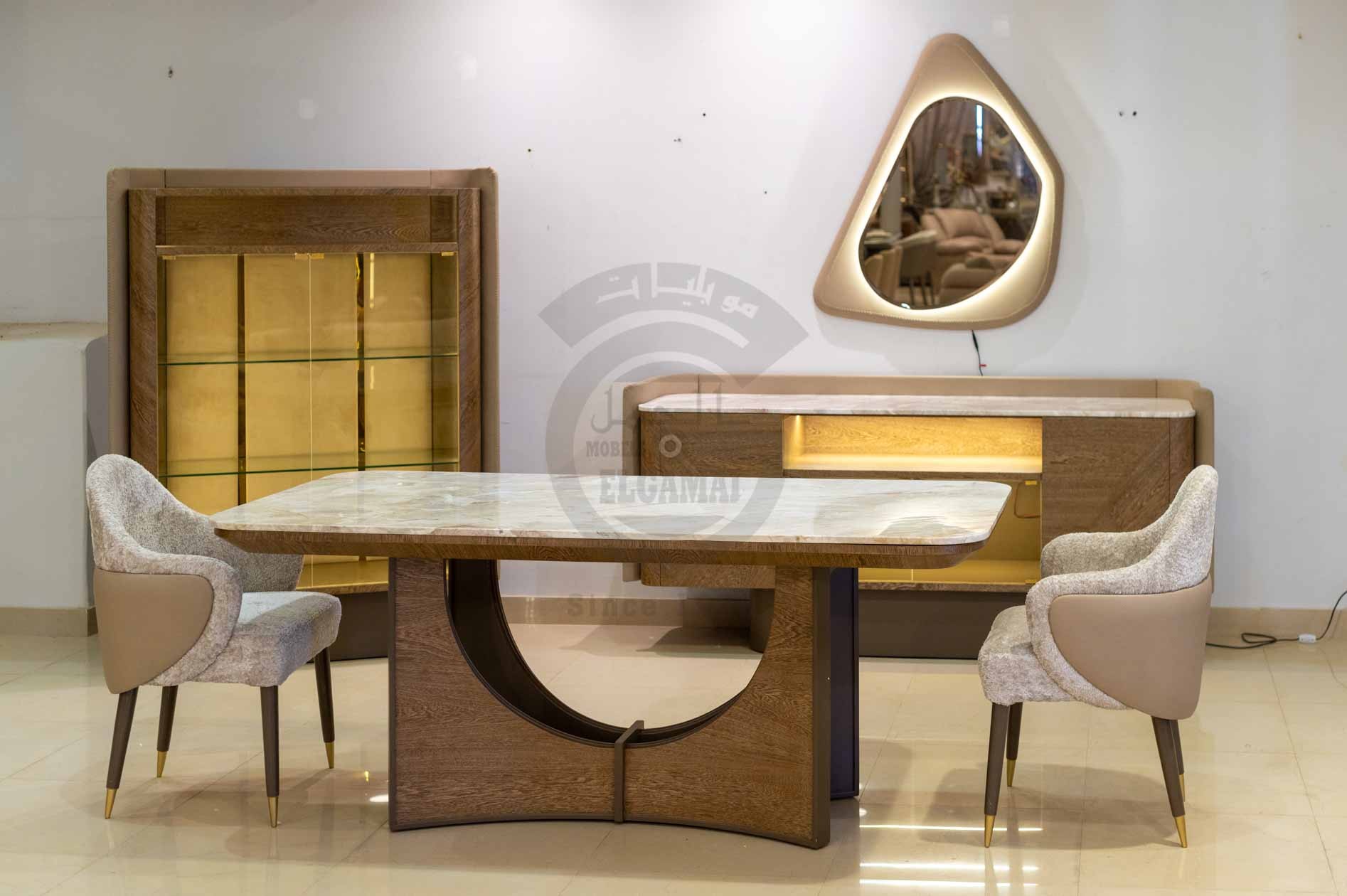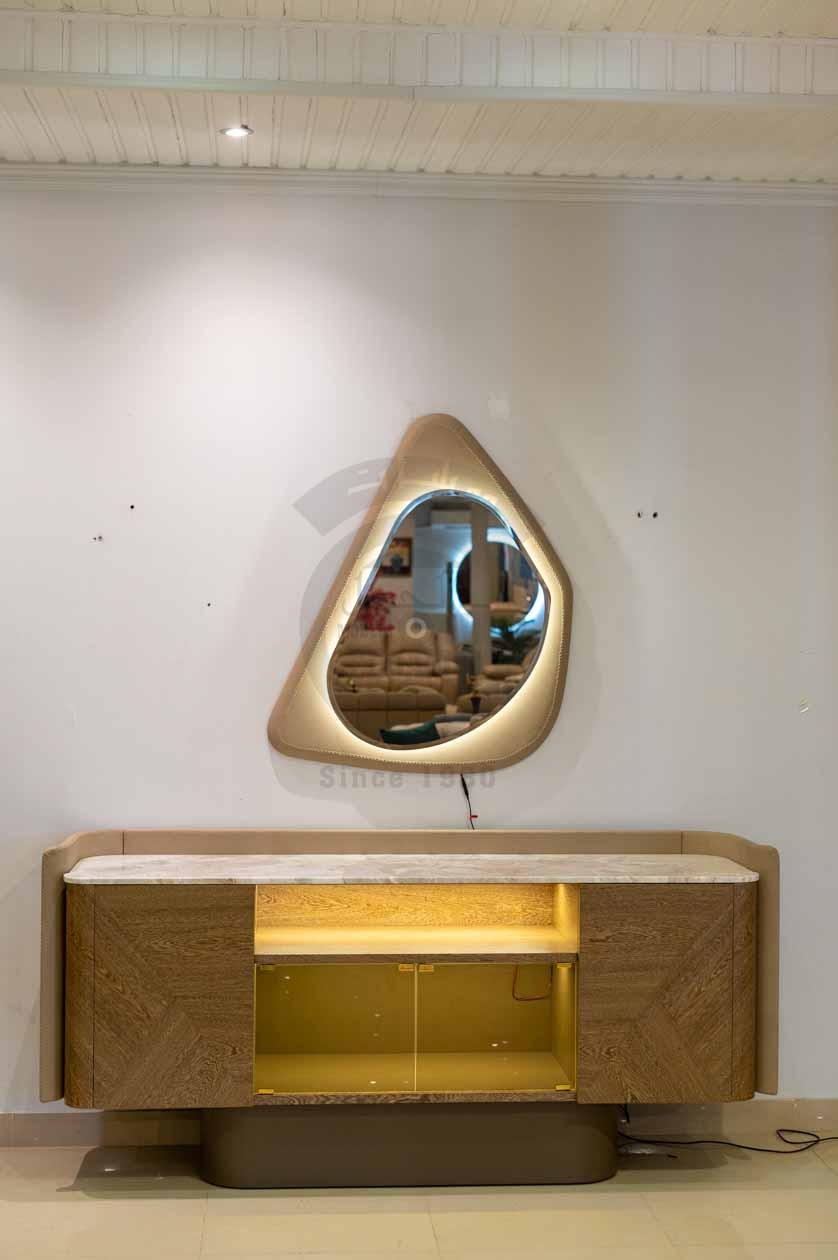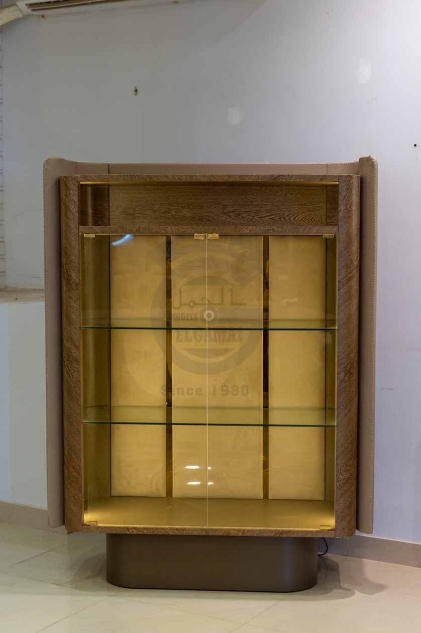 البوفيه يجمع بين الرخام والخشب بتصميم هندسي متقن، سطحه الرخامي الفاتح يضفي لمسة فاخرة، وأبوابه مزخرفة بنقوش هندسية دقيقة. يحتوي الجزء الأوسط على رف زجاجي مضاء وباب زجاجي يبرز كعنصر عرض أنيق ضمن التصميم العام.