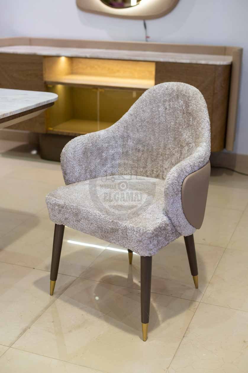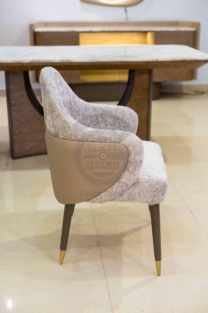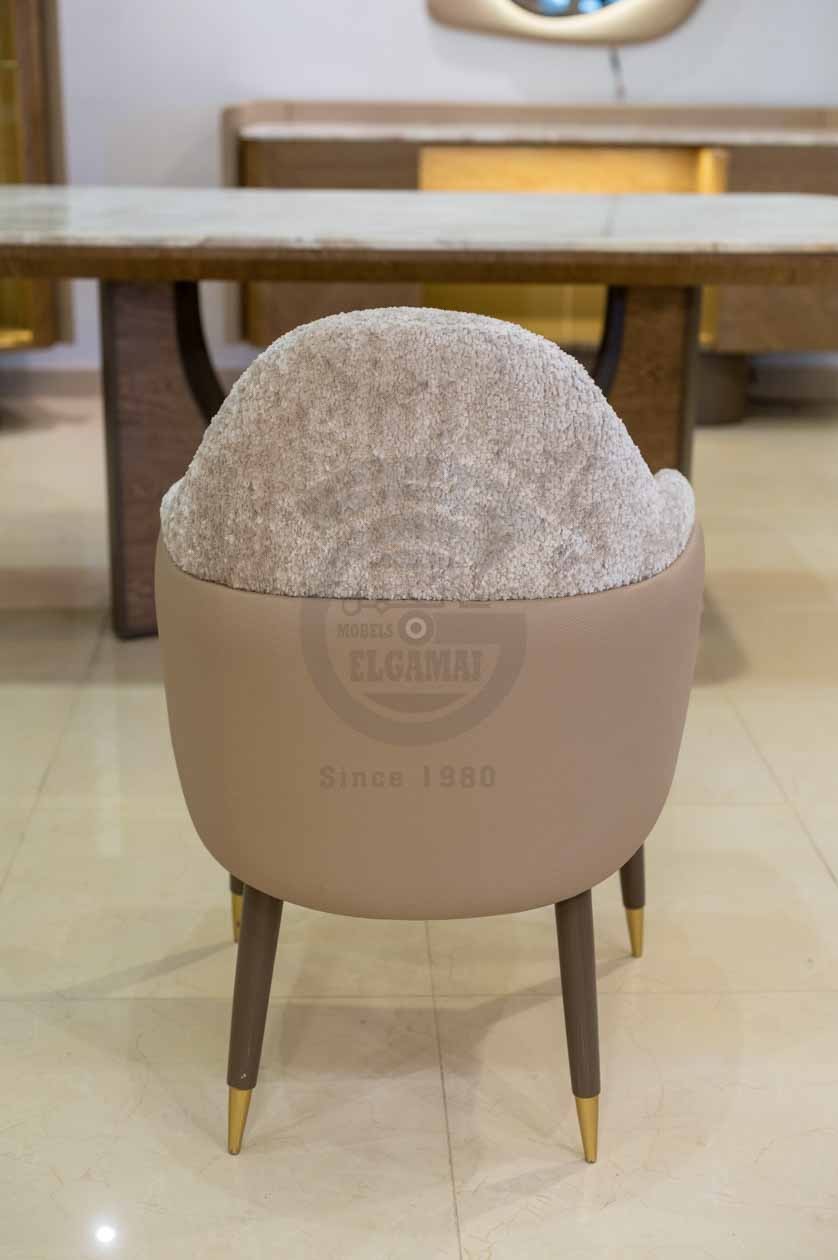 الكراسي المحيطة تأتي بتنجيد مزدوج يمنح تبايناً ناعماً وحضوراً فخماً. تصميم الظهر المنحني والمساند المدمجة للأذرع يوفران راحة وأناقة مثالية، بينما الأرجل القصيرة بلون بني مع نهايات ذهبية تضيف لمسة عصرية أنيقة للتكوين.