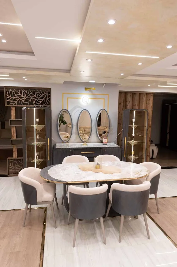 طقم سفرة أنيق يضم طاولة مستطيلة برخام فاخر، كراسي مريحة، بوفيه بتفاصيل ذهبية، مرايا ديكورية، وخزانات عرض زجاجية.