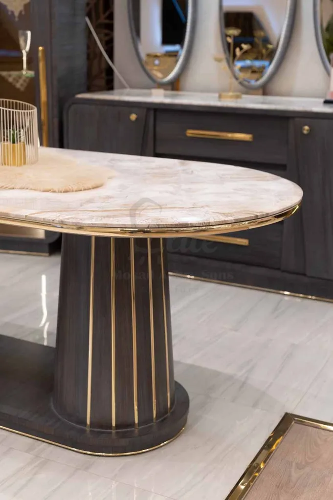 يجمع طقم السفرة هذا بين الفخامة والعملية بتصميم عصري متكامل. الطاولة مستطيلة ذات حواف مستديرة، وسطح من الرخام يمنحها لمسة راقية، بينما ترتكز على قاعدة خشبية بلون رمادي داكن بتصميم منحني أنيق يعزز الثبات والانسيابية.