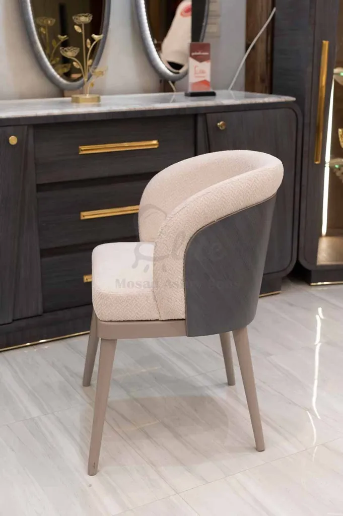 الكراسي تتميز بمزيج أنيق من الخشب الرمادي الداكن وتنجيد بيج فاتح، مع أرجل مائلة بلون رمادي فاتح لمزيد من التوازن والجاذبية، بالإضافة إلى مقاعد ومسند ظهر مبطنين لضمان الراحة أثناء الجلوس.