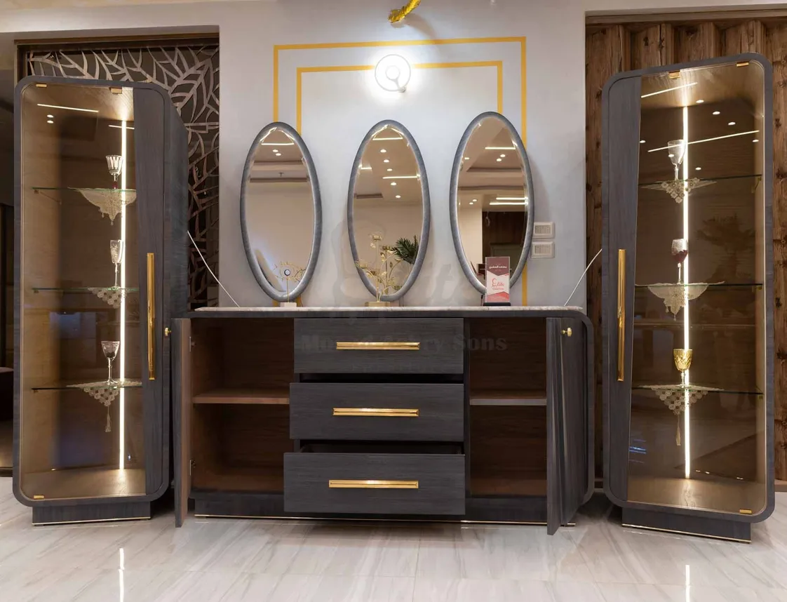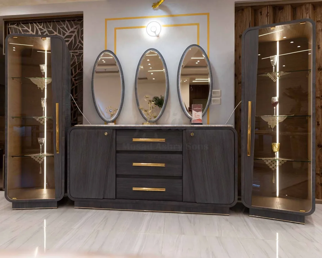 تكتمل المجموعة بثلاث مرايا بيضاوية بإطارات ذهبية أنيقة تضيف اتساعًا وبريقًا للمكان، إلى جانب خزانتي عرض جانبيتين بواجهات زجاجية شفافة وأرفف داخلية عملية، تتناغم مع التصميم العام عبر مقابض ذهبية متناسقة.