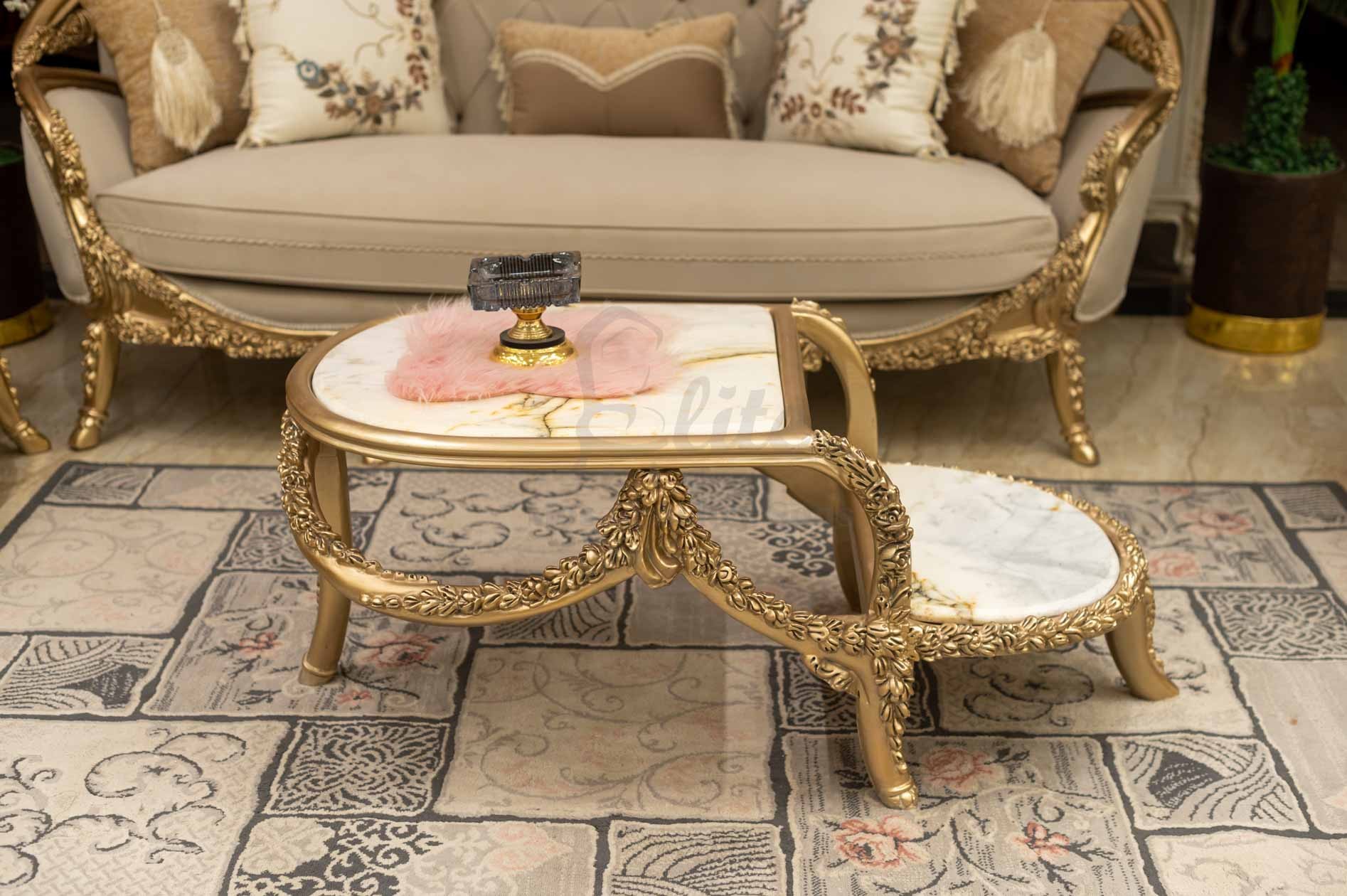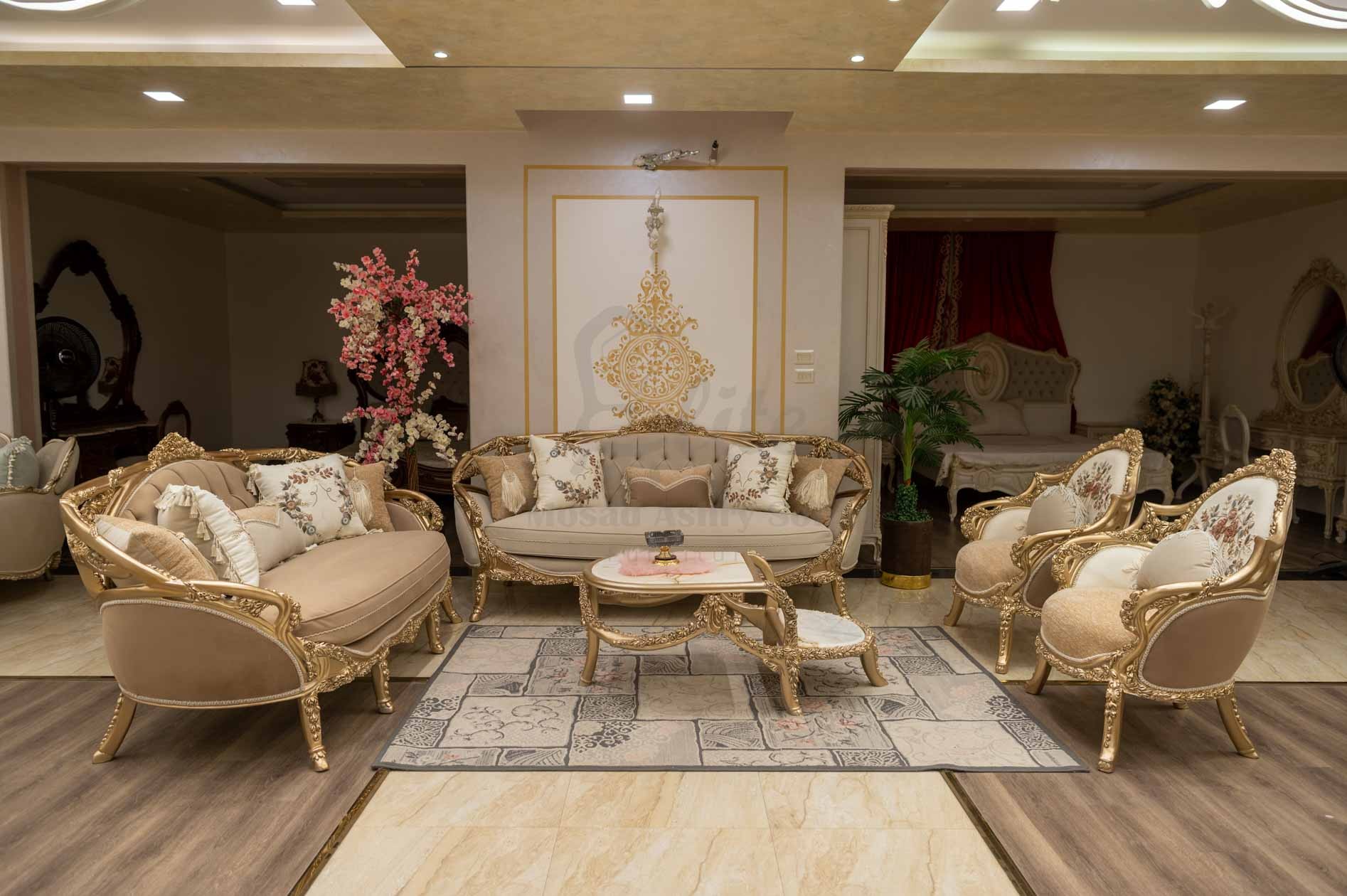 صالون نيو كلاسيك بتصميم فاخر يجمع بين الفخامة الكلاسيكية واللمسة العصرية الراقية. يتكوّن من كنبتين كبيرتين وفوتيهين بتصميم متناسق يعكس الأناقة والترف، مع ترابيزة قهوة أنيقة في المنتصف وشيفيزين مكملين للطقم بنفس التنجيد والتفاصيل الذهبية المنحوتة.